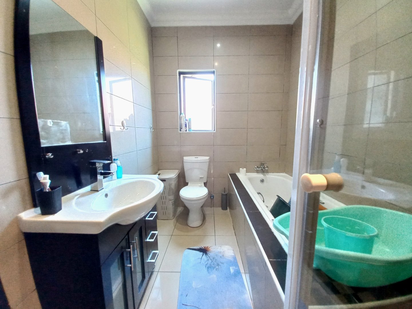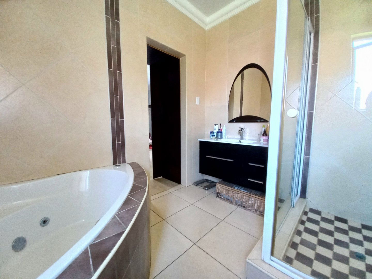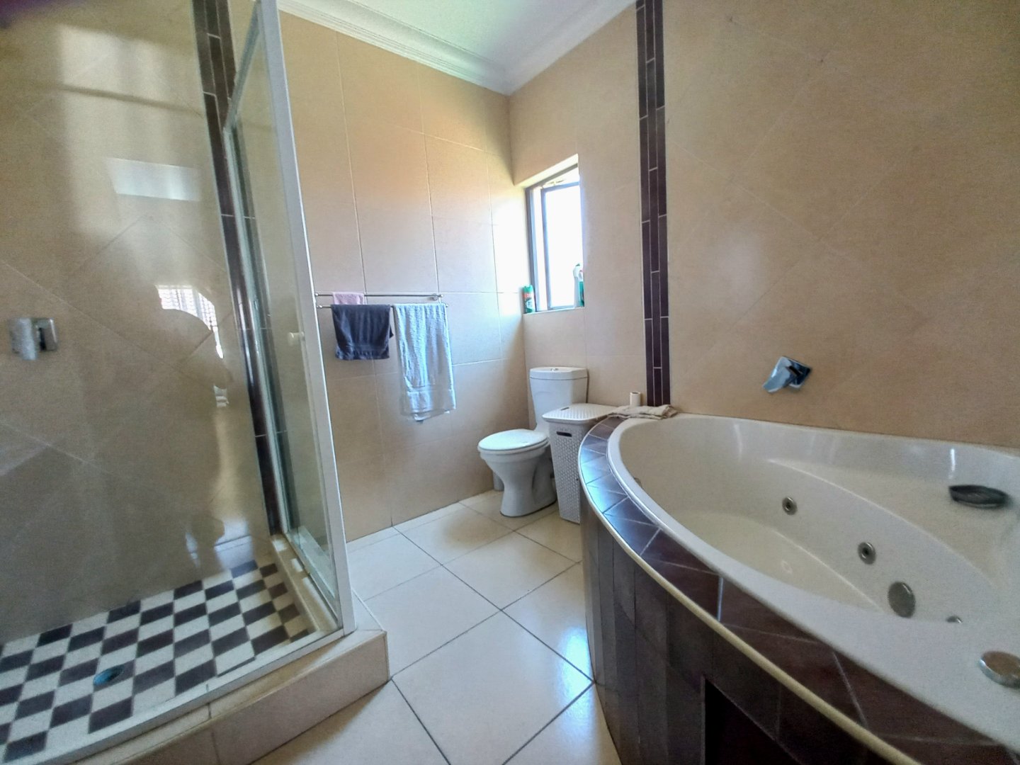 Luxurious Main Suite: Ample built-in cupboards, laminated floors, king-size bed space, and fully tiled ensuite bathroom (shower, bath, basin, toilet).