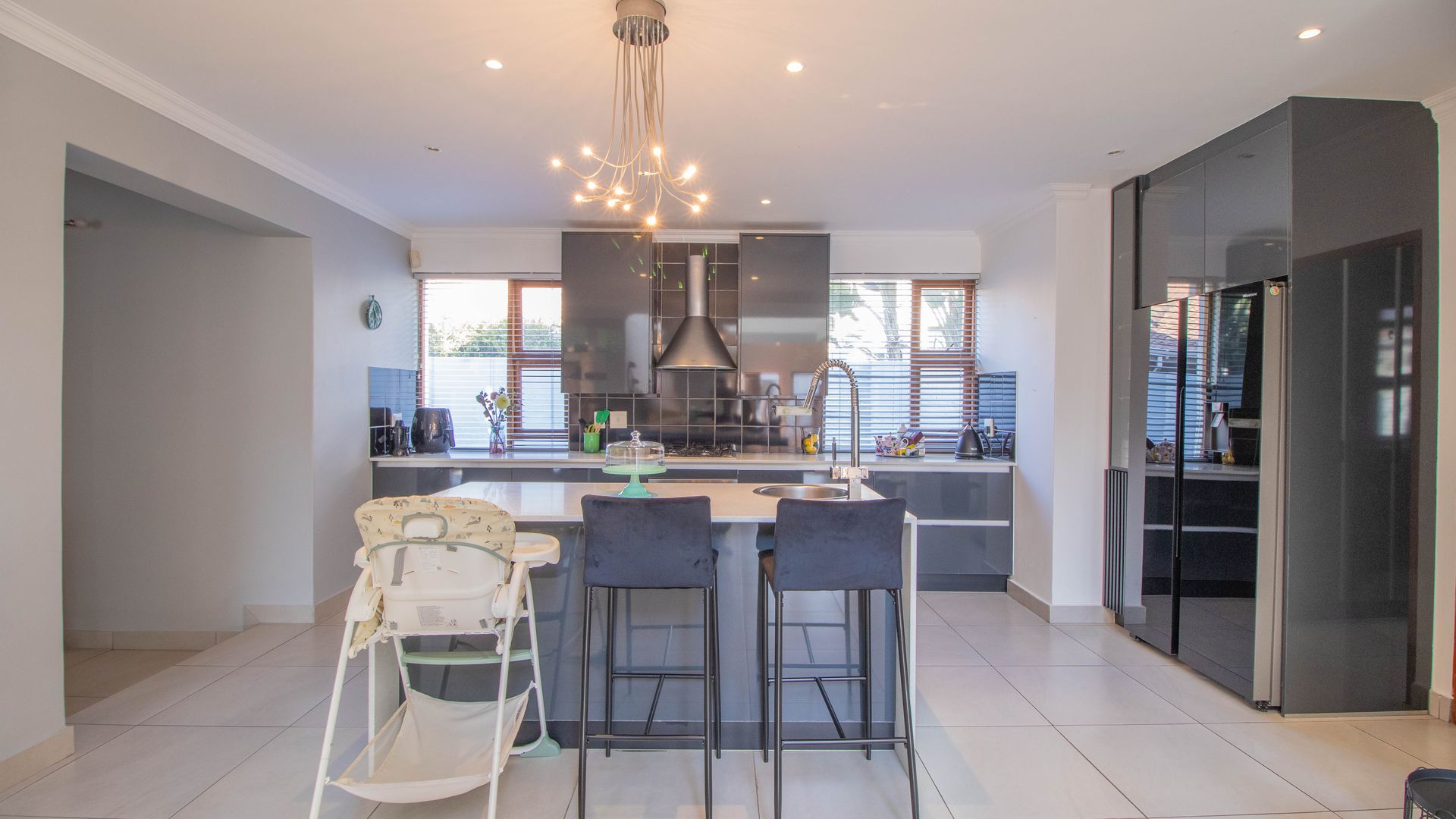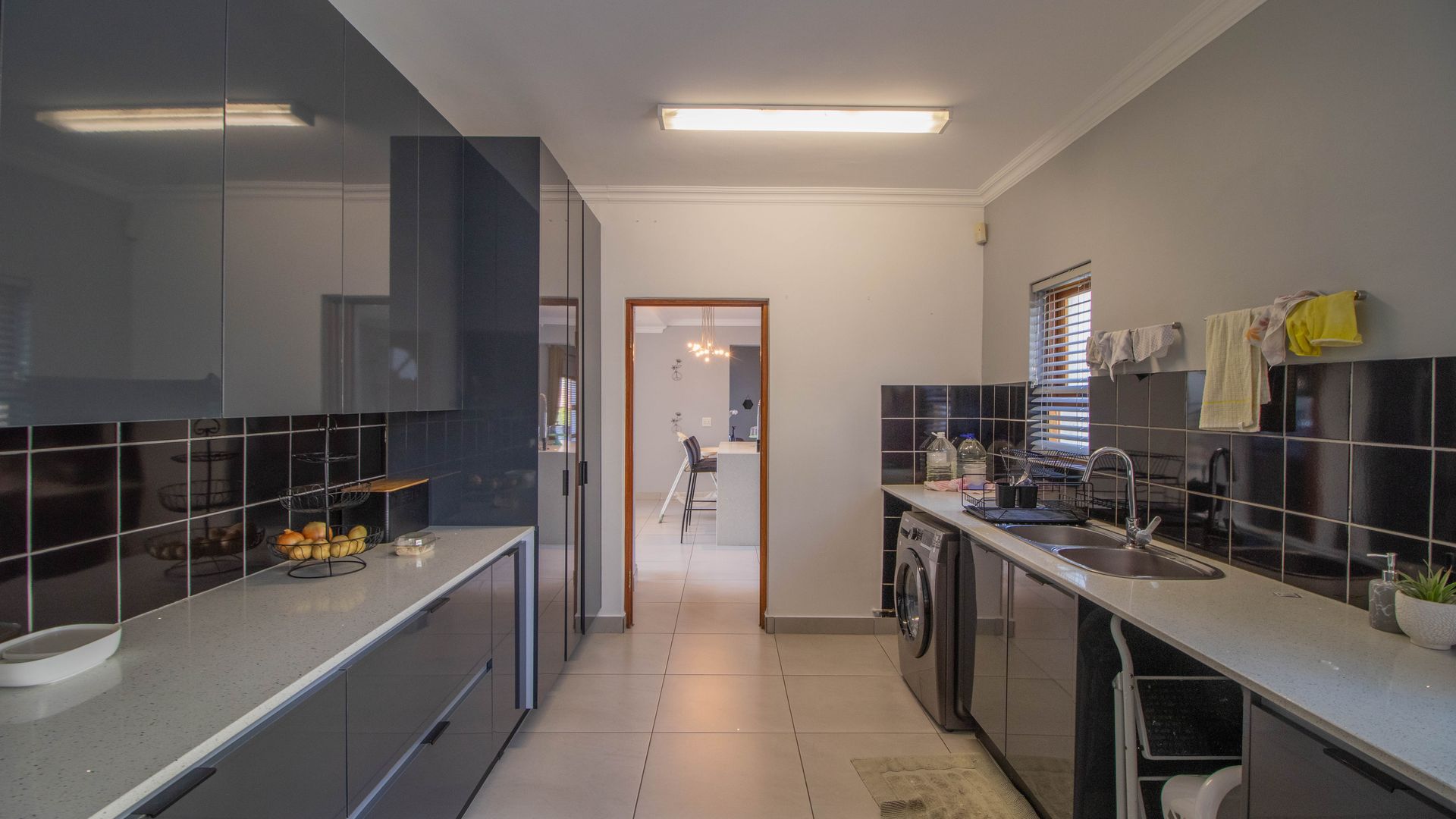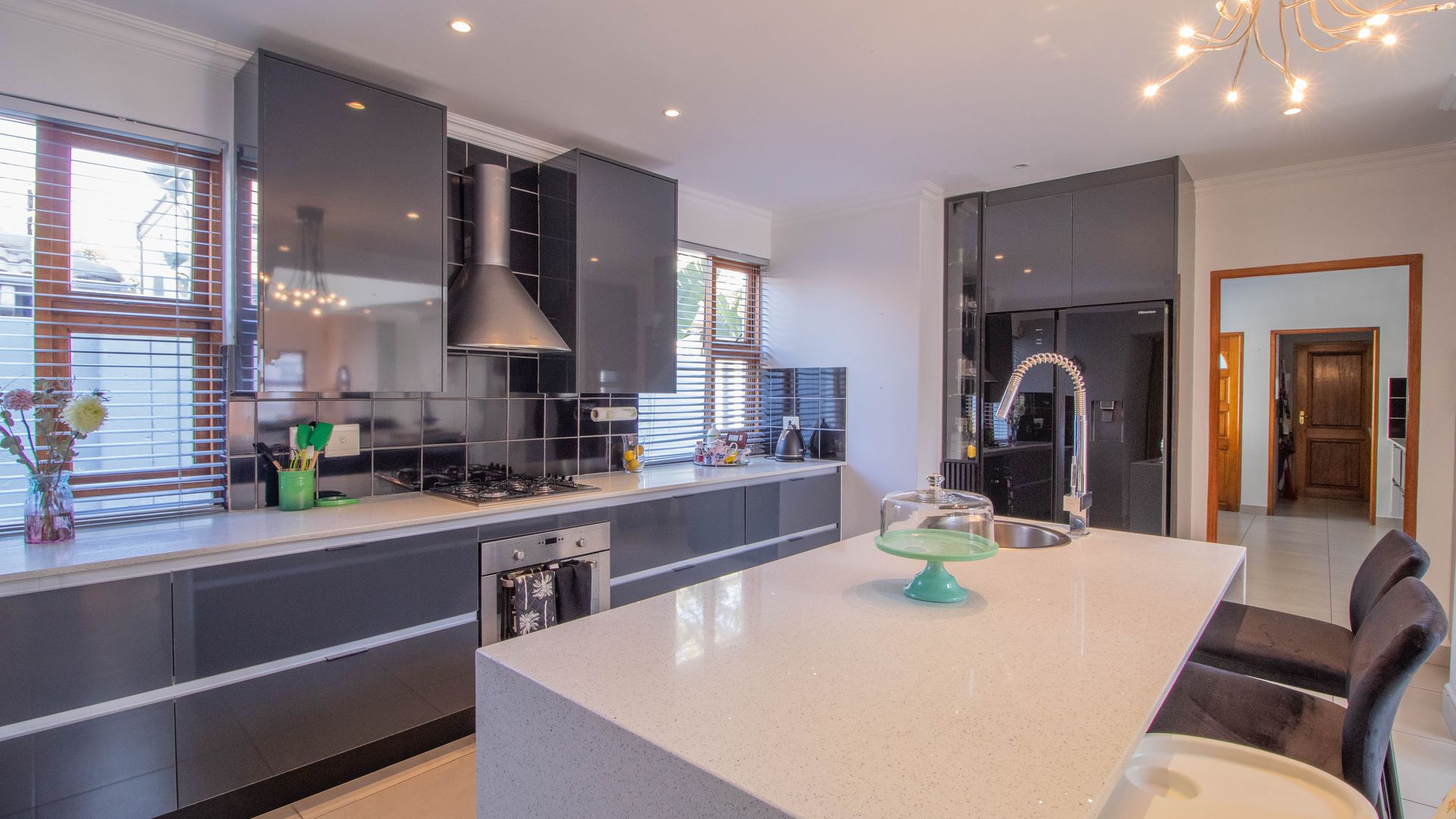 Stylish open-plan kitchen with countertops, an island, space for a double door fridge, gas hob, electric oven, separate scullery with space for 2 appliances and extra cupboard space.