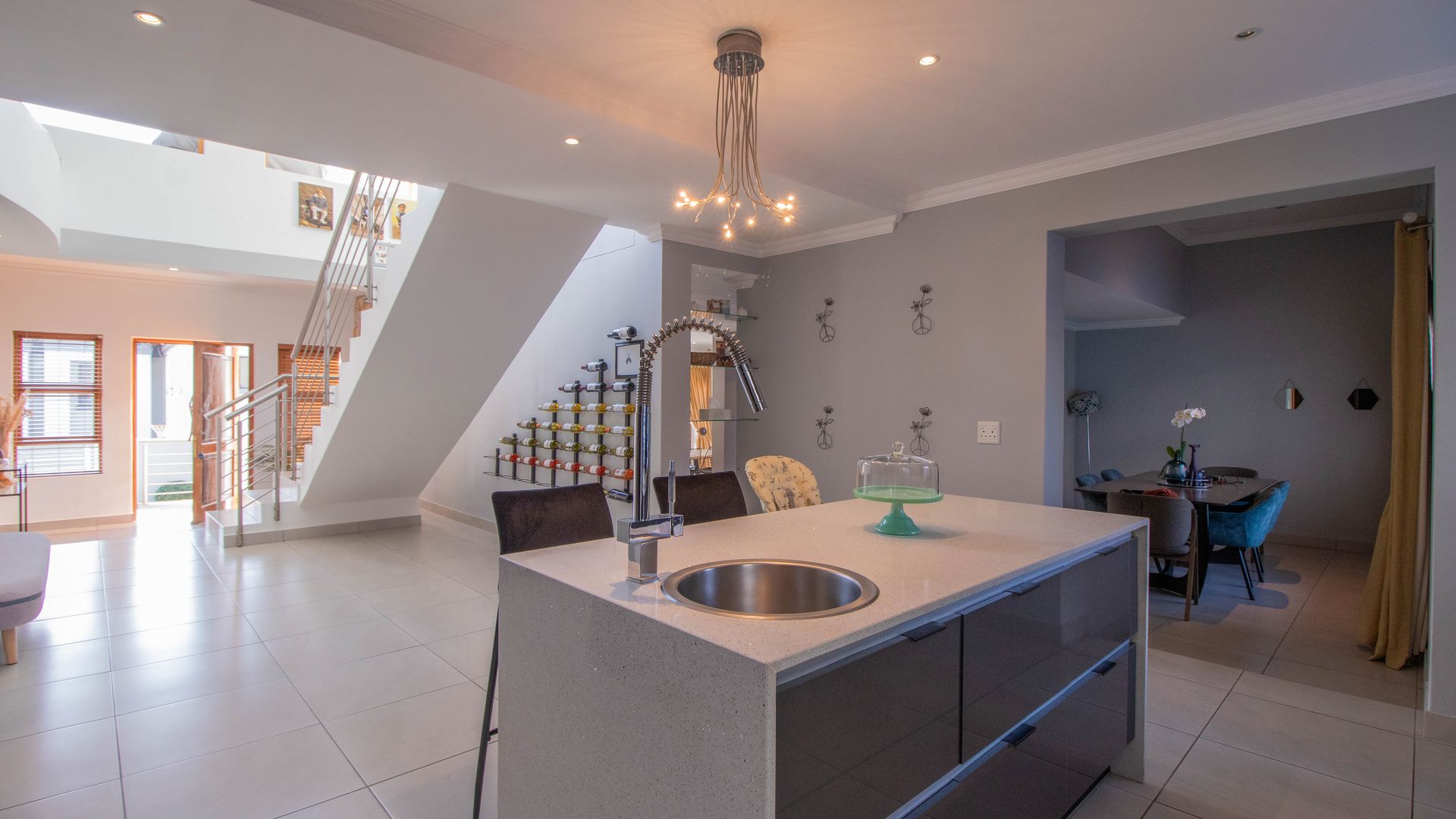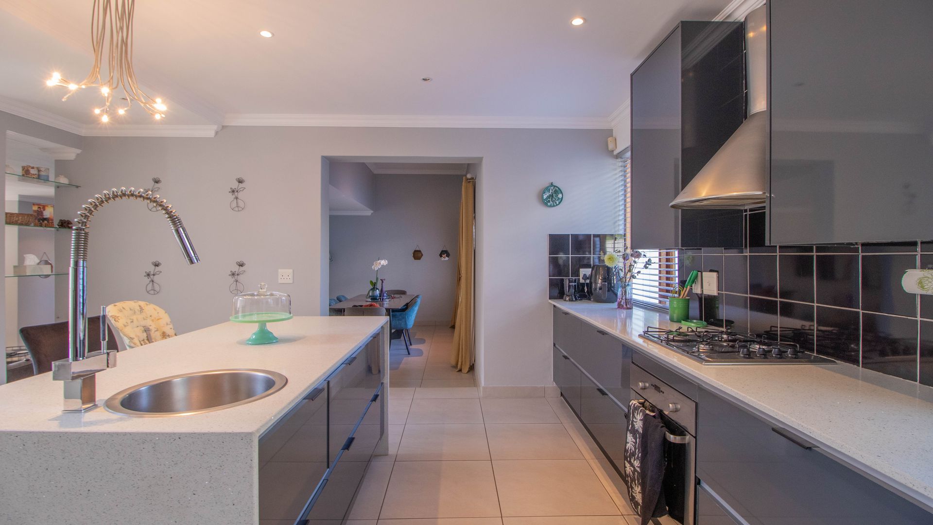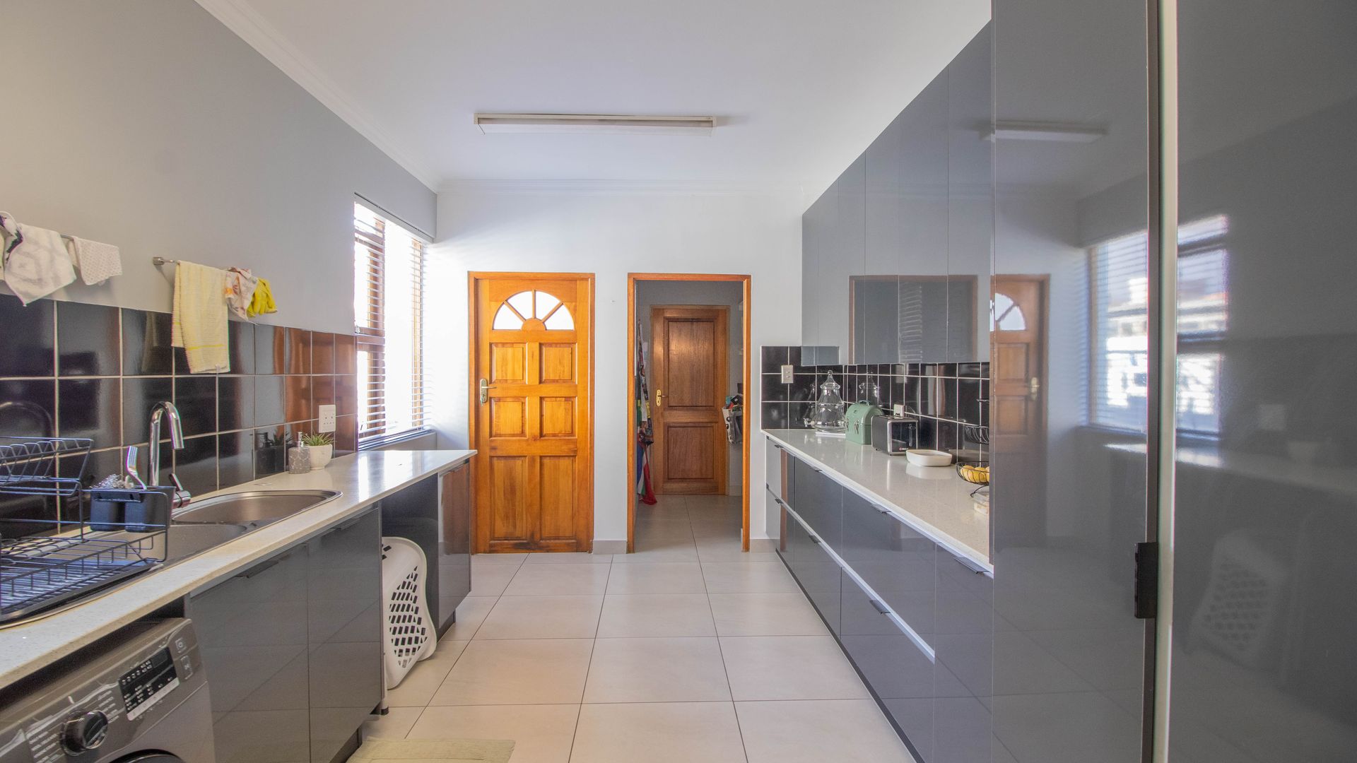 Stylish open-plan kitchen with countertops, an island, space for a double door fridge, gas hob, electric oven, separate scullery with space for 2 appliances and extra cupboard space.