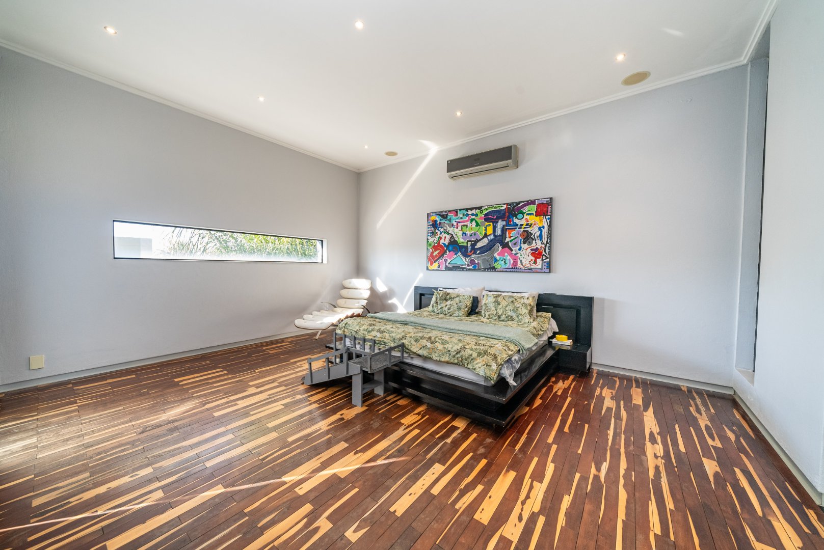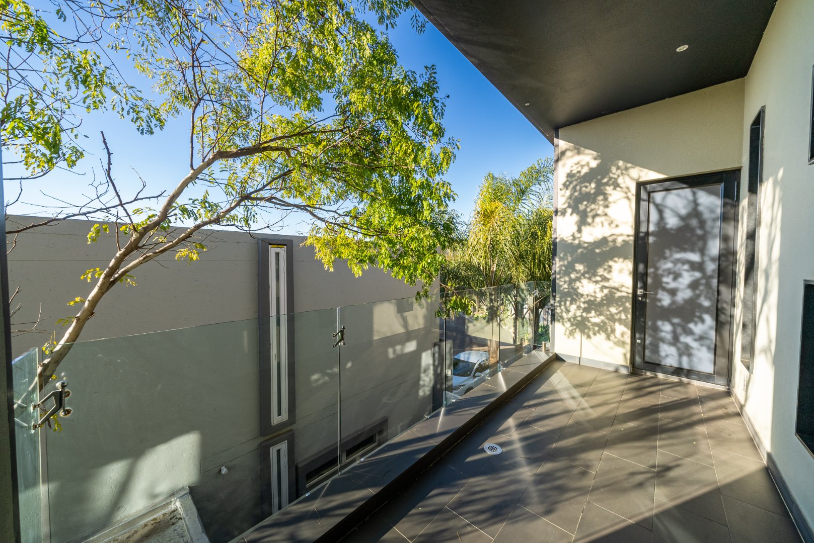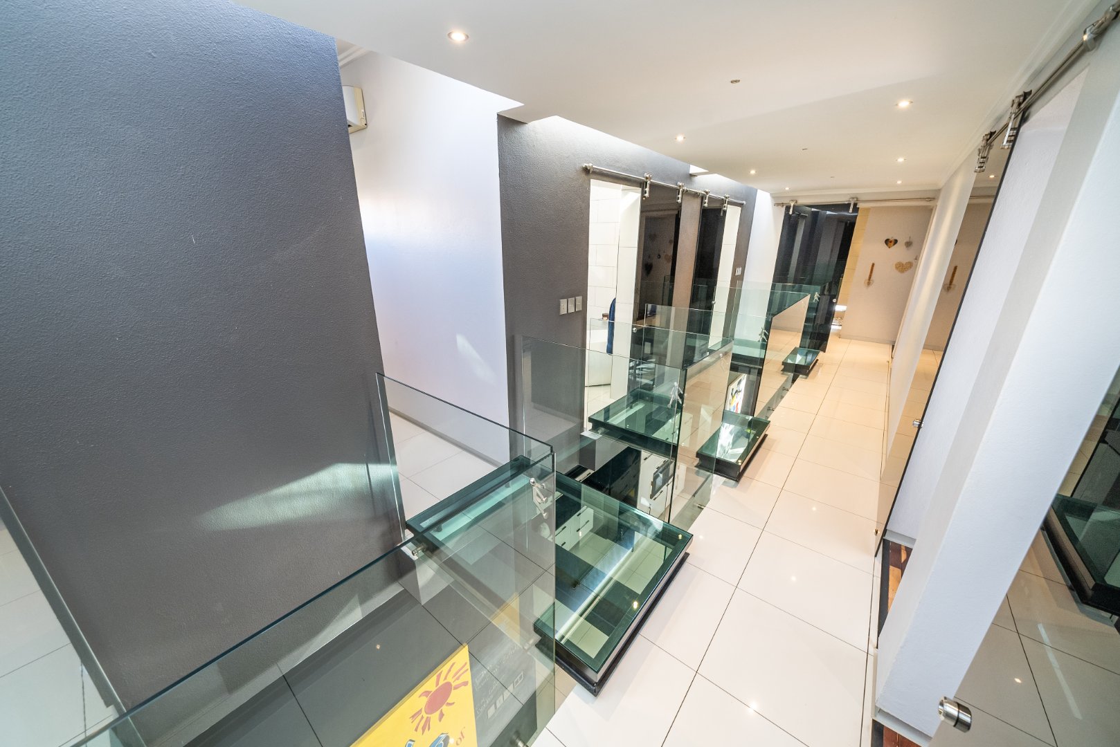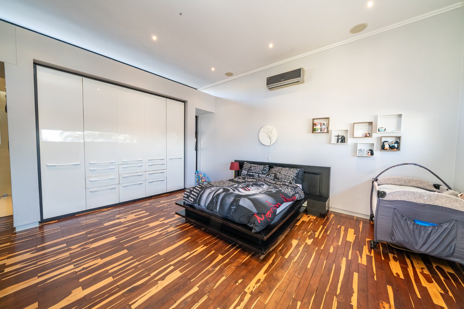 Upstairs, the home continues to impress with its bespoke finishes. The bedrooms boast rich Mopani wood flooring, hewn from a single tree, adding warmth and character. The master suite offers a peaceful retreat with a spa-inspired bathroom and an eye-catching imported German chandelier. A second en-suite bedroom provides privacy and comfort, while the third and fourth bedrooms each enjoy their own individual bathrooms and distinctive designer window treatments. Each bedroom has access to a private balcony, and a dedicated study area completes the upper level.