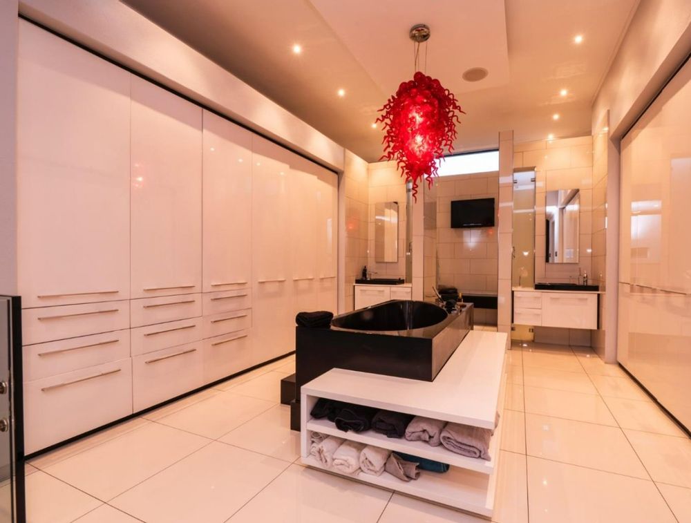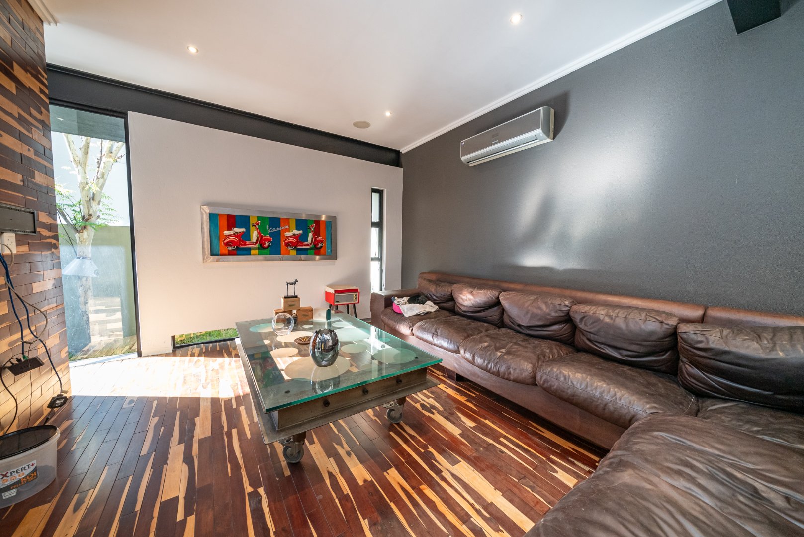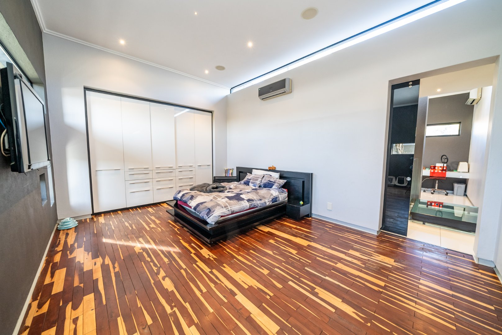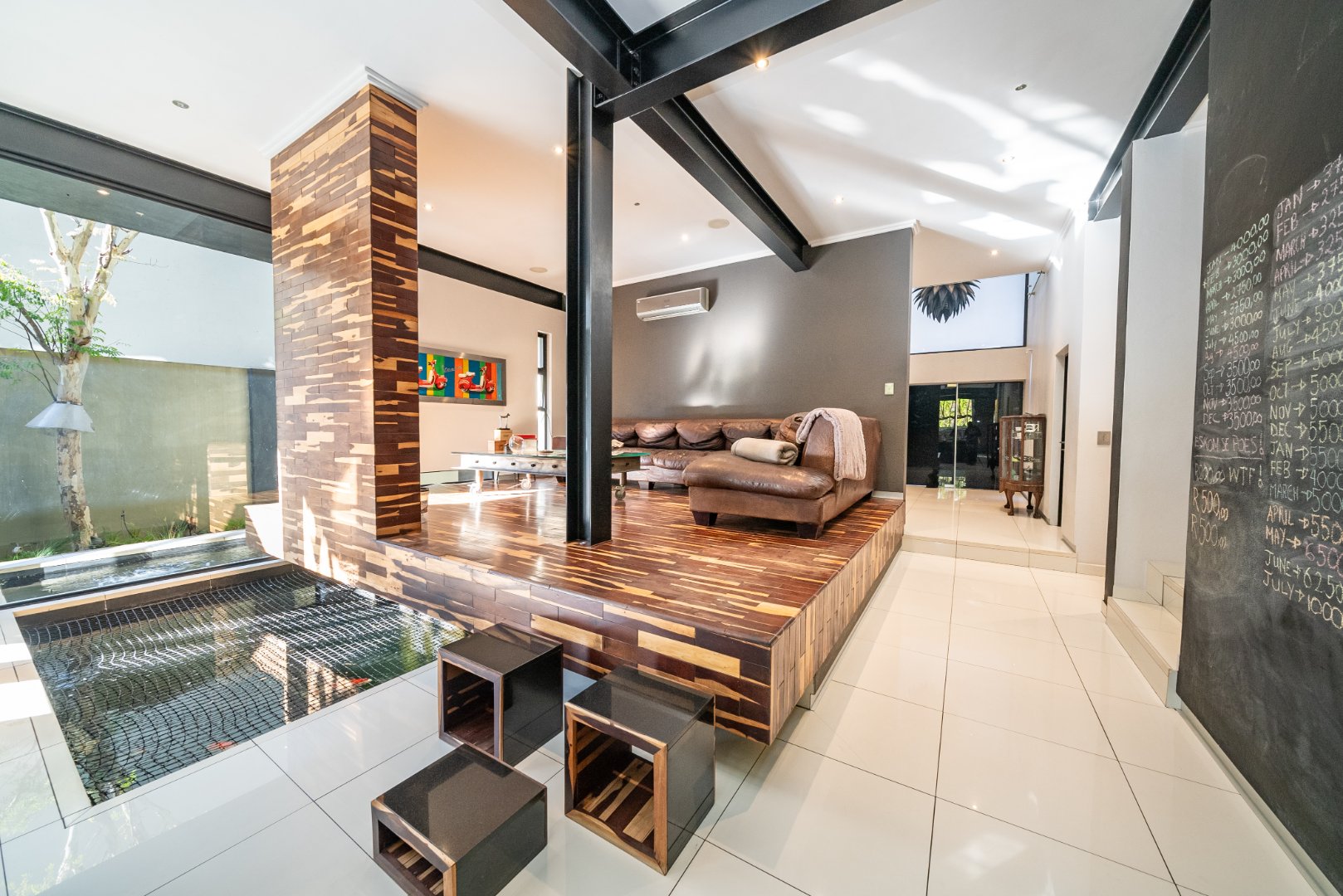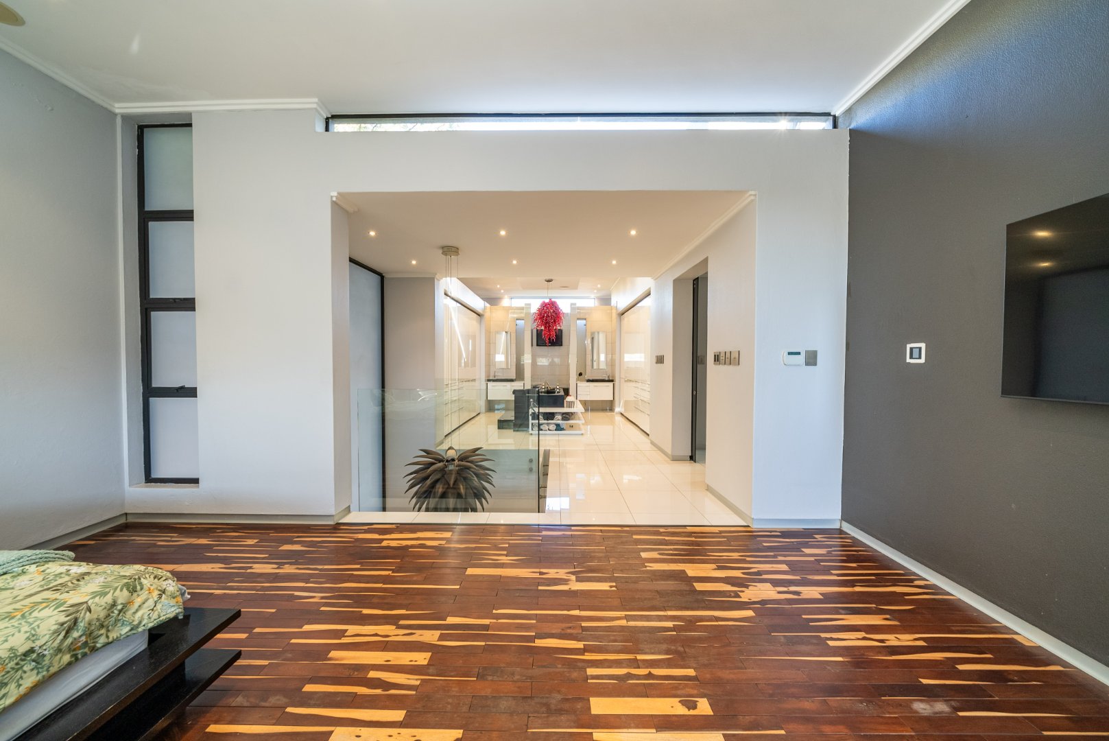Upstairs, the home continues to impress with its bespoke finishes. The bedrooms boast rich Mopani wood flooring, hewn from a single tree, adding warmth and character. The master suite offers a peaceful retreat with a spa-inspired bathroom and an eye-catching imported German chandelier. A second en-suite bedroom provides privacy and comfort, while the third and fourth bedrooms each enjoy their own individual bathrooms and distinctive designer window treatments. Each bedroom has access to a private balcony, and a dedicated study area completes the upper level.