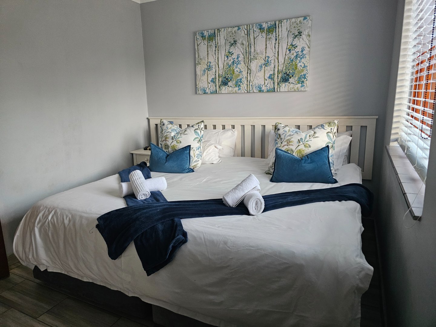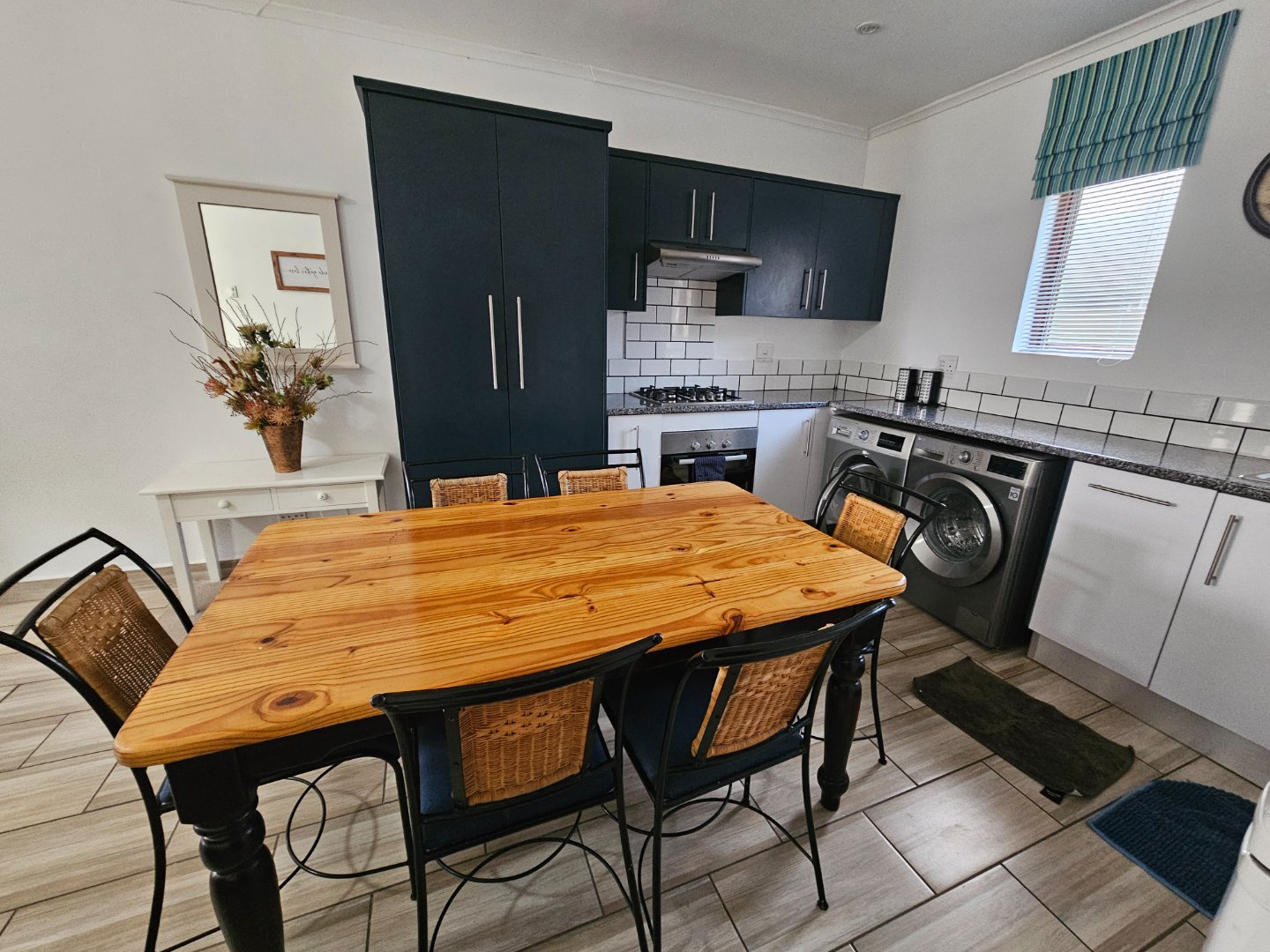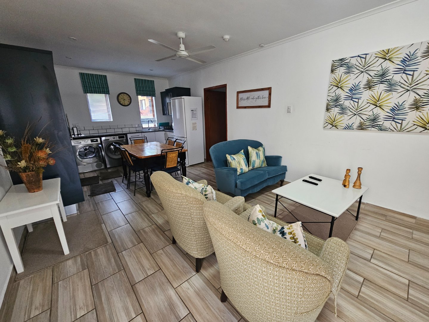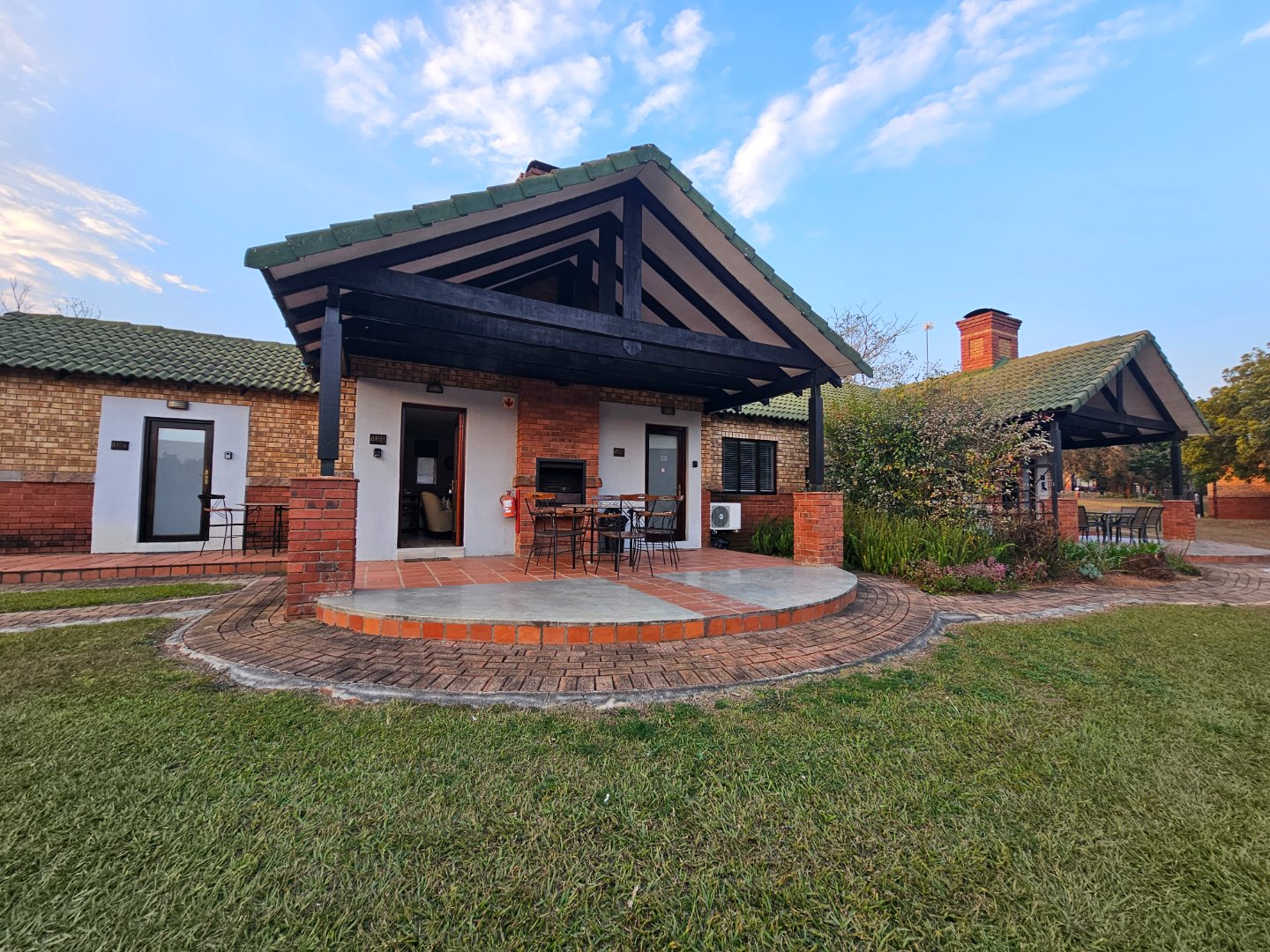 The beauty of this unit is that it has 2 bedrooms and the open plan kitchen that leads onto the dining area and lounge with a fire place. Theres a 1 Bedroom unit thats a separate to the other 2. With its own entrance. This can be hired out on its own. The outside patio has a built in braai. The location in the Estate is prime, Overlooking beautiful gardens with views on its own, at the end for peaceful.