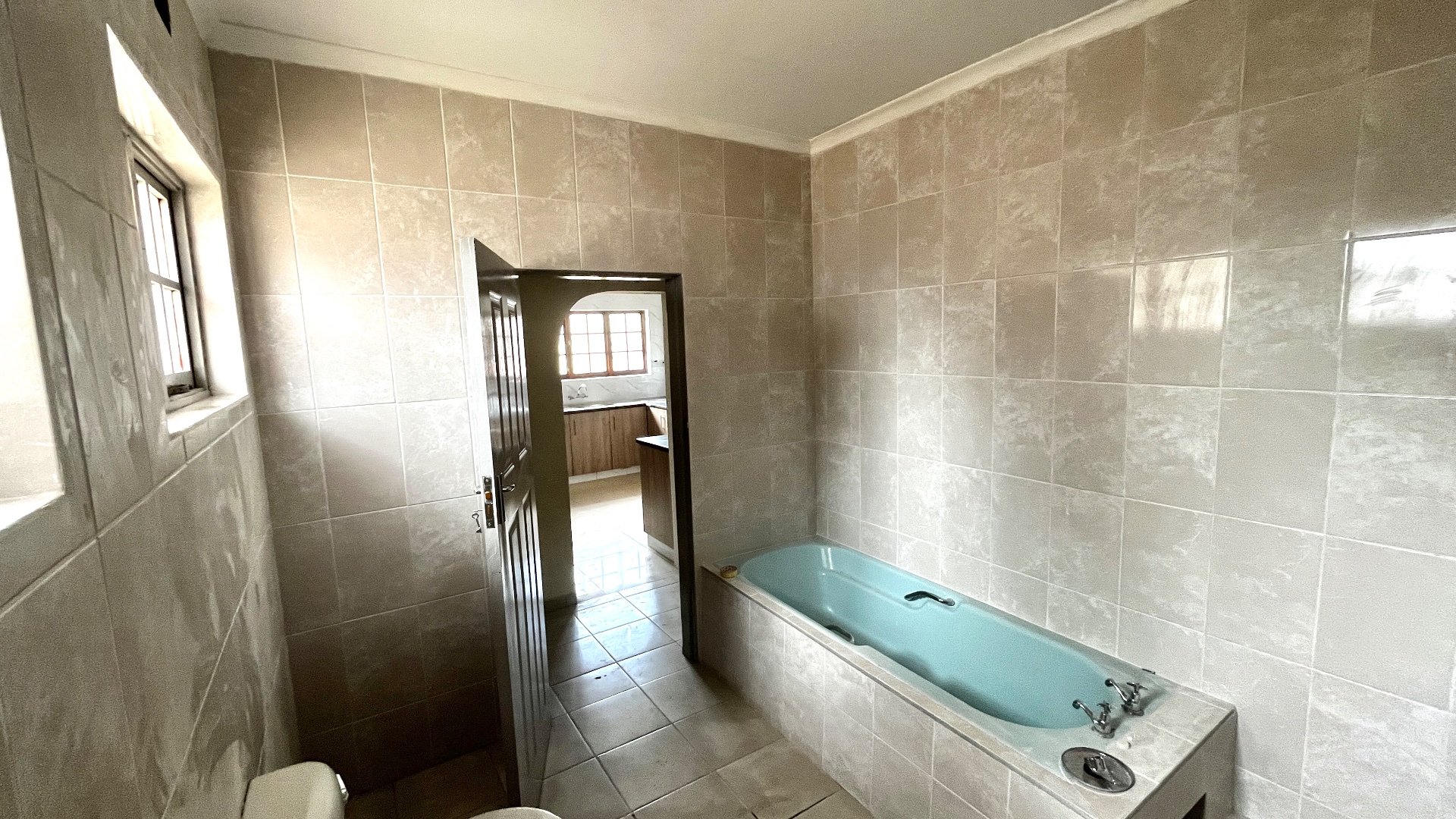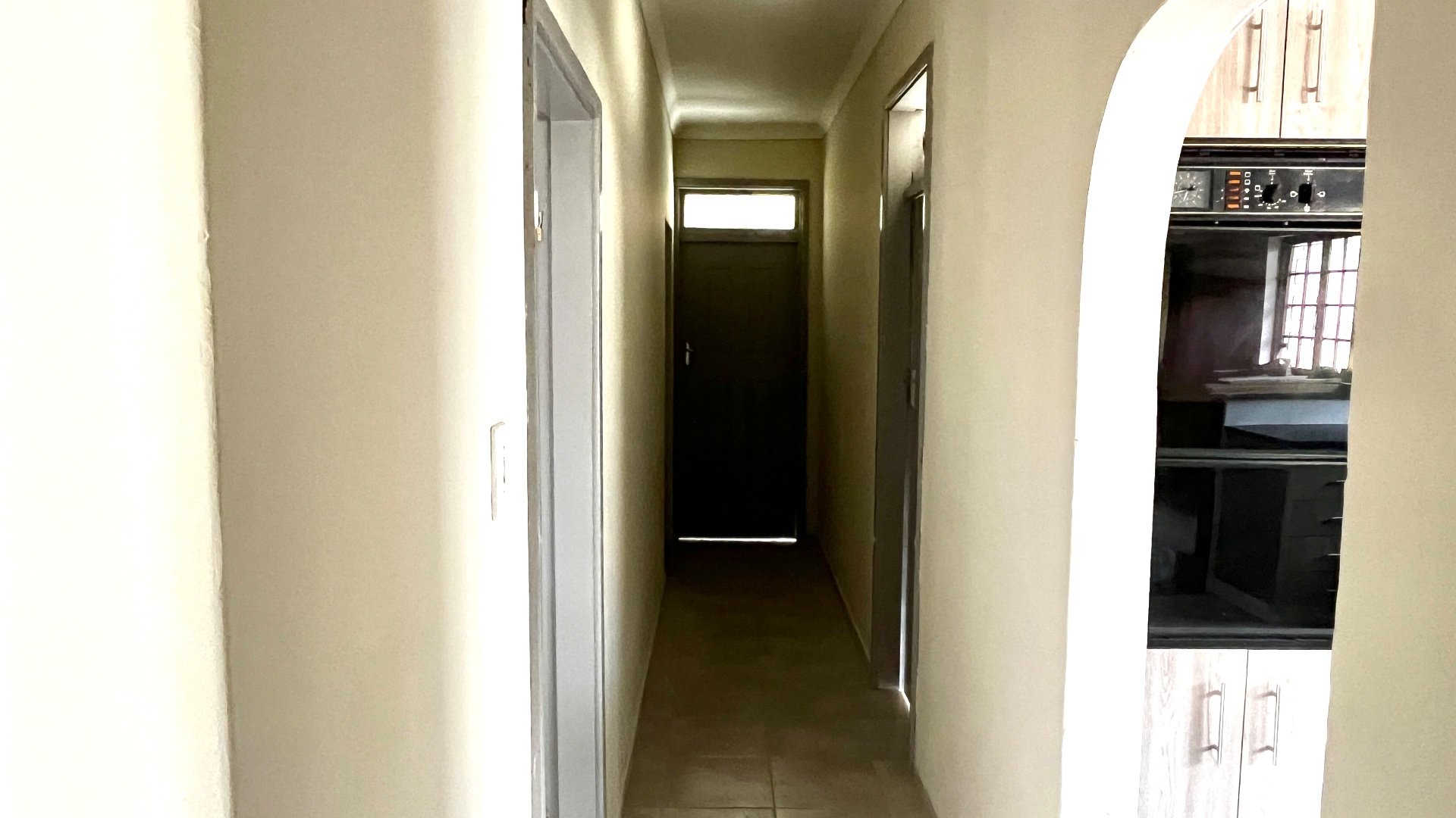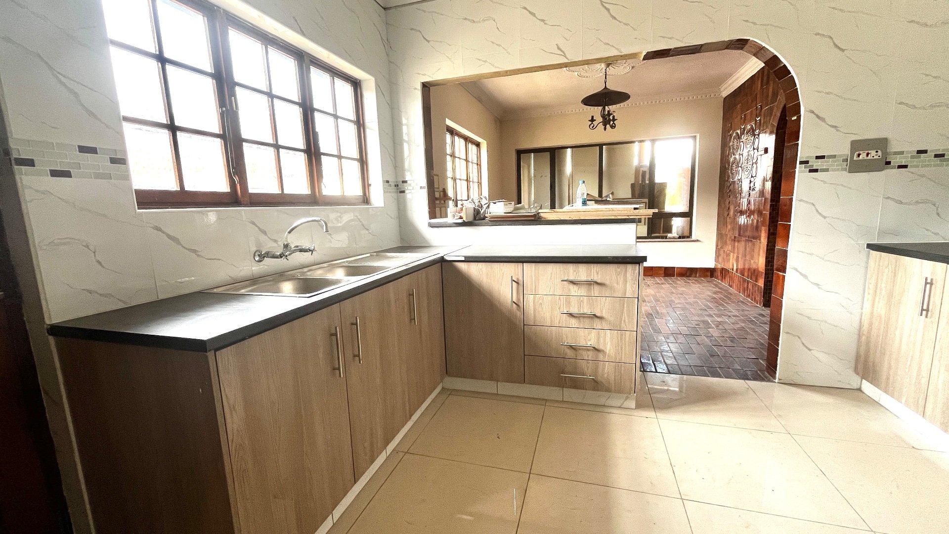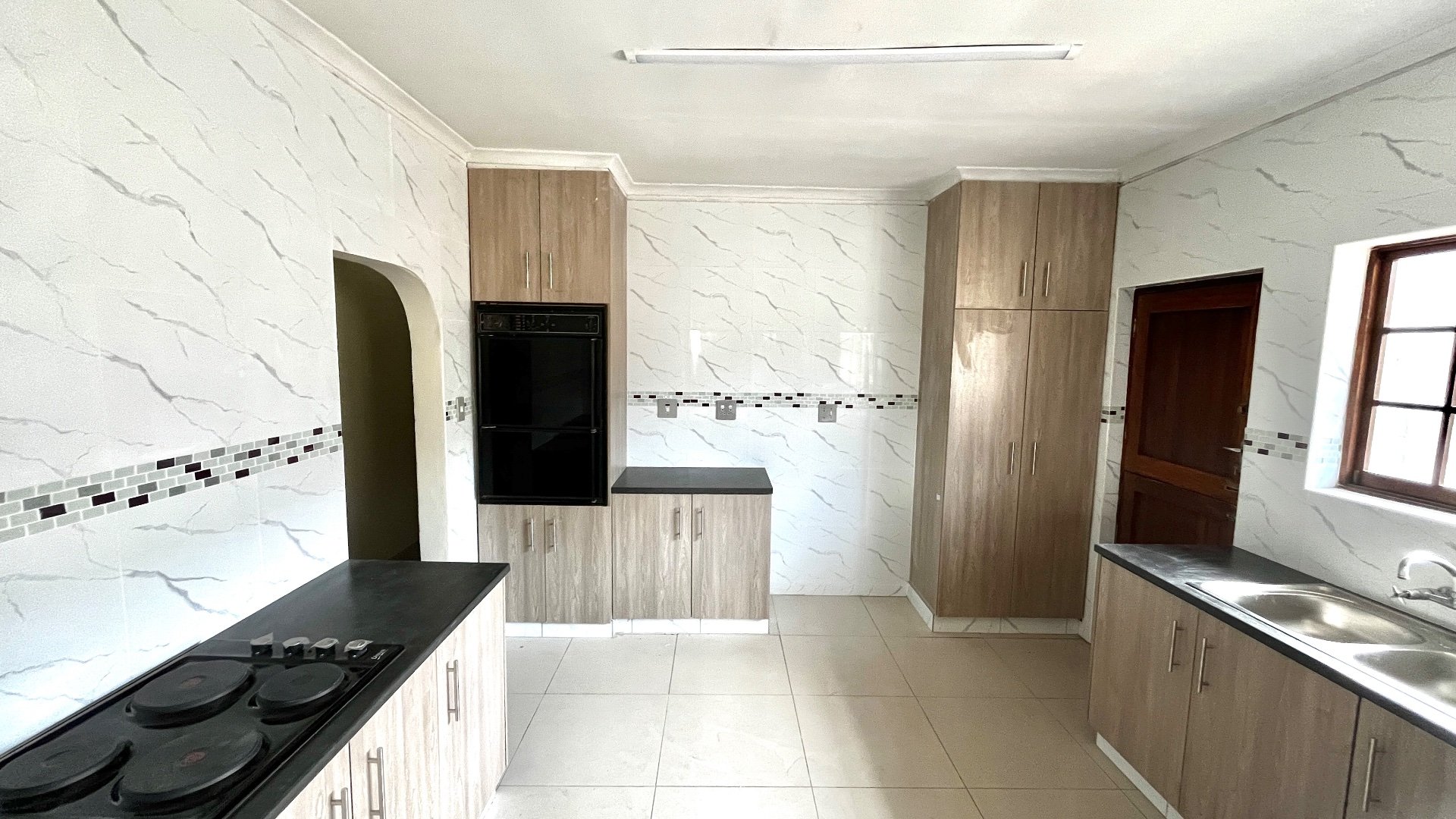 From the dining area, the home flows effortlessly into a beautifully designed kitchen. The kitchen showcases modern finishes, including sleek marble-patterned wall tiles, light wood cabinetry, and dark countertops that create a stylish contrast. It’s equipped with an eye-level oven, a built-in hob, and a double sink, offering both practicality and a