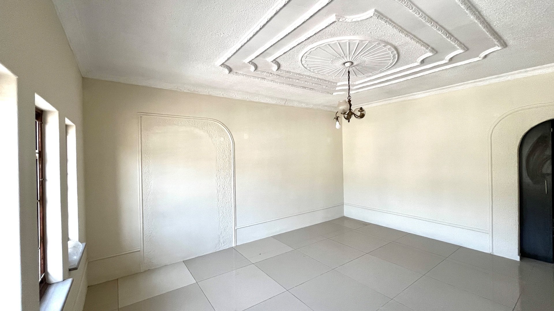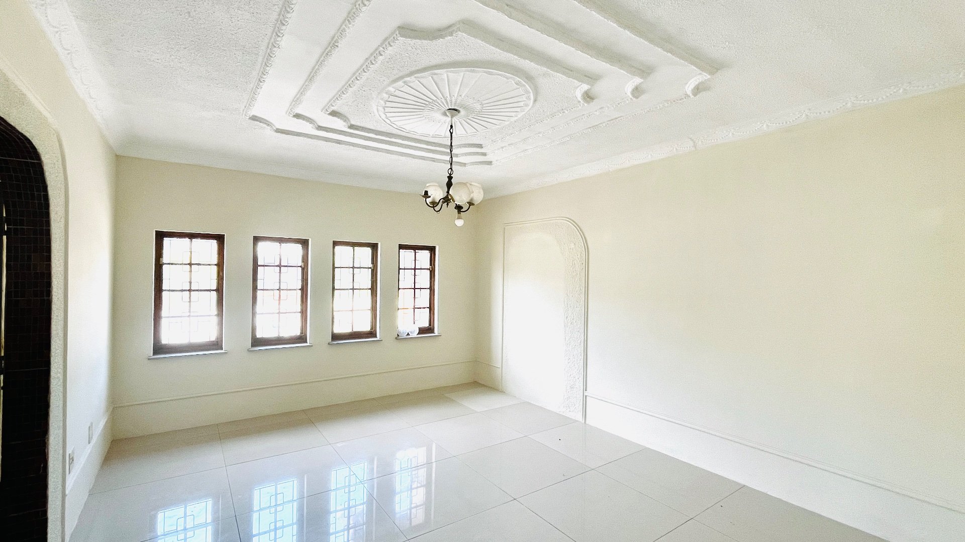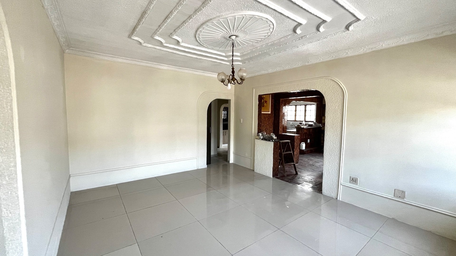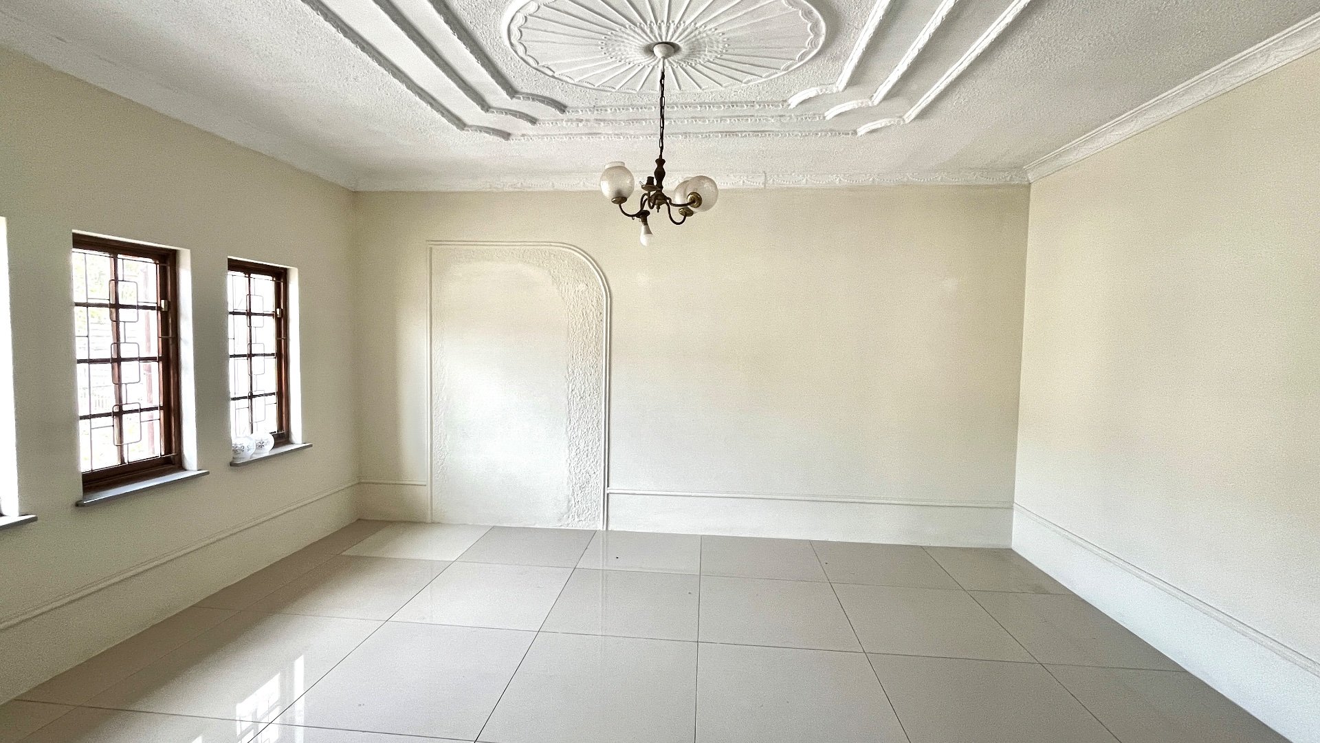 To the left of the entryway is a spacious lounge designed for relaxation or entertaining. The ceiling features a stunning stepped design with a recessed rectangular centre and a circular light fitting - adding depth, character, and a sense of sophistication to the space. On the right, the dining area offers an inviting setting for shared meals and family gatherings.