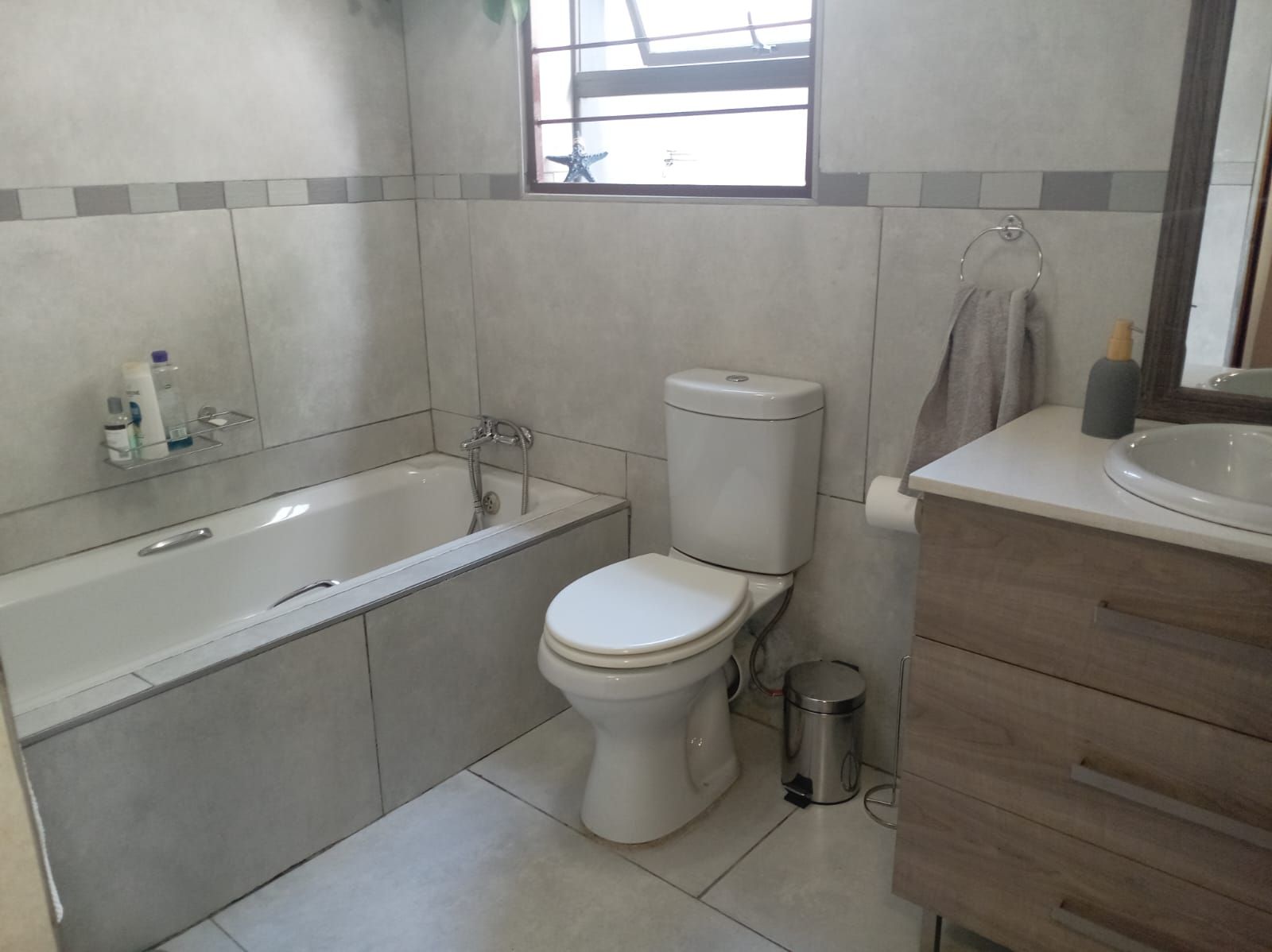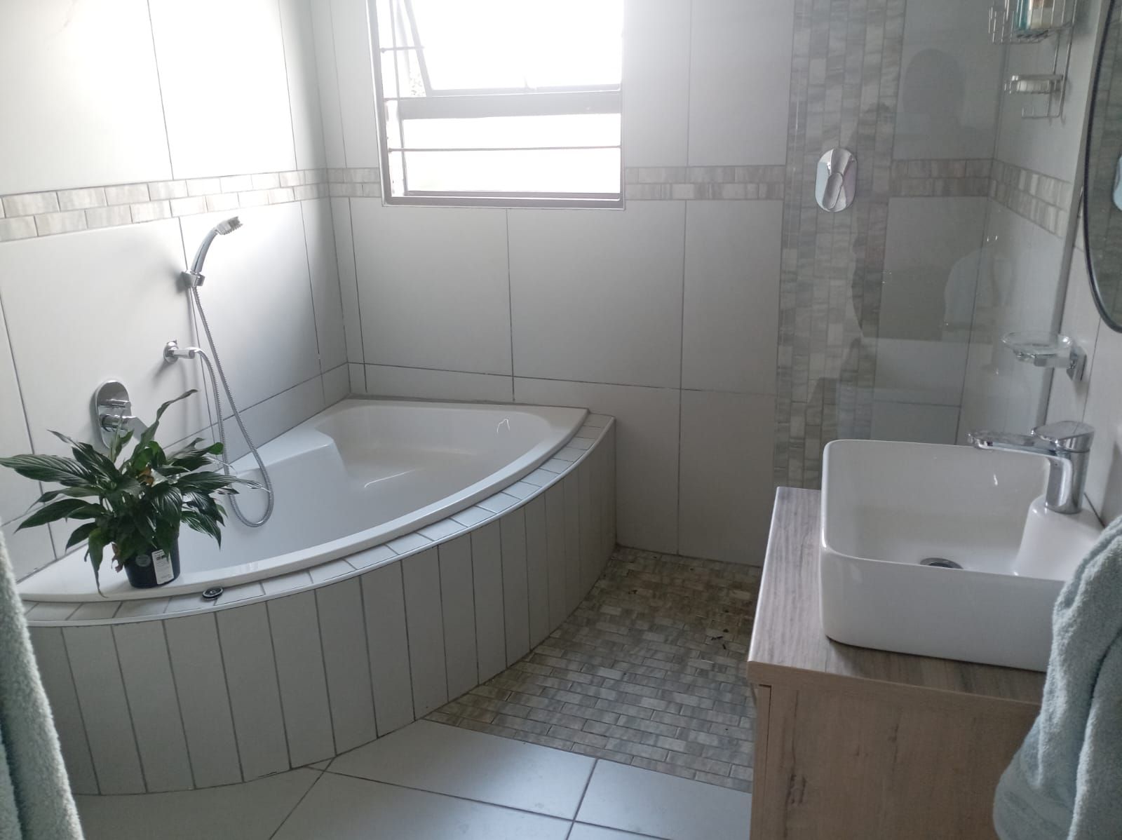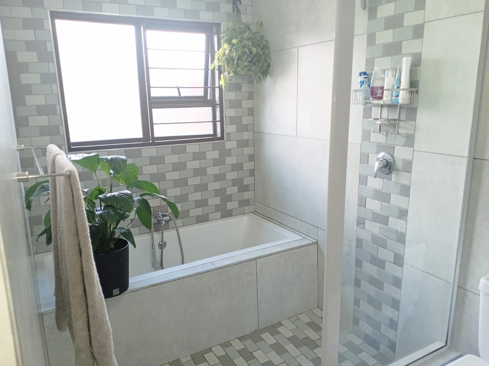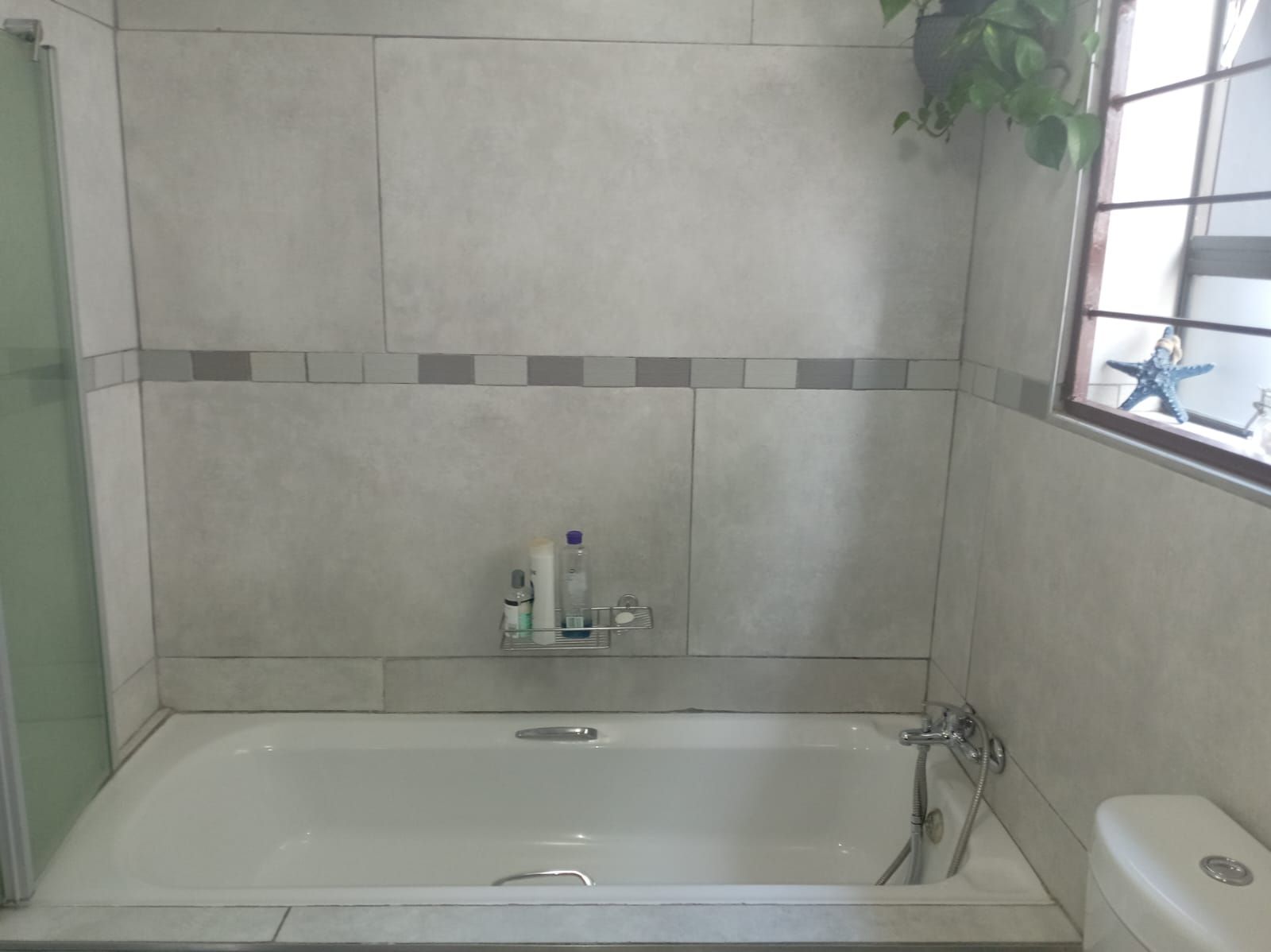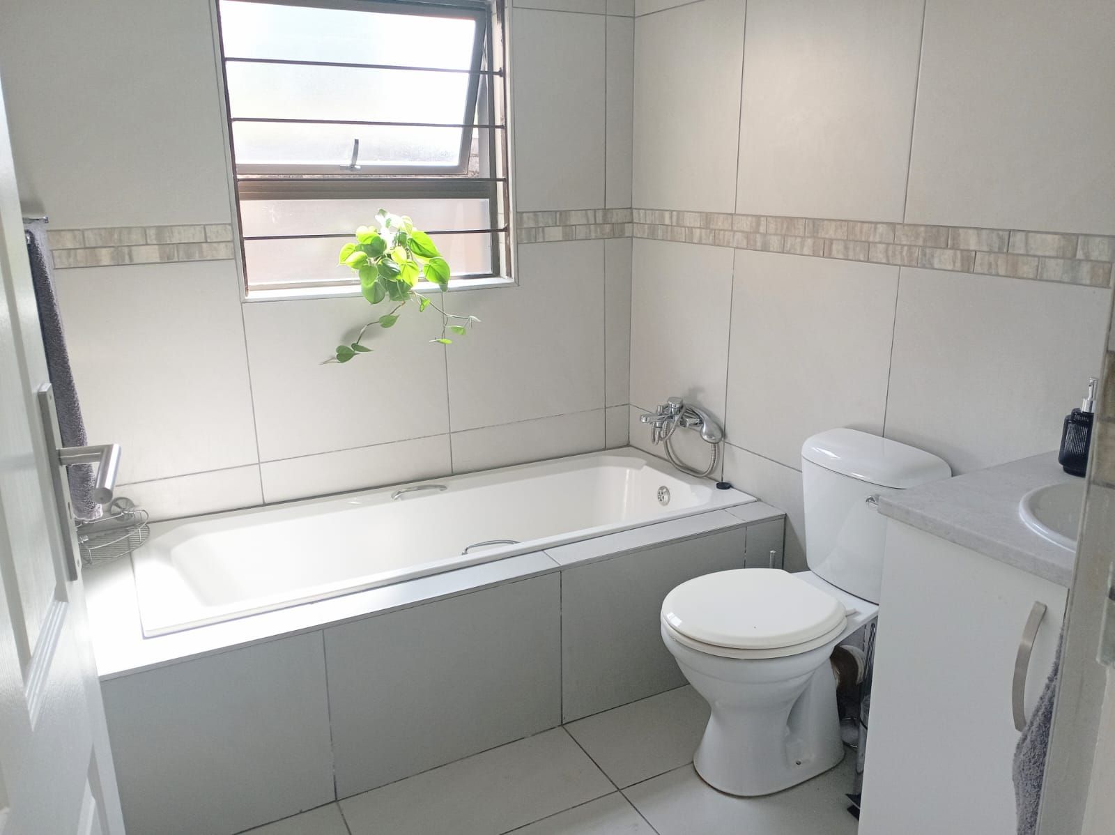 Second bathroom with bath, basin, and toilet (fully tiled)