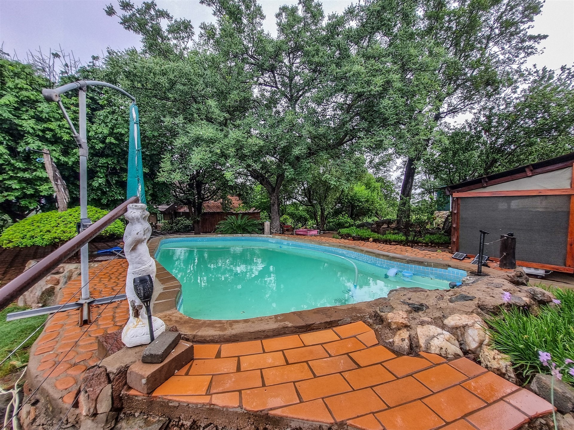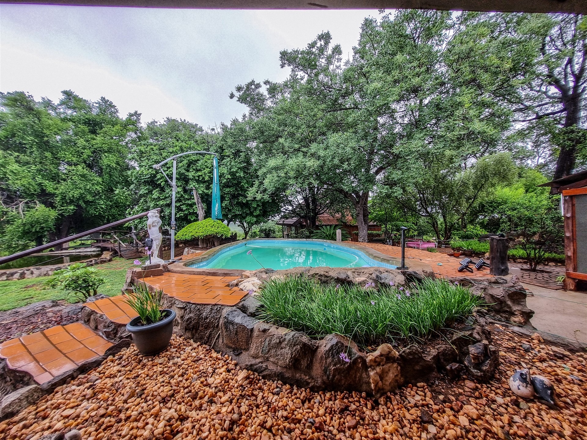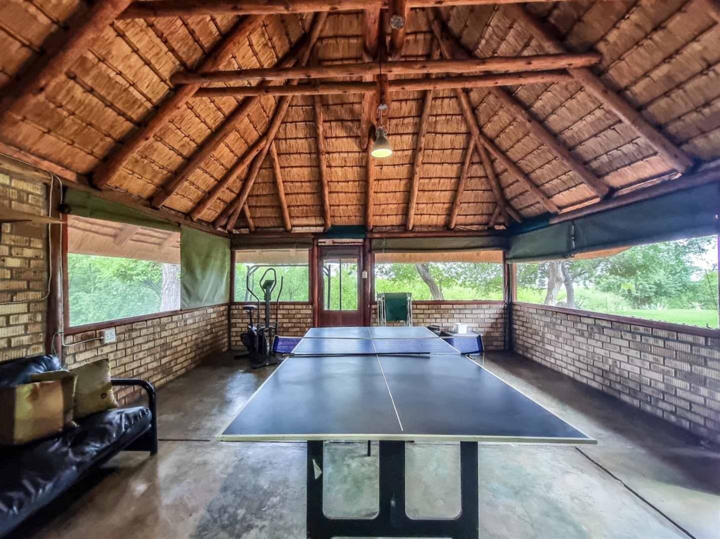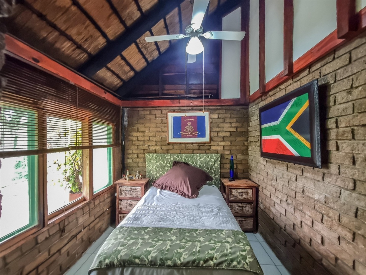 Outside there is a large covered patio area with built in braai, pool and fenced garden. A large entertainment/ games room with boma and toilets is found on one side of the garden, while the cottage is found on the other side of the patio area.
