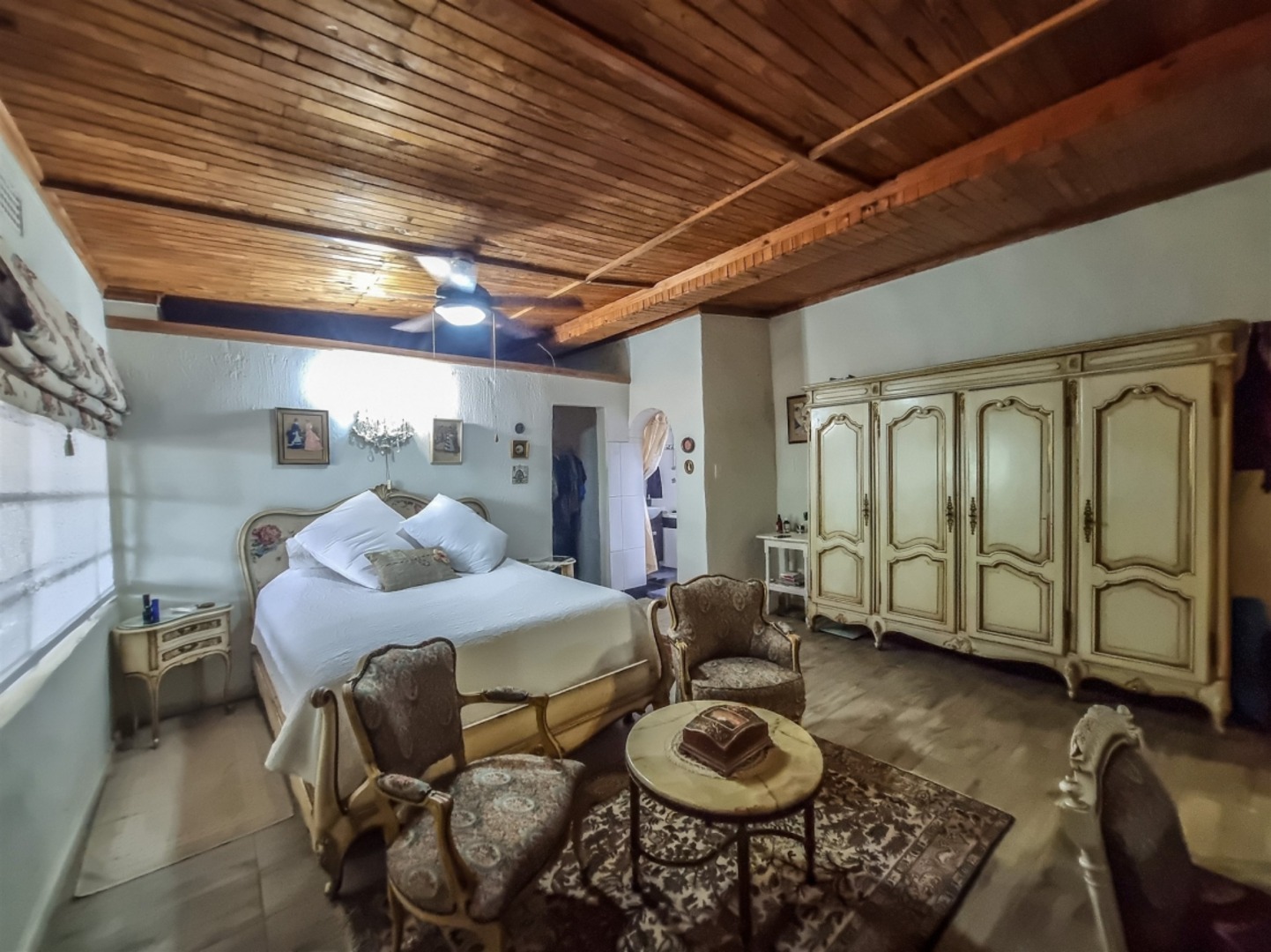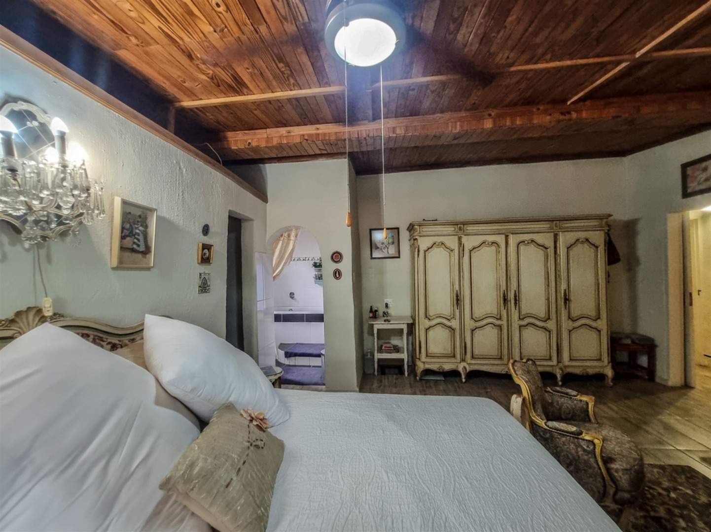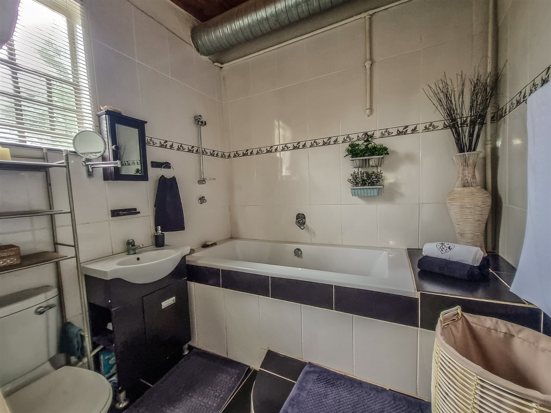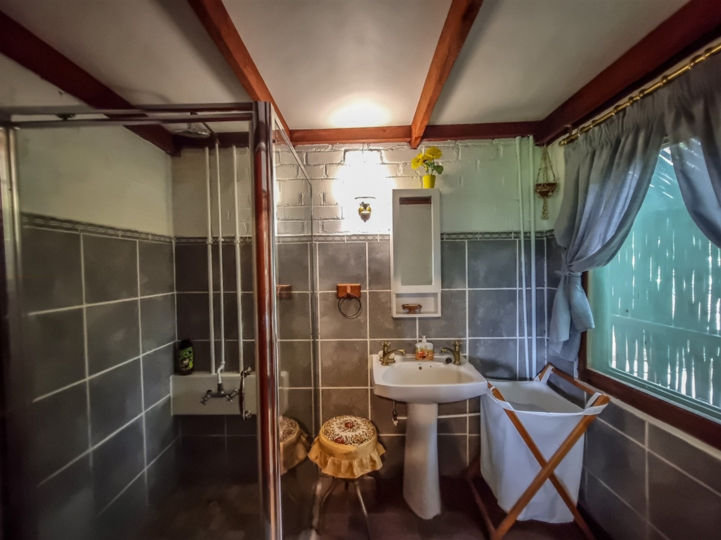 Outside there is a large covered patio area with built in braai, pool and fenced garden. A large entertainment/ games room with boma and toilets is found on one side of the garden, while the cottage is found on the other side of the patio area.