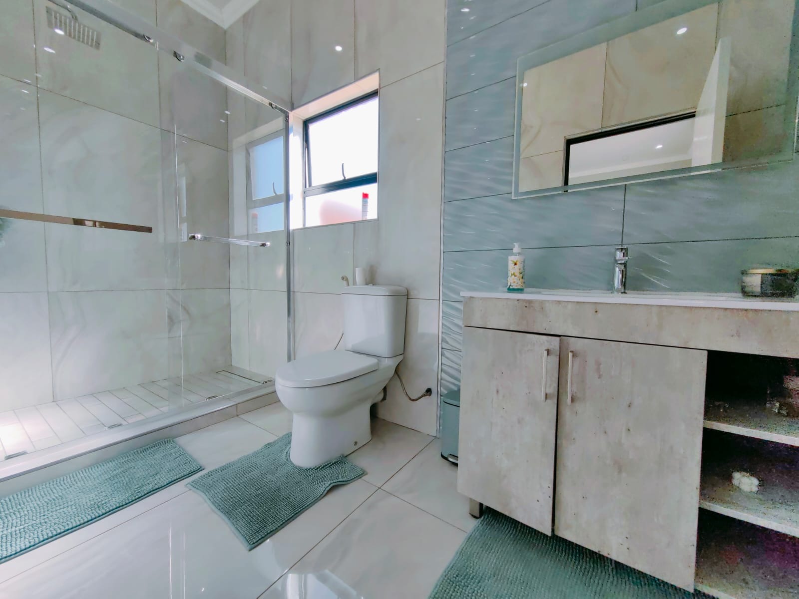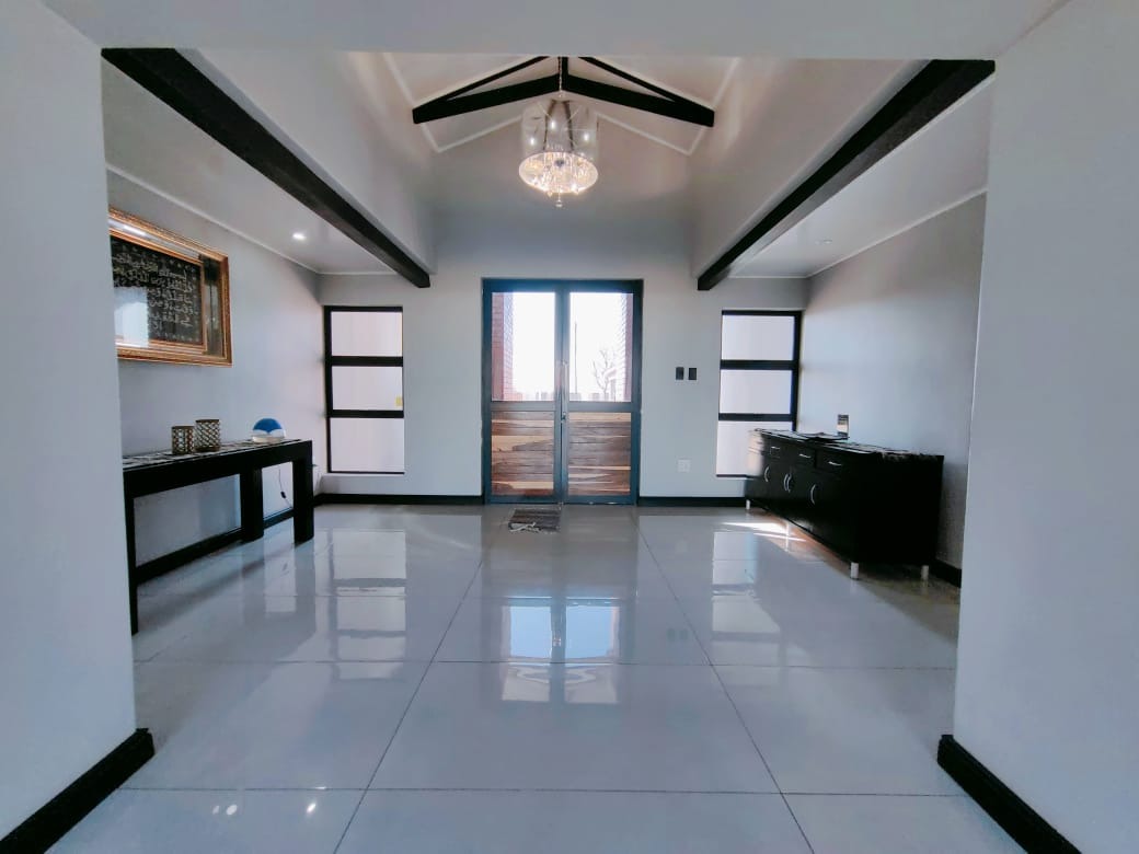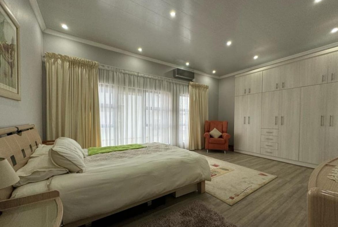 With four spacious garages, your vehicles and storage needs are effortlessly accommodated. Step outside onto a patio and enjoy the view of the massive garden, an idyllic retreat for outdoor activities, children’s play, or simply basking in the natural beauty that surrounds you. The property also boasts a borehole and an advanced irrigation system, ensuring lush, green landscapes year-round.