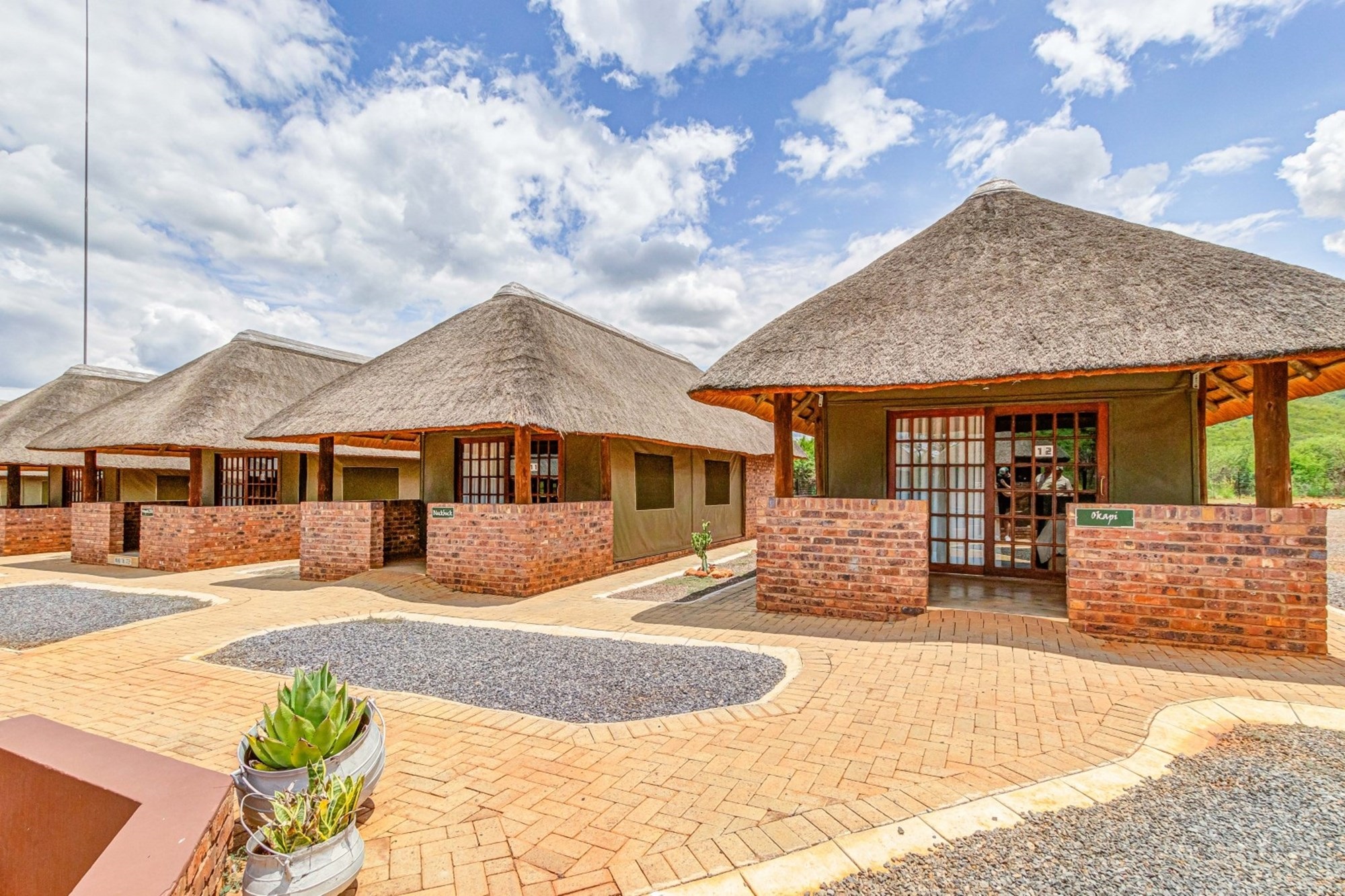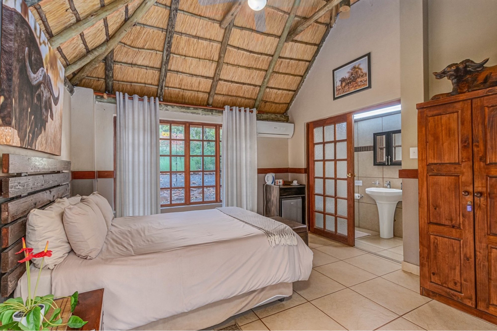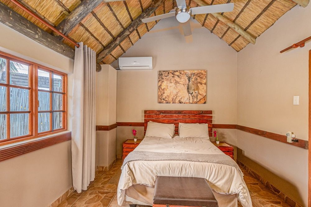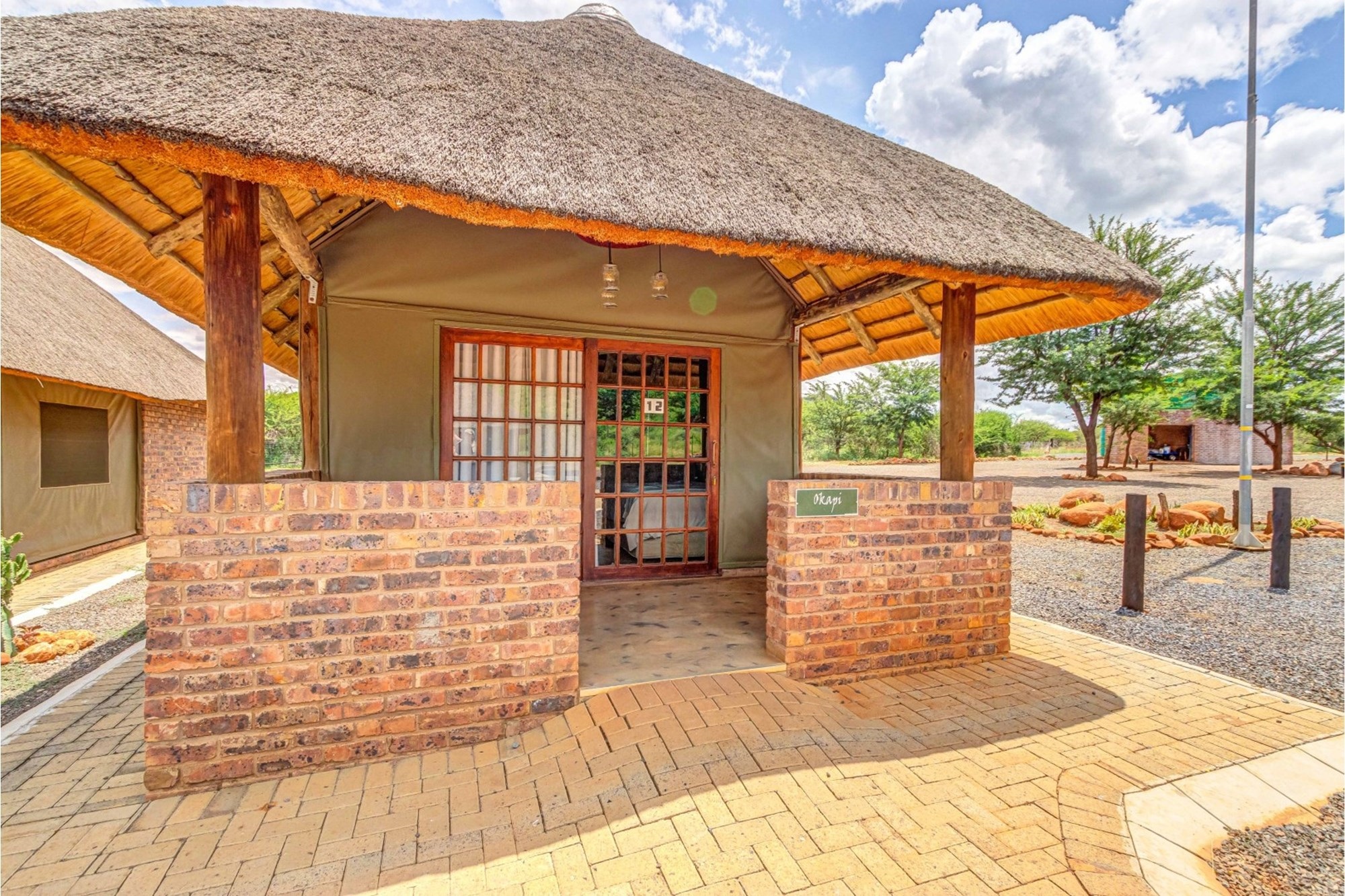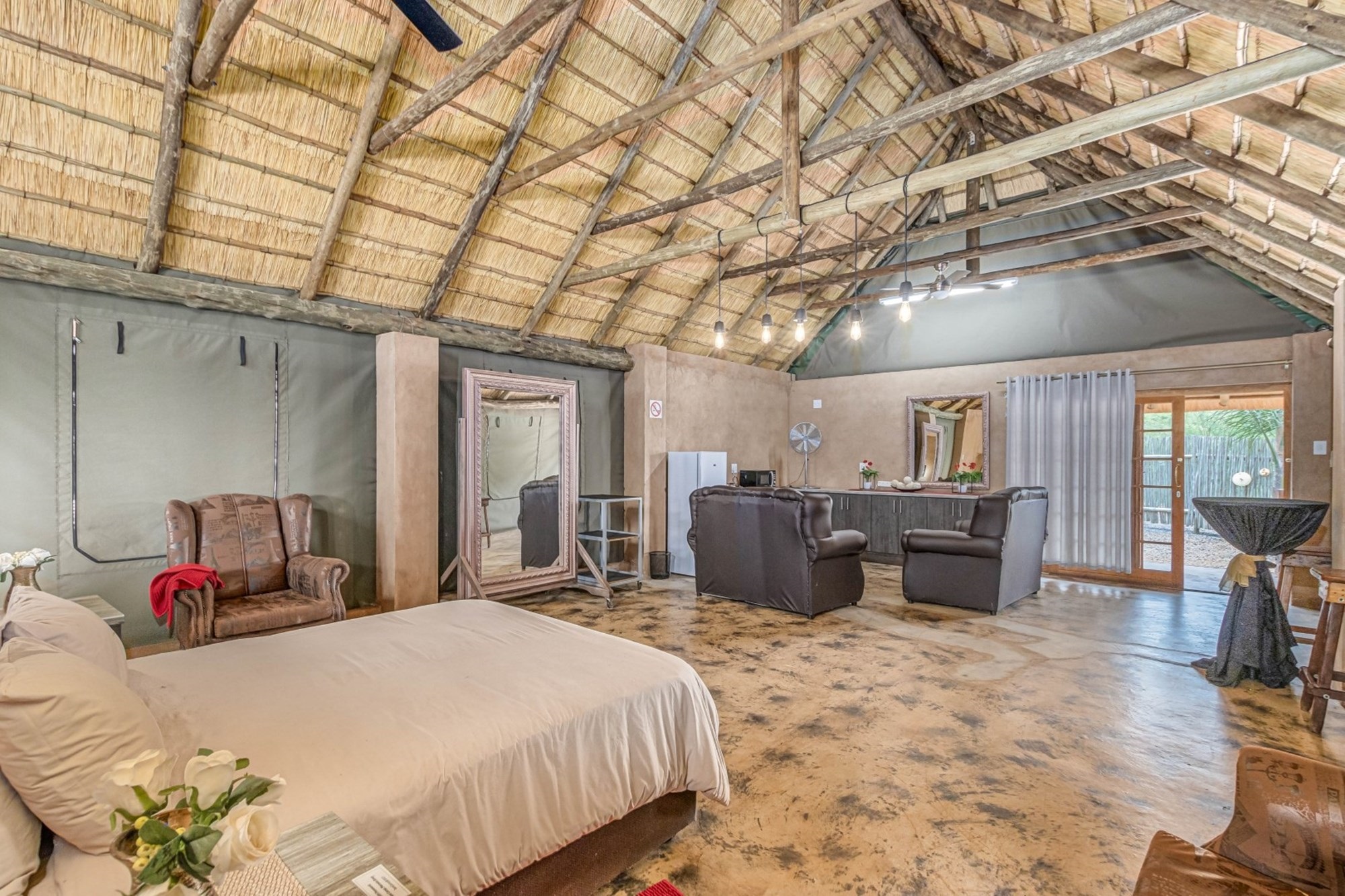 Canvas & Wood Hybrid Structure with Thatch Roof – Authentic bushveld feel.
