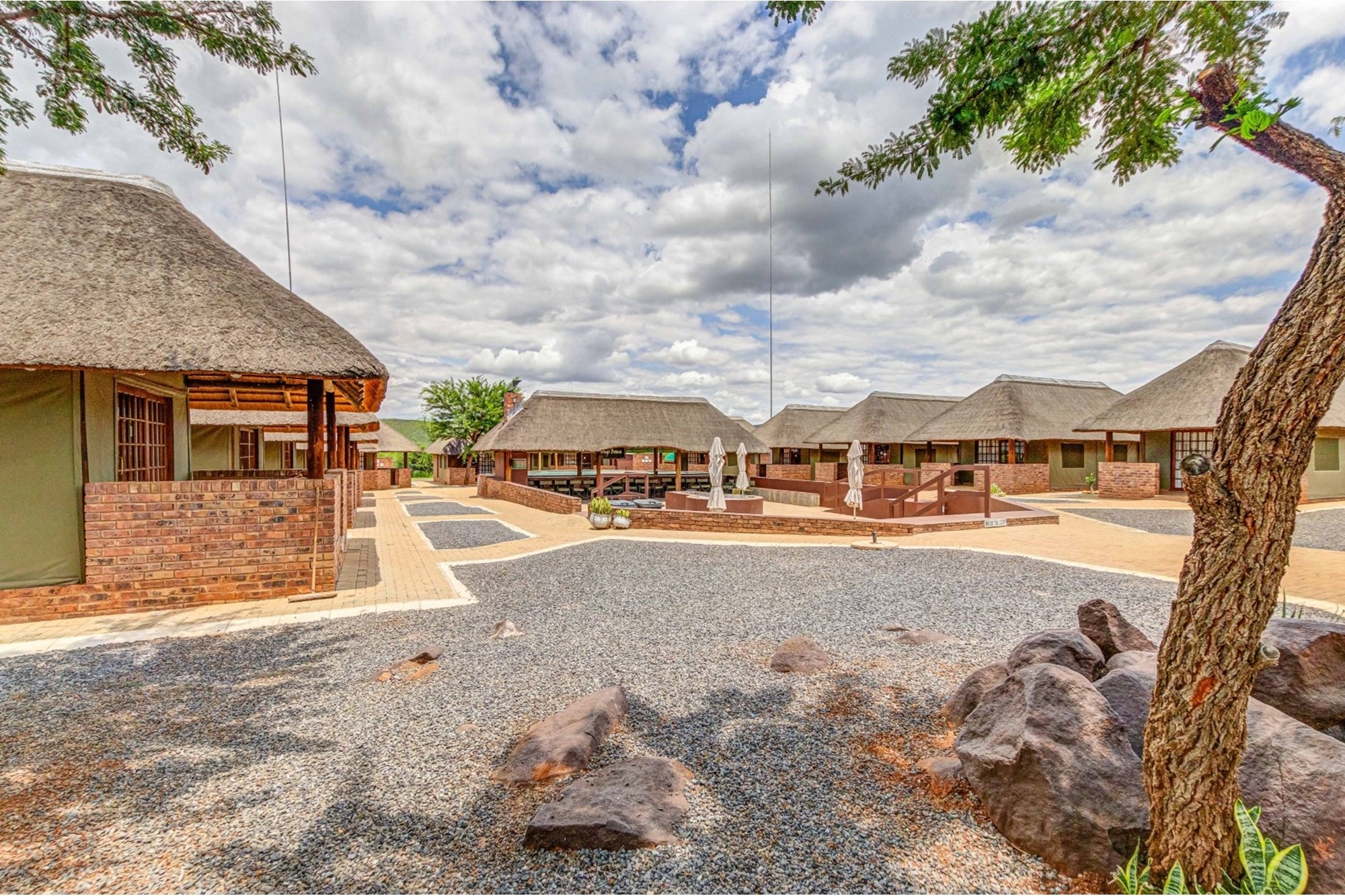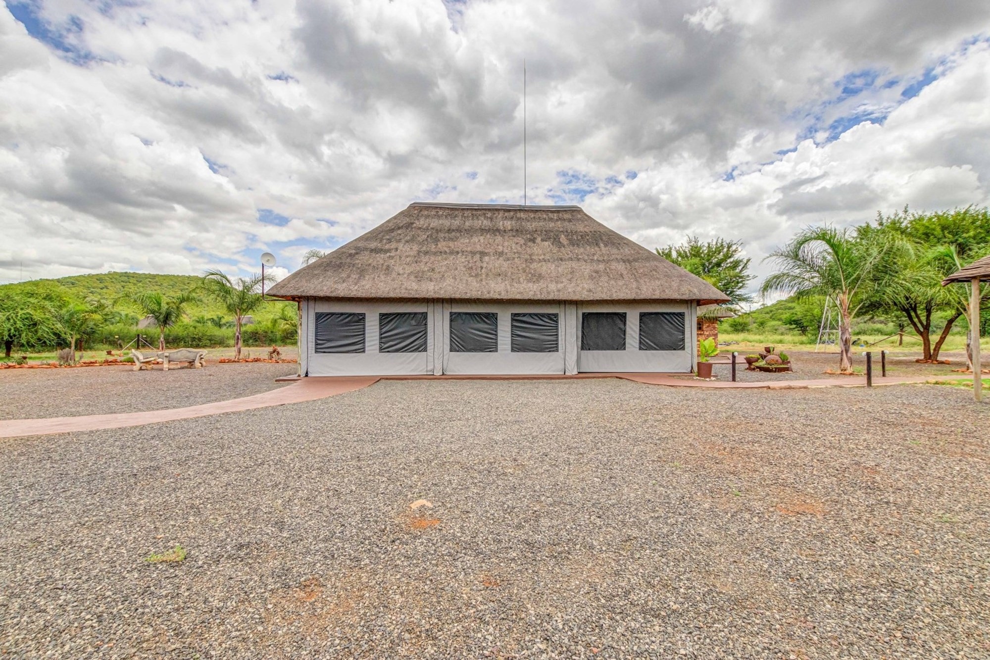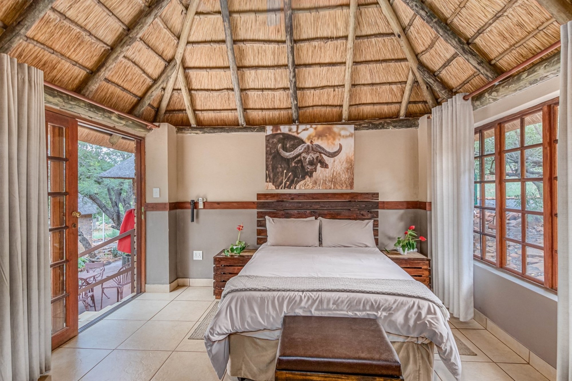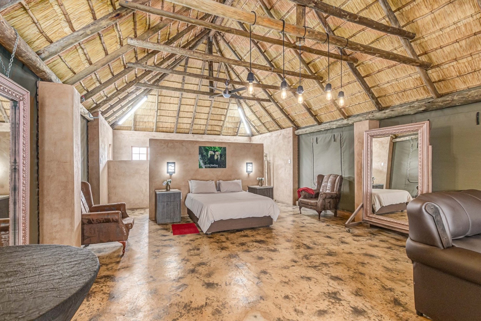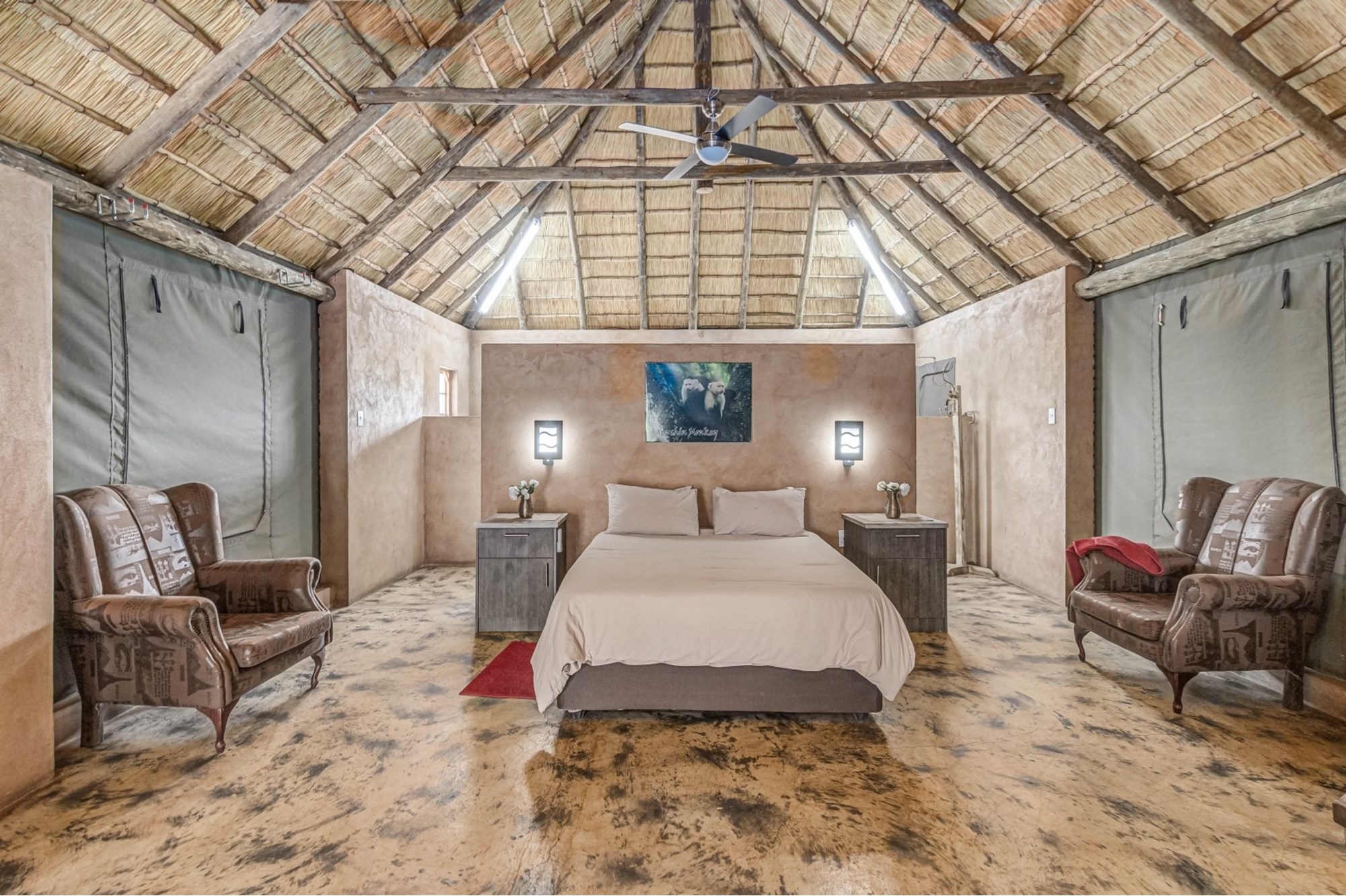 Canvas & Wood Hybrid Structure with Thatch Roof – Authentic bushveld feel.