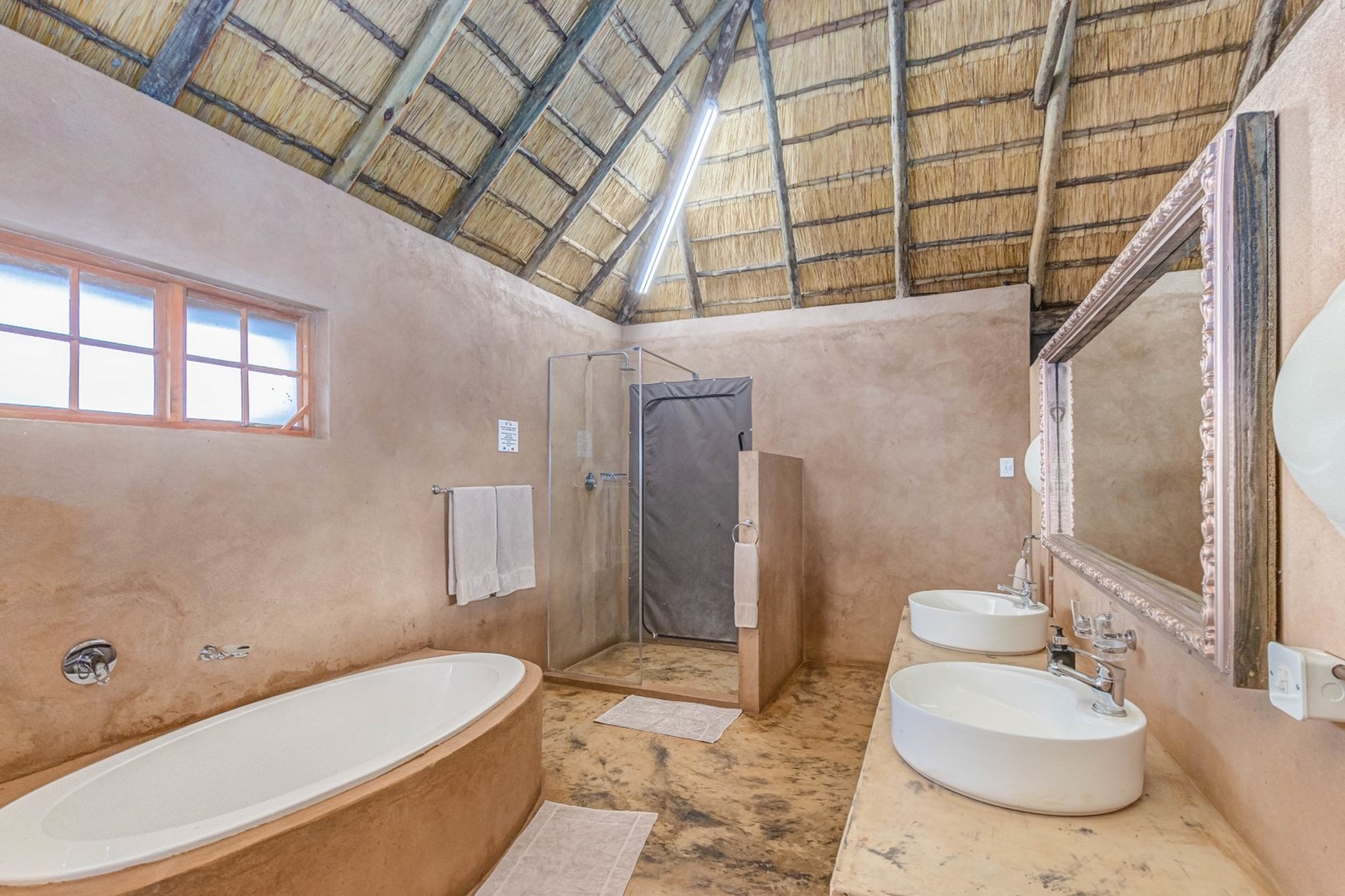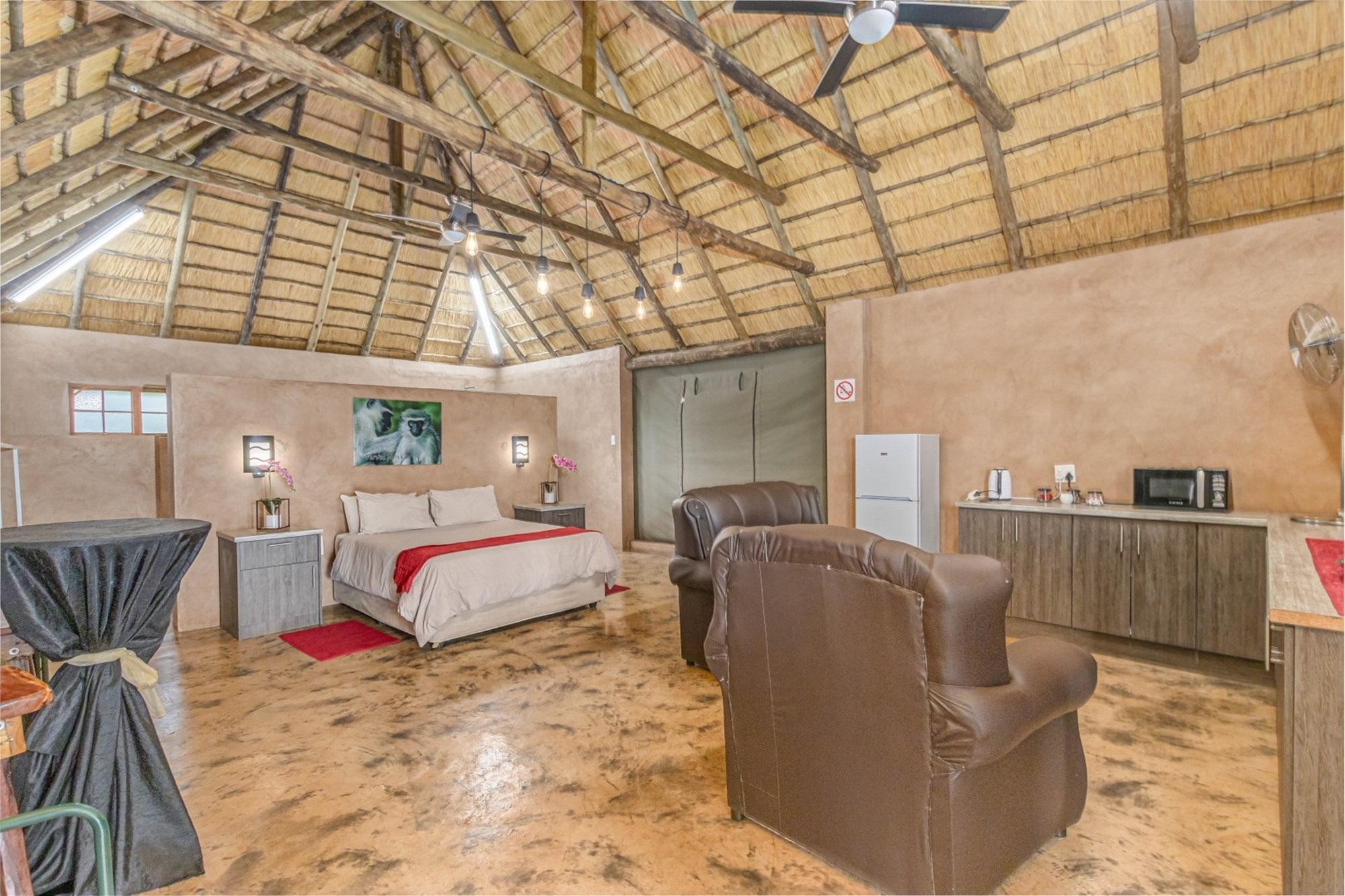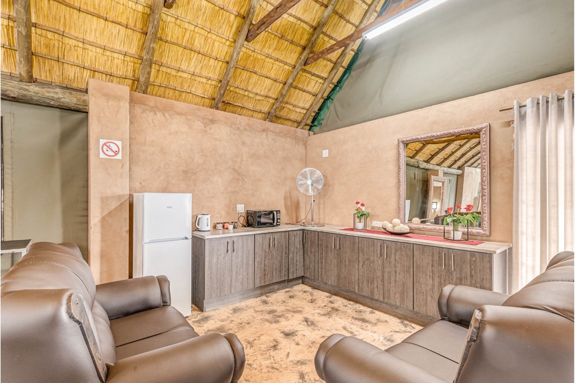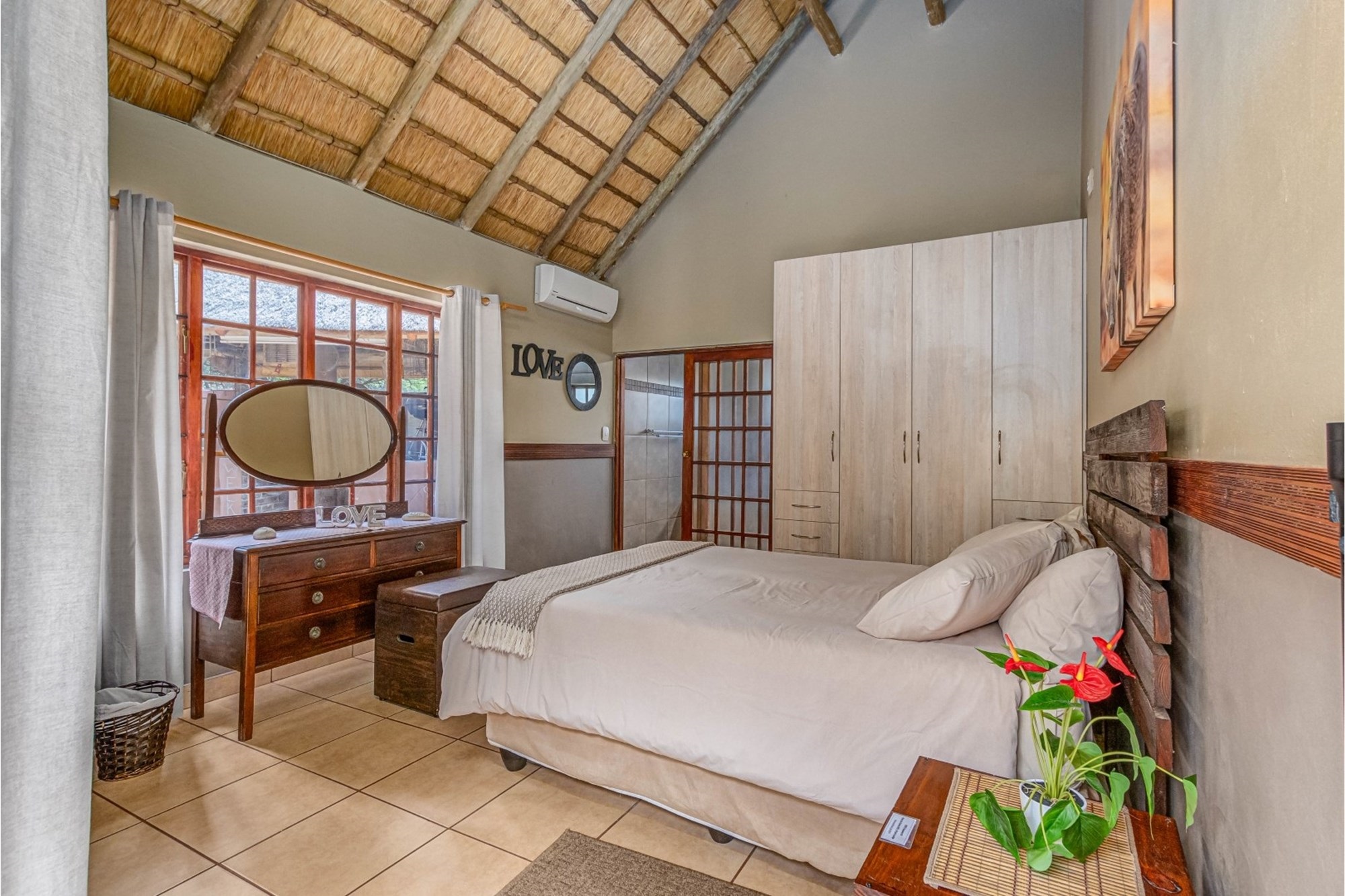 Canvas & Wood Hybrid Structure with Thatch Roof – Authentic bushveld feel.