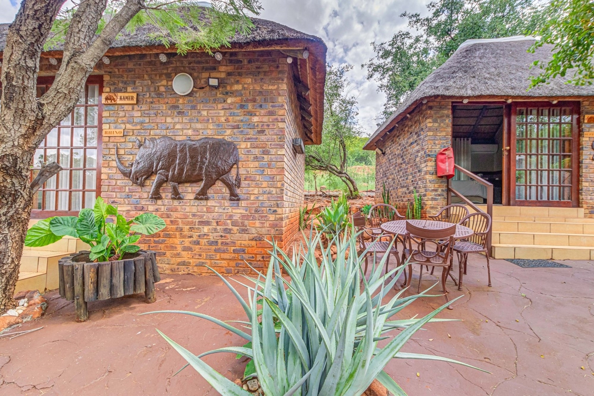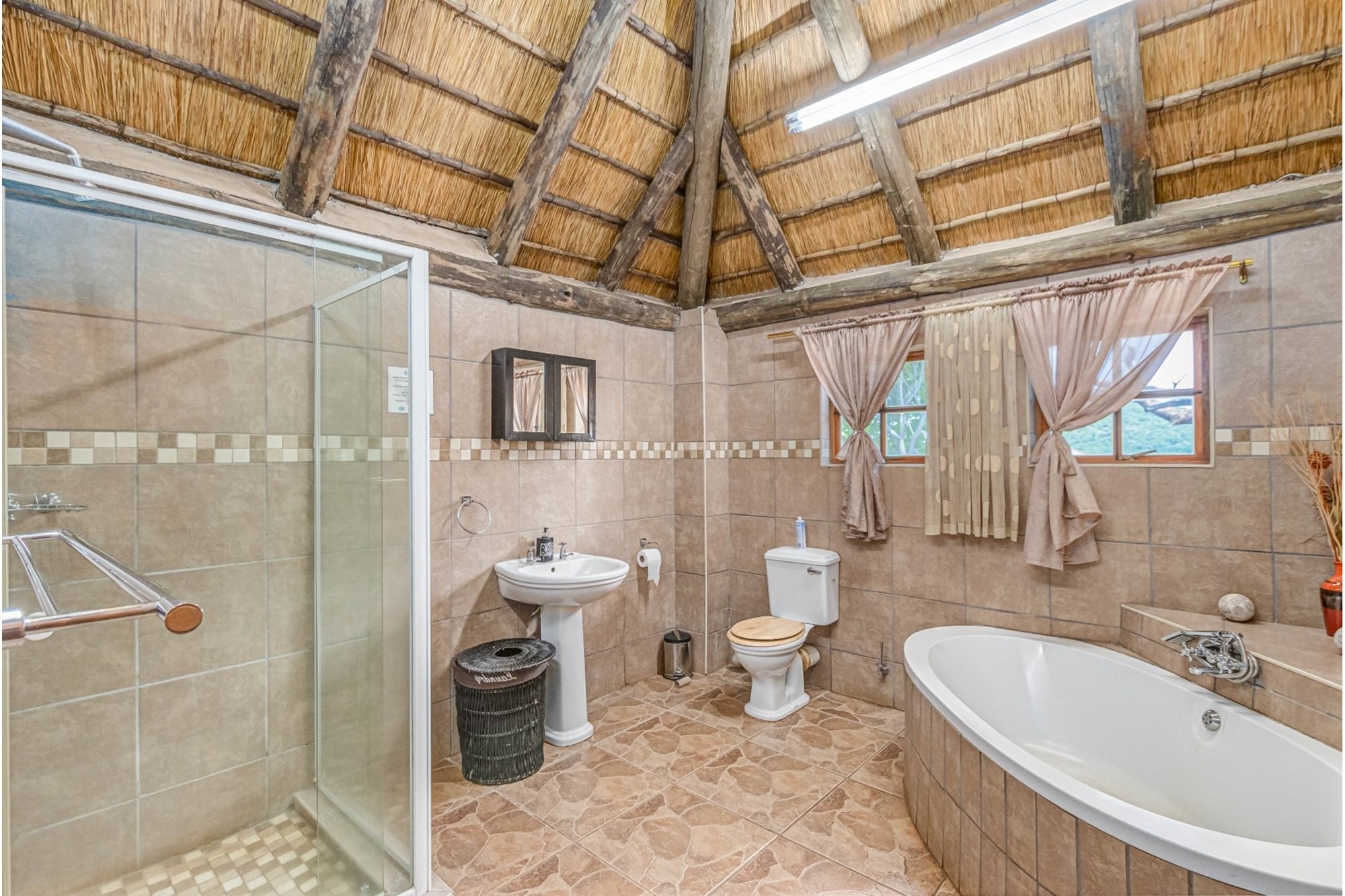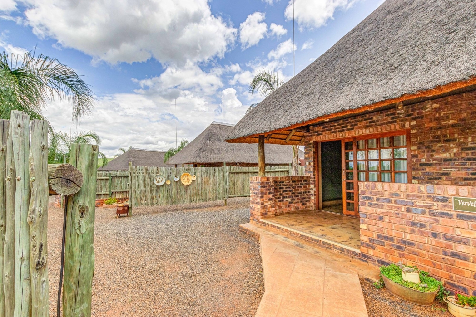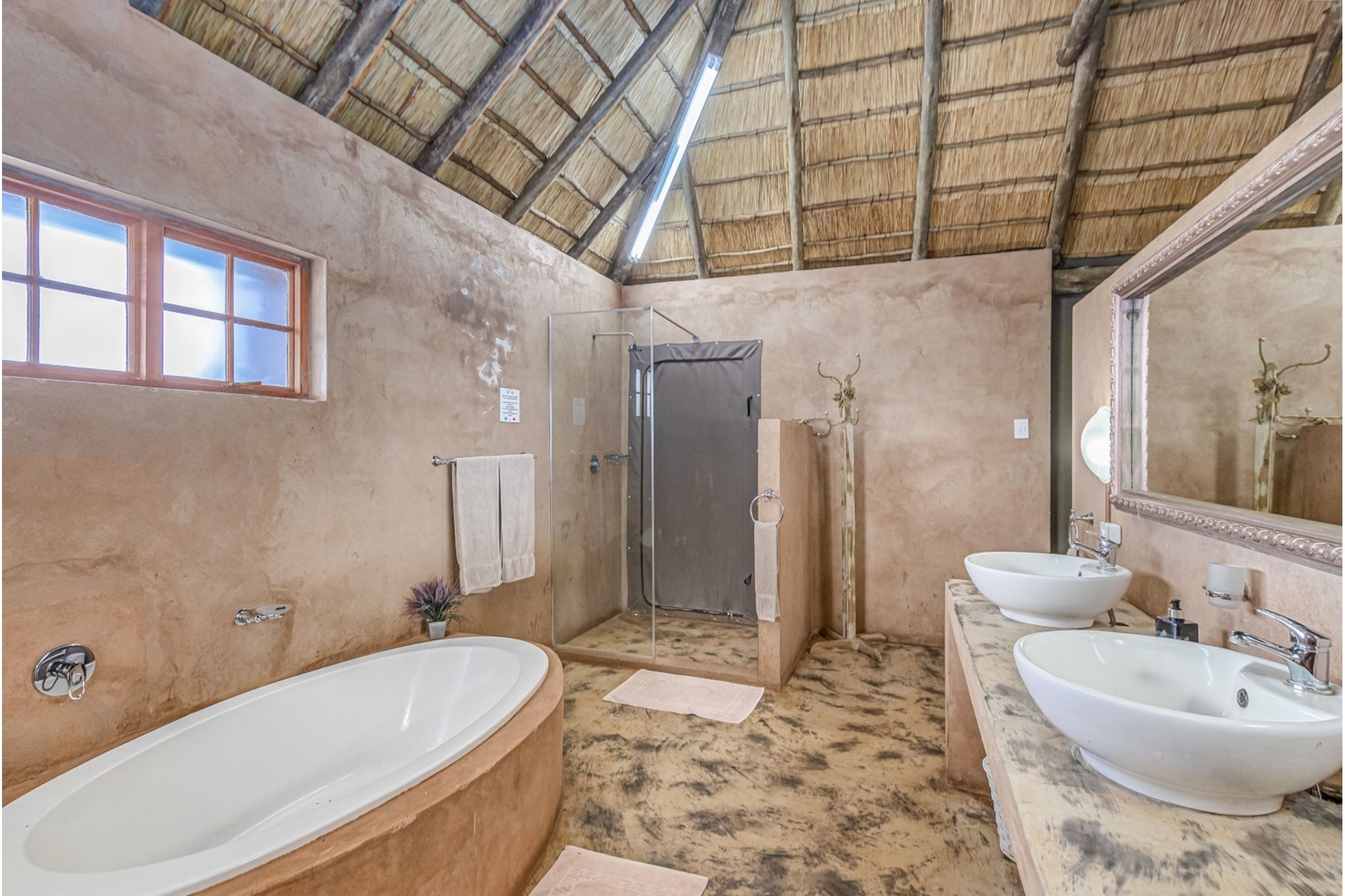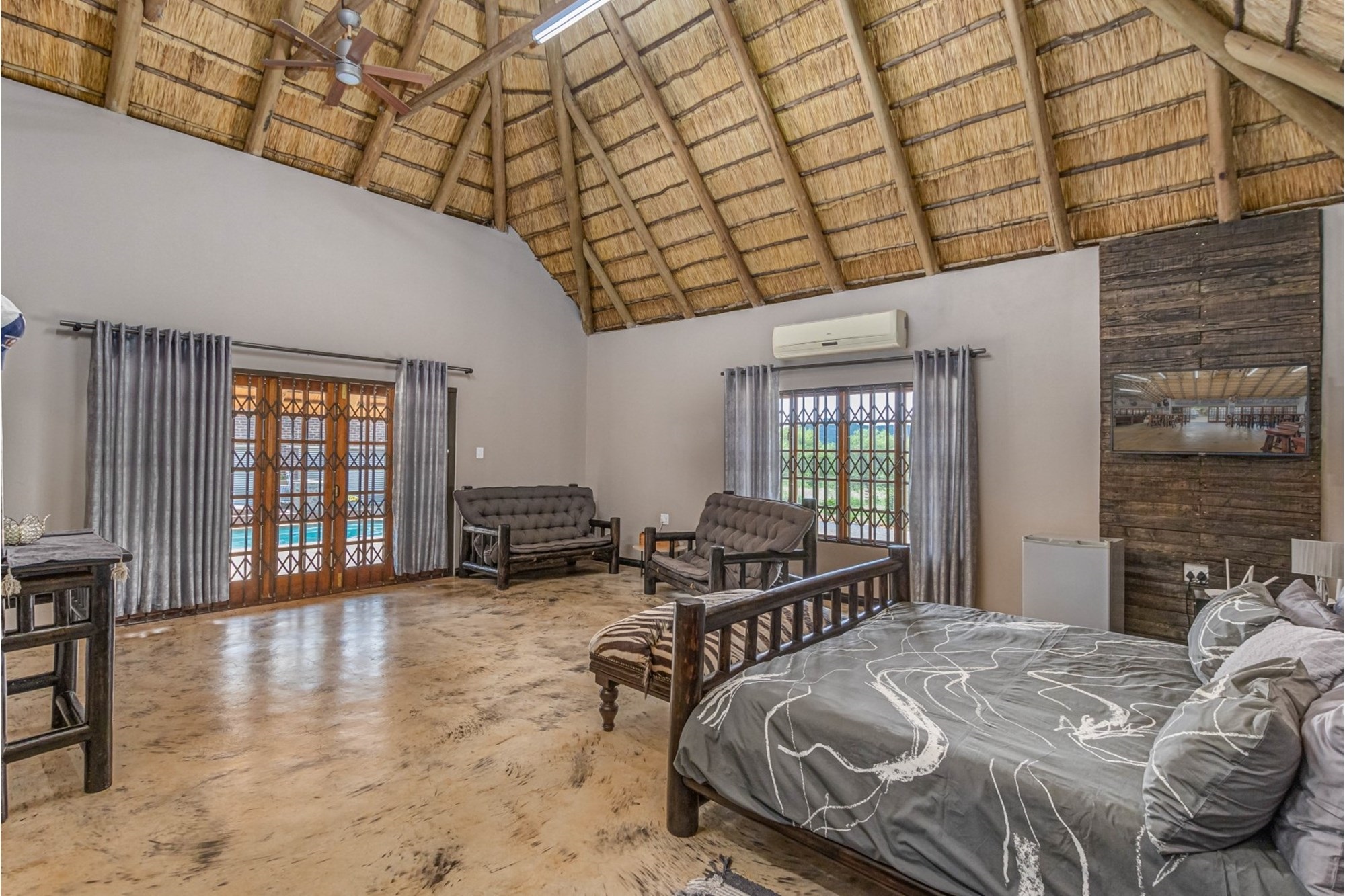 Canvas & Wood Hybrid Structure with Thatch Roof – Authentic bushveld feel.