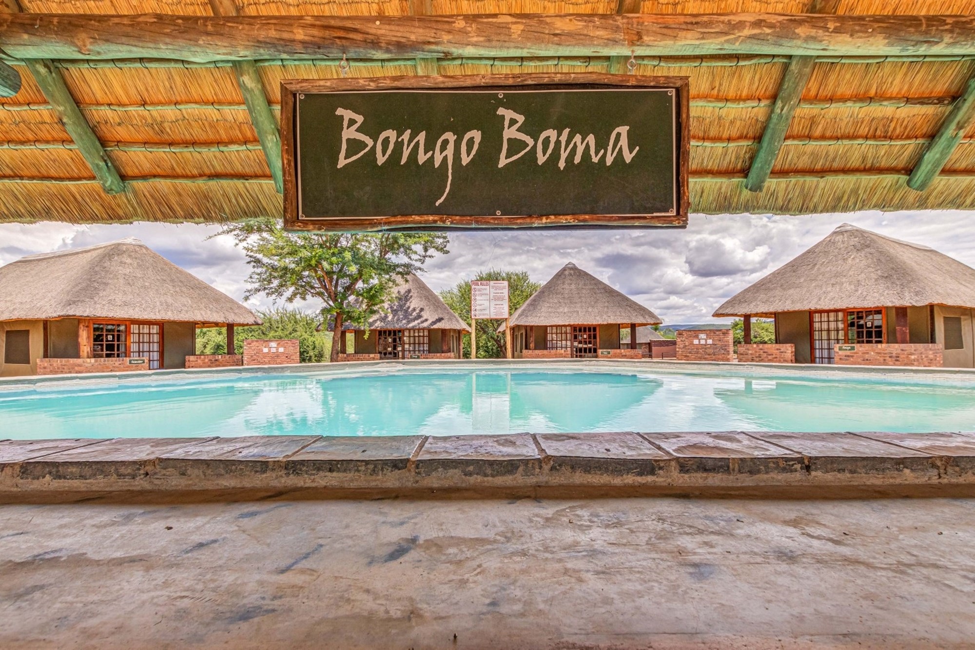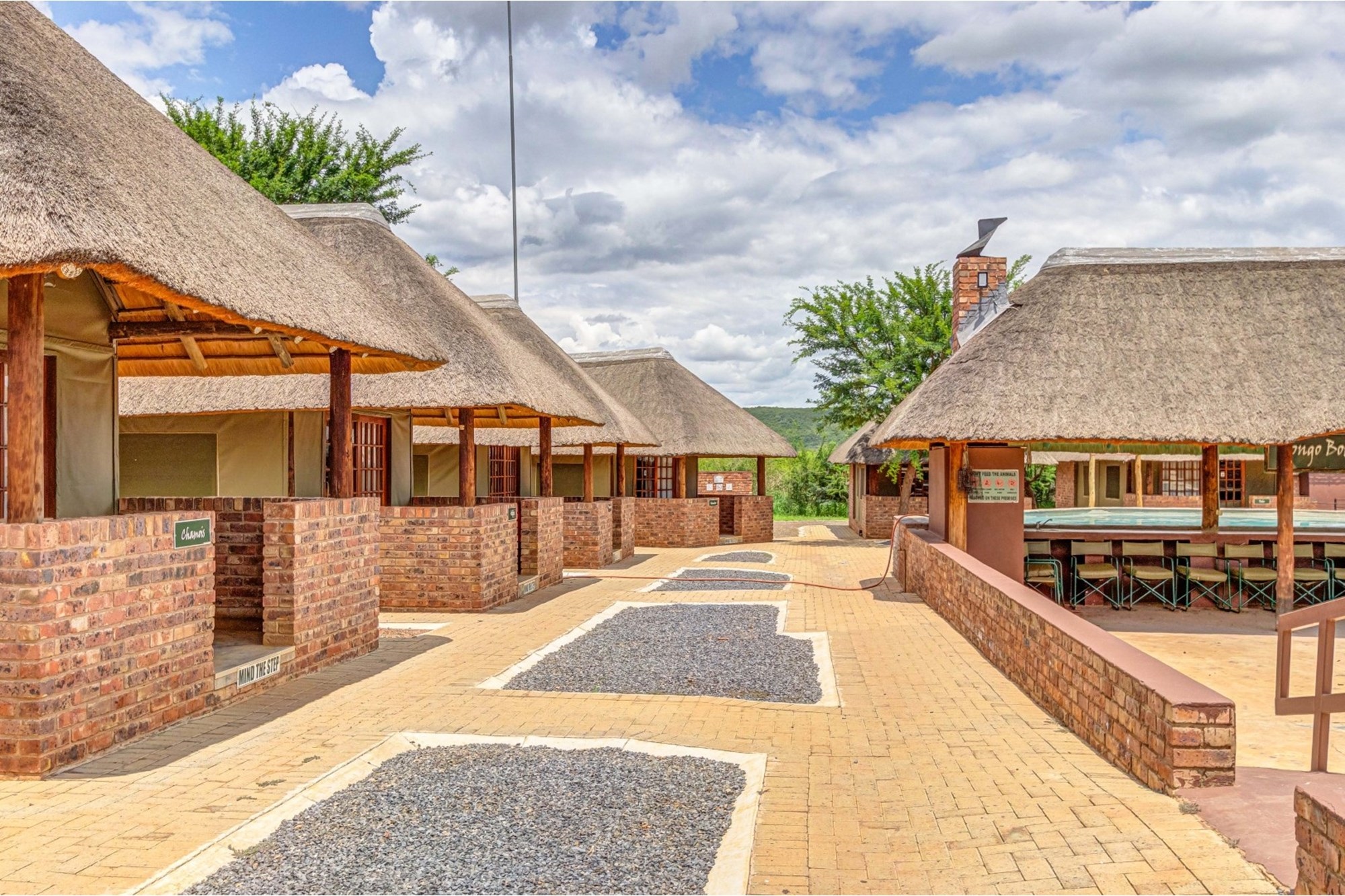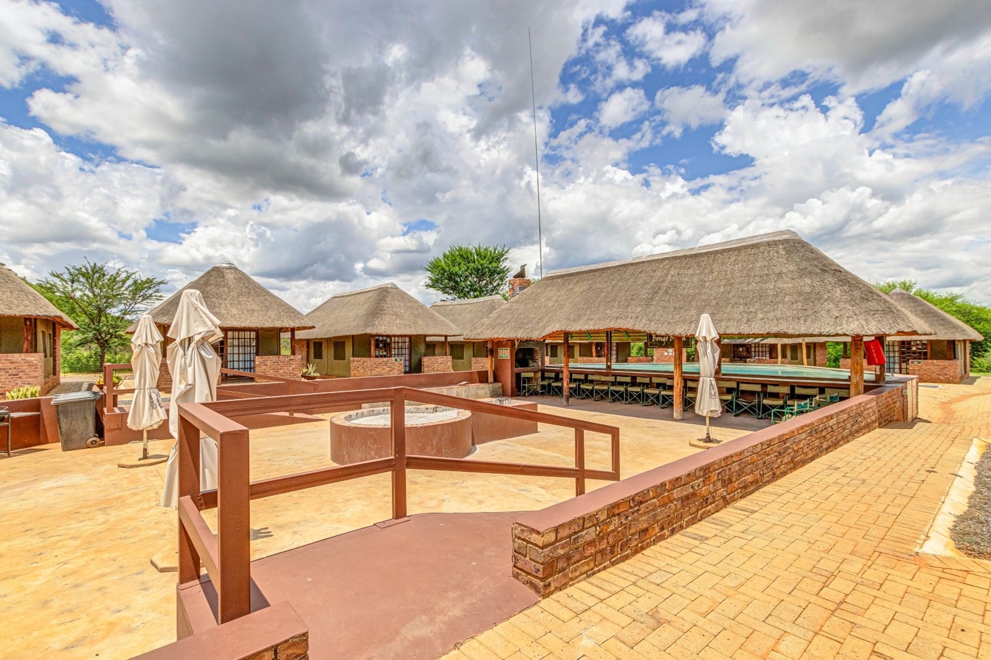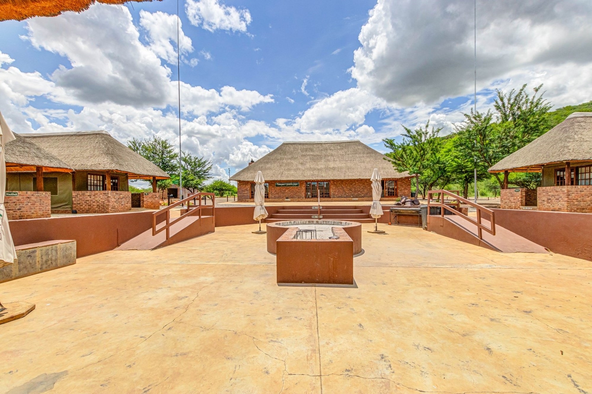 Shared Lapa – The Tented Camp and Honeymoon Chalets share a lapa with a built-in braai, leading to a sunken fire pit with seating while partly covering the swimming pool.