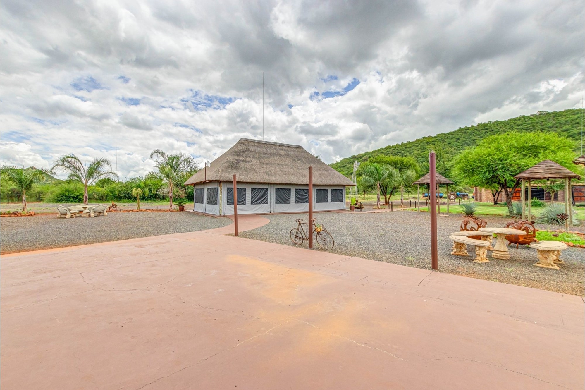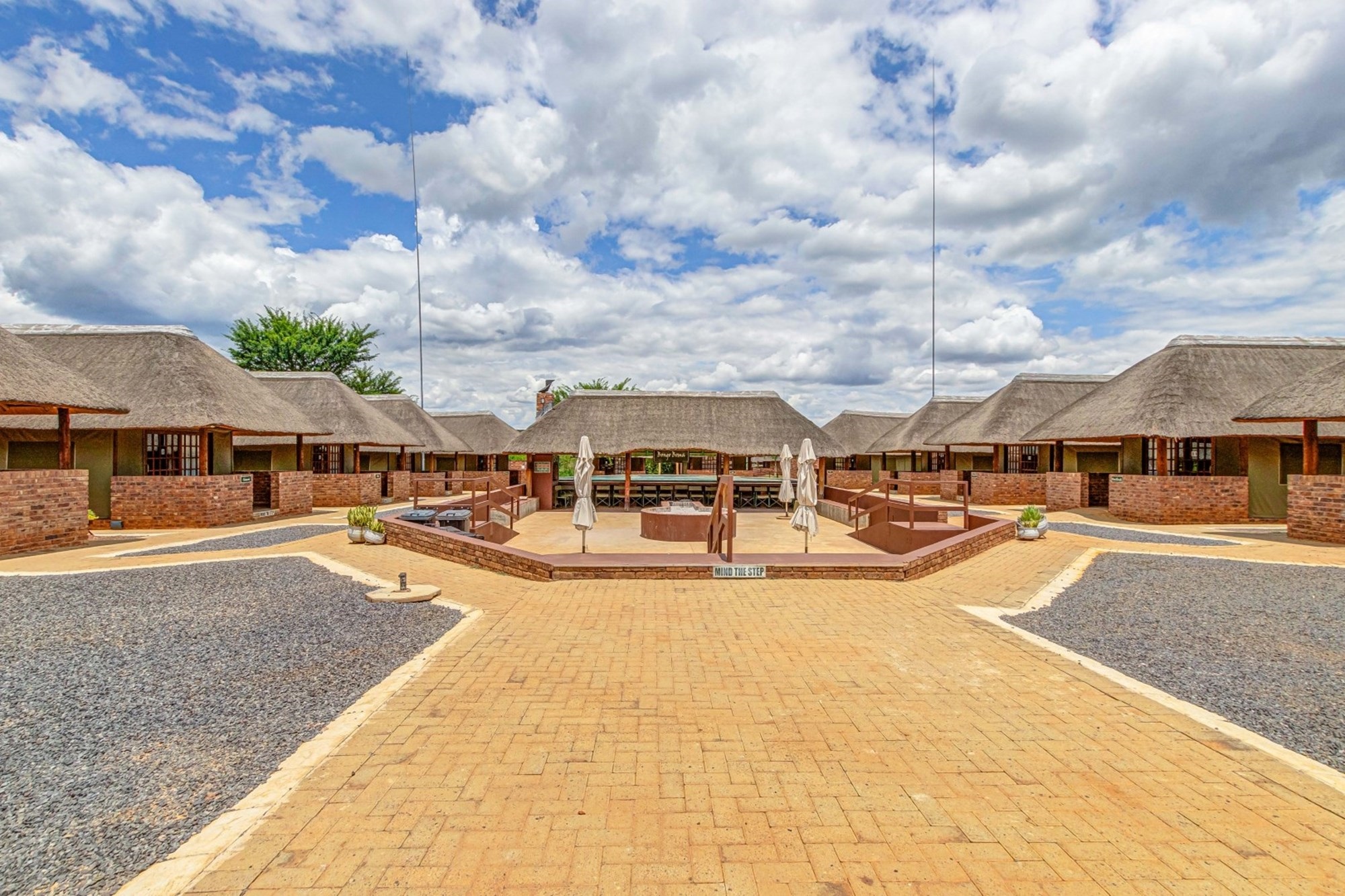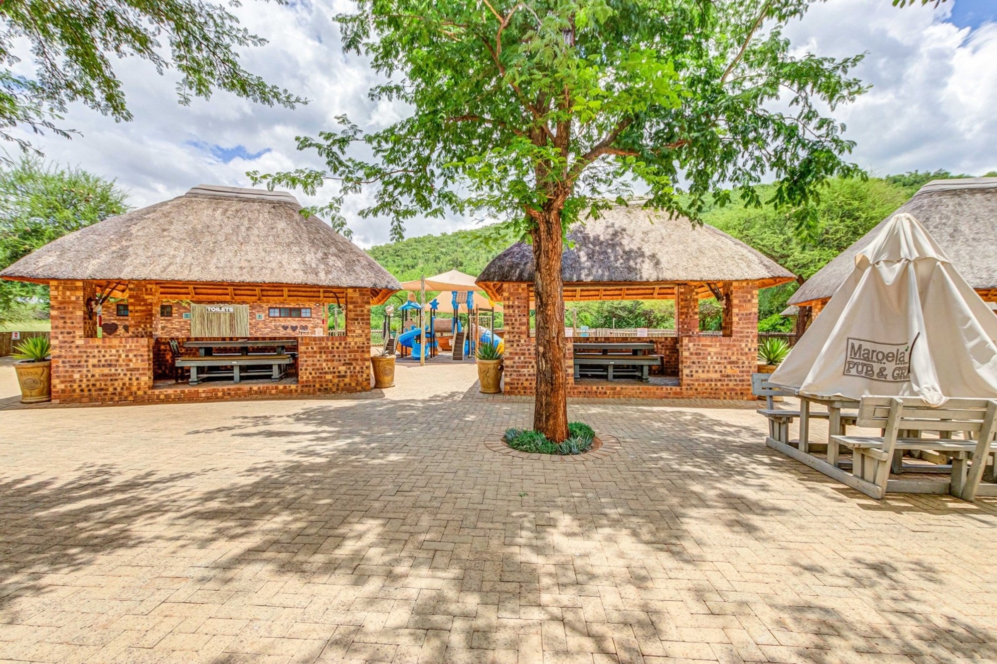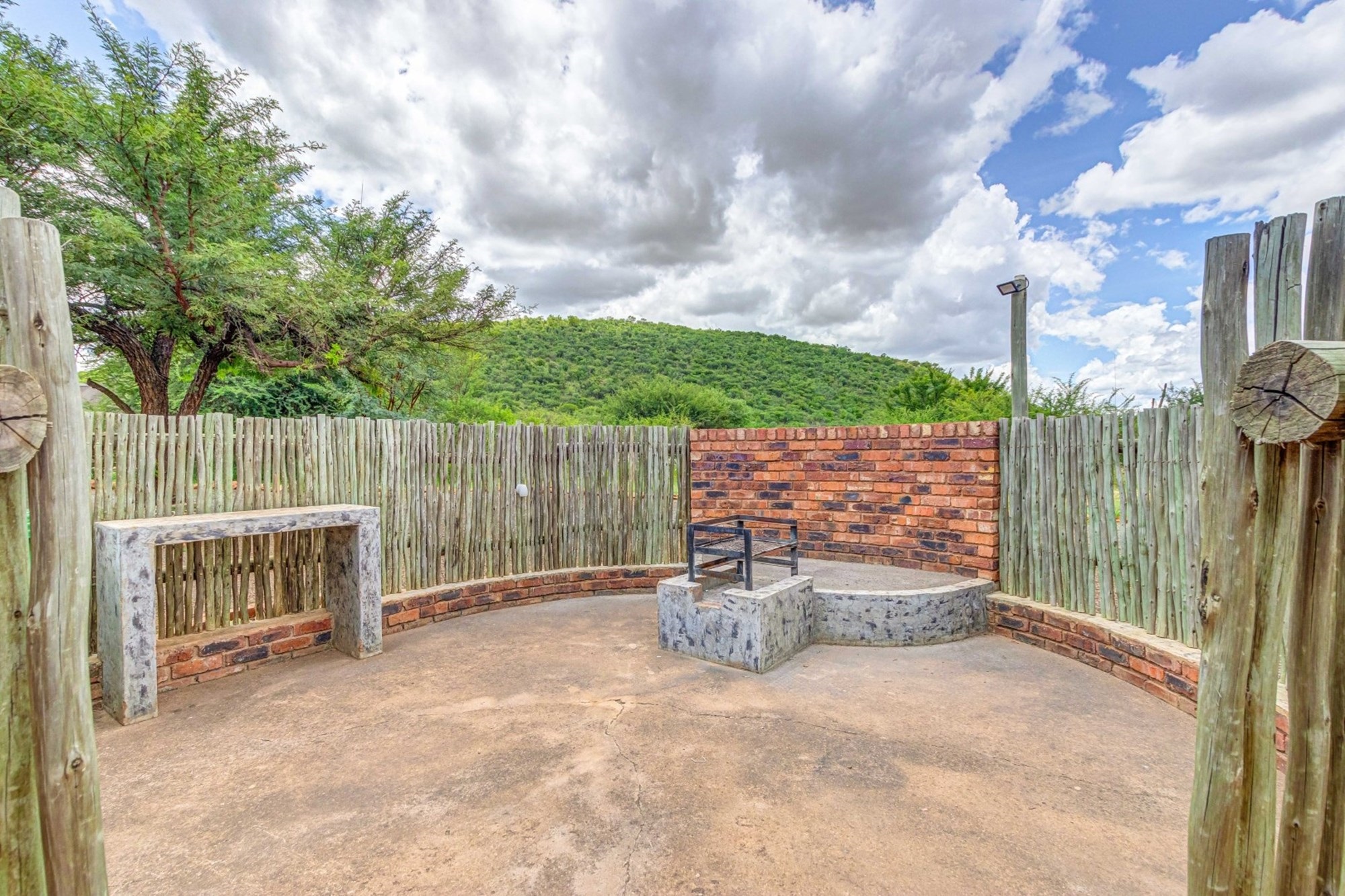 Shared Lapa – The Tented Camp and Honeymoon Chalets share a lapa with a built-in braai, leading to a sunken fire pit with seating while partly covering the swimming pool.