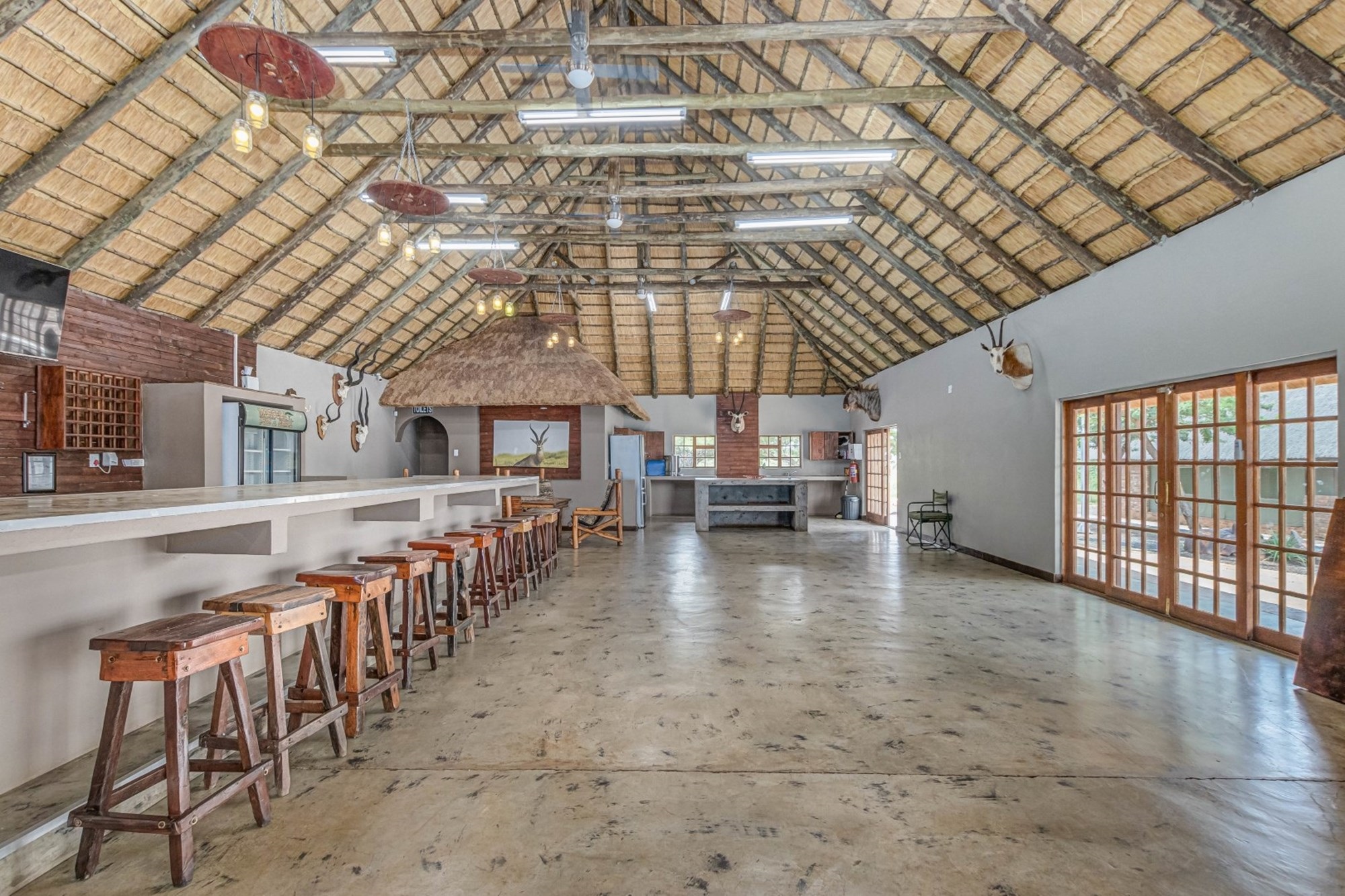 Restaurant & Lounge – Polished concrete floors, open dining, and fast-food service kitchen.