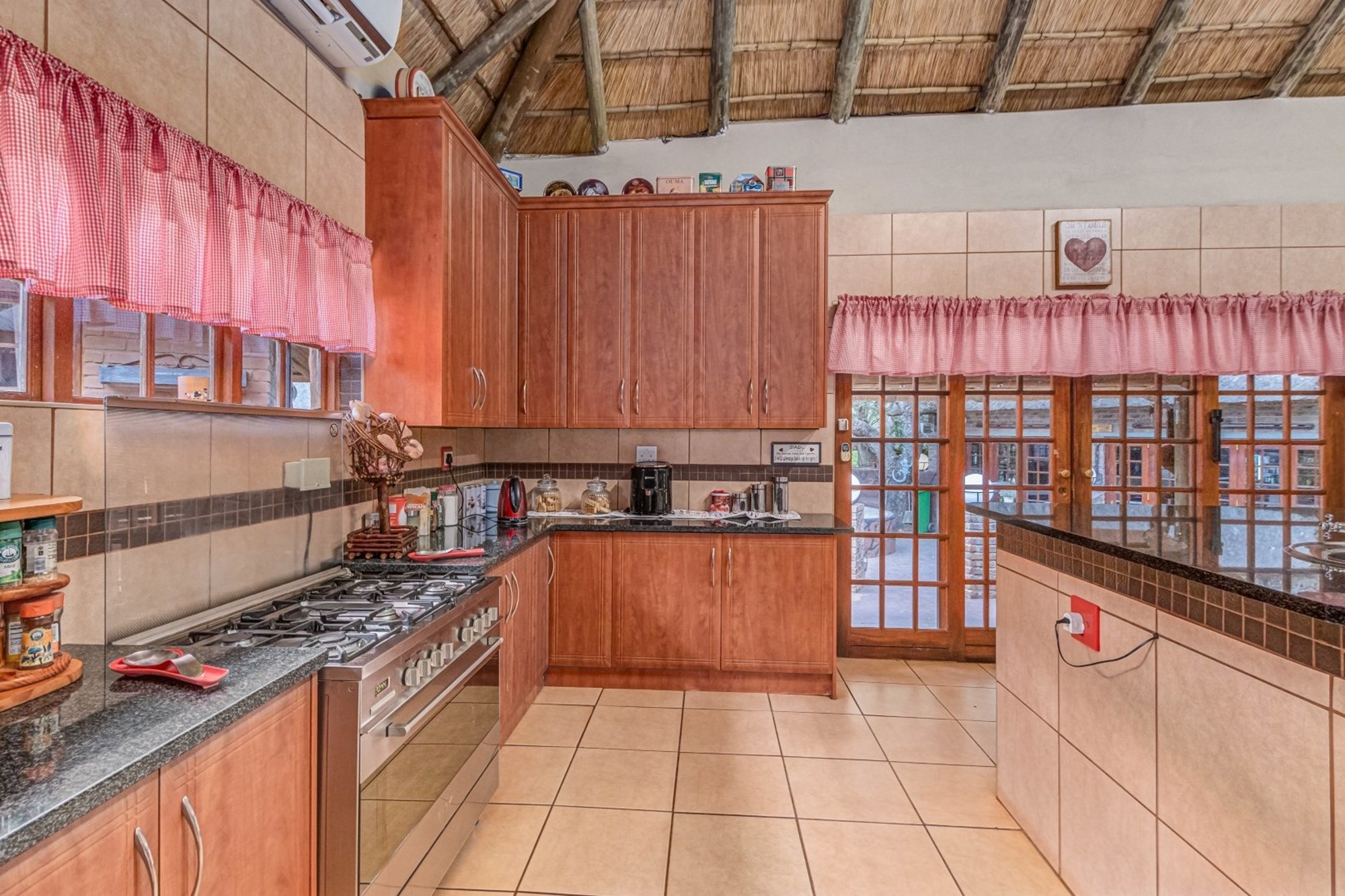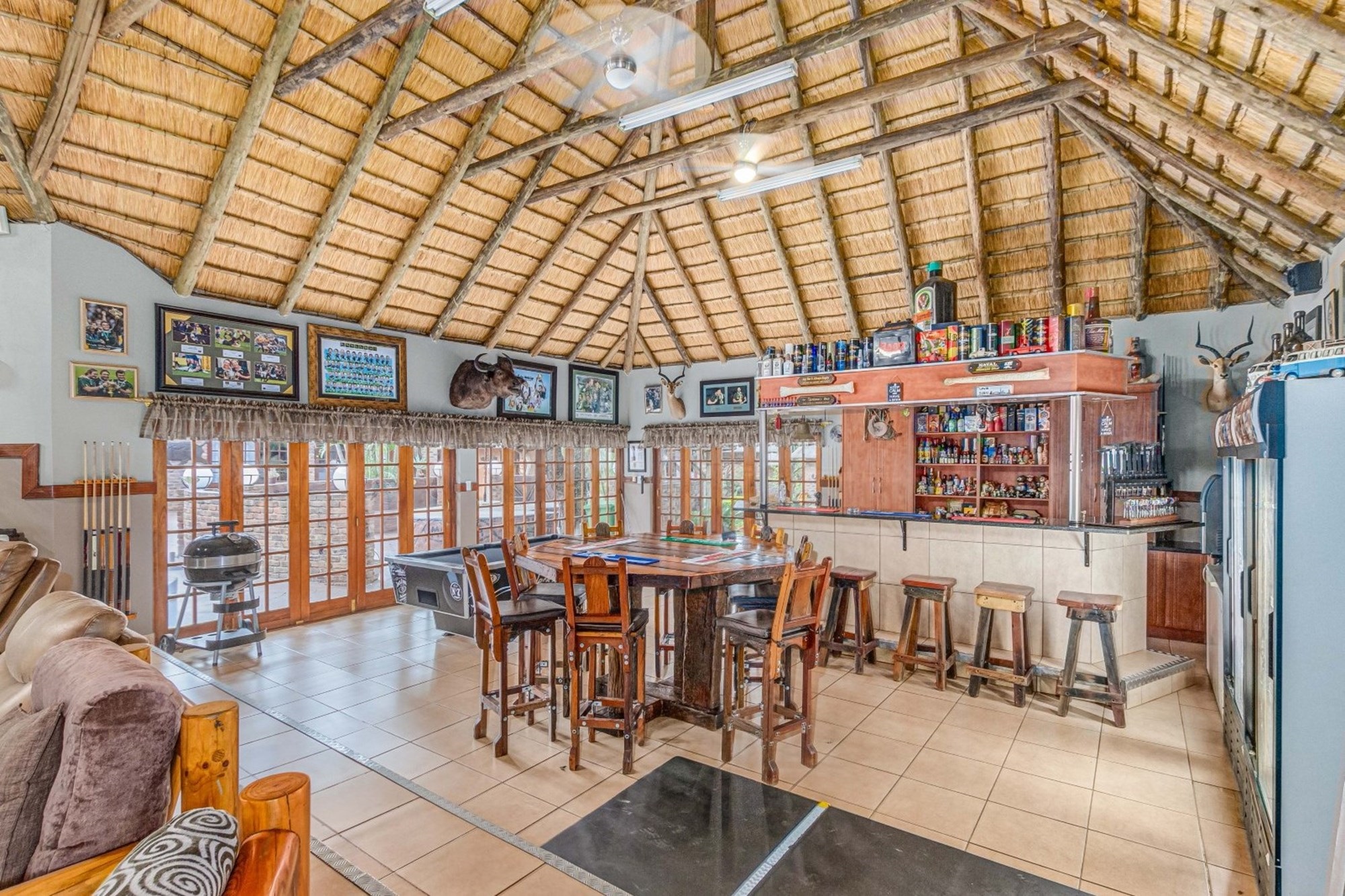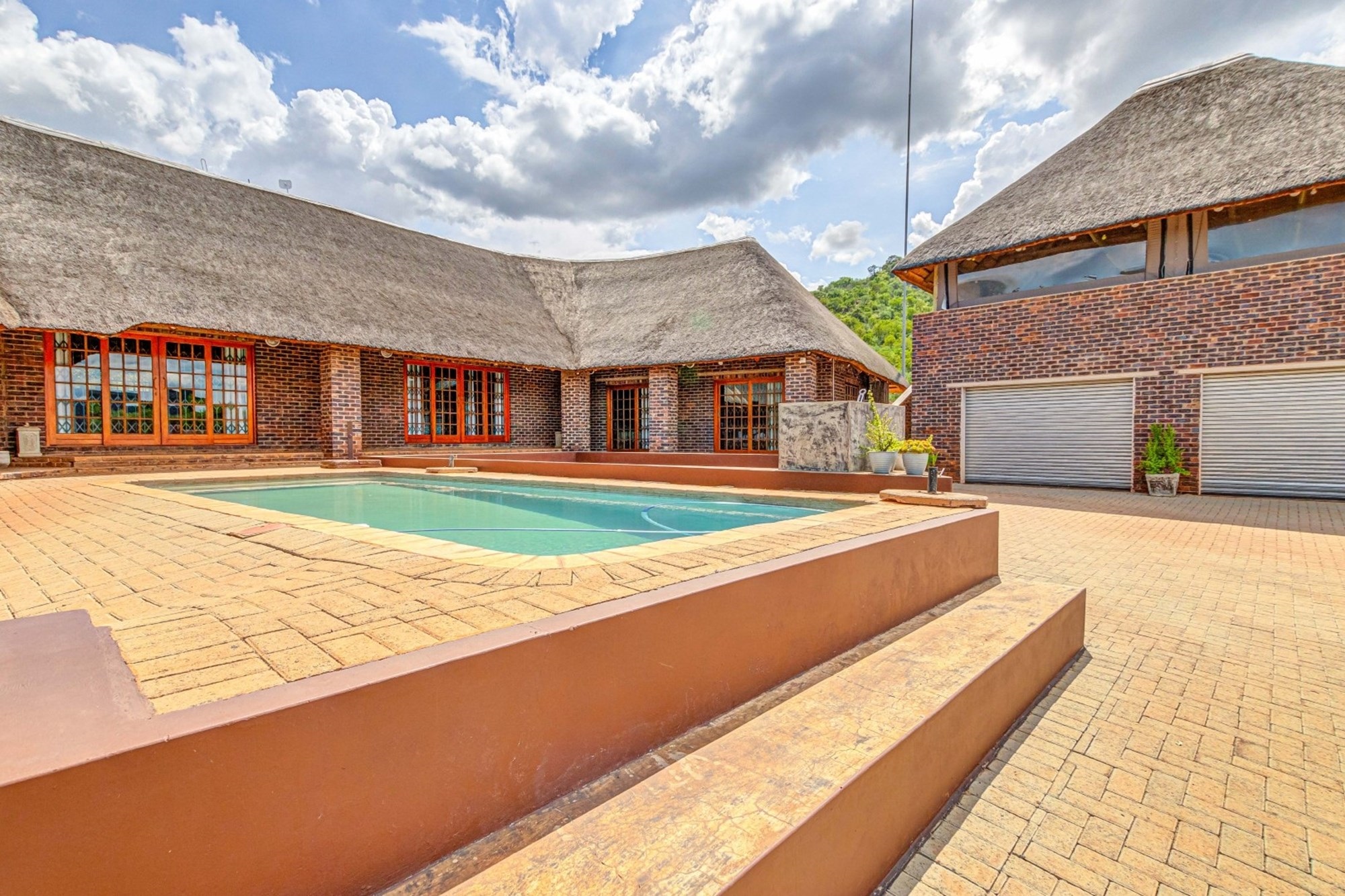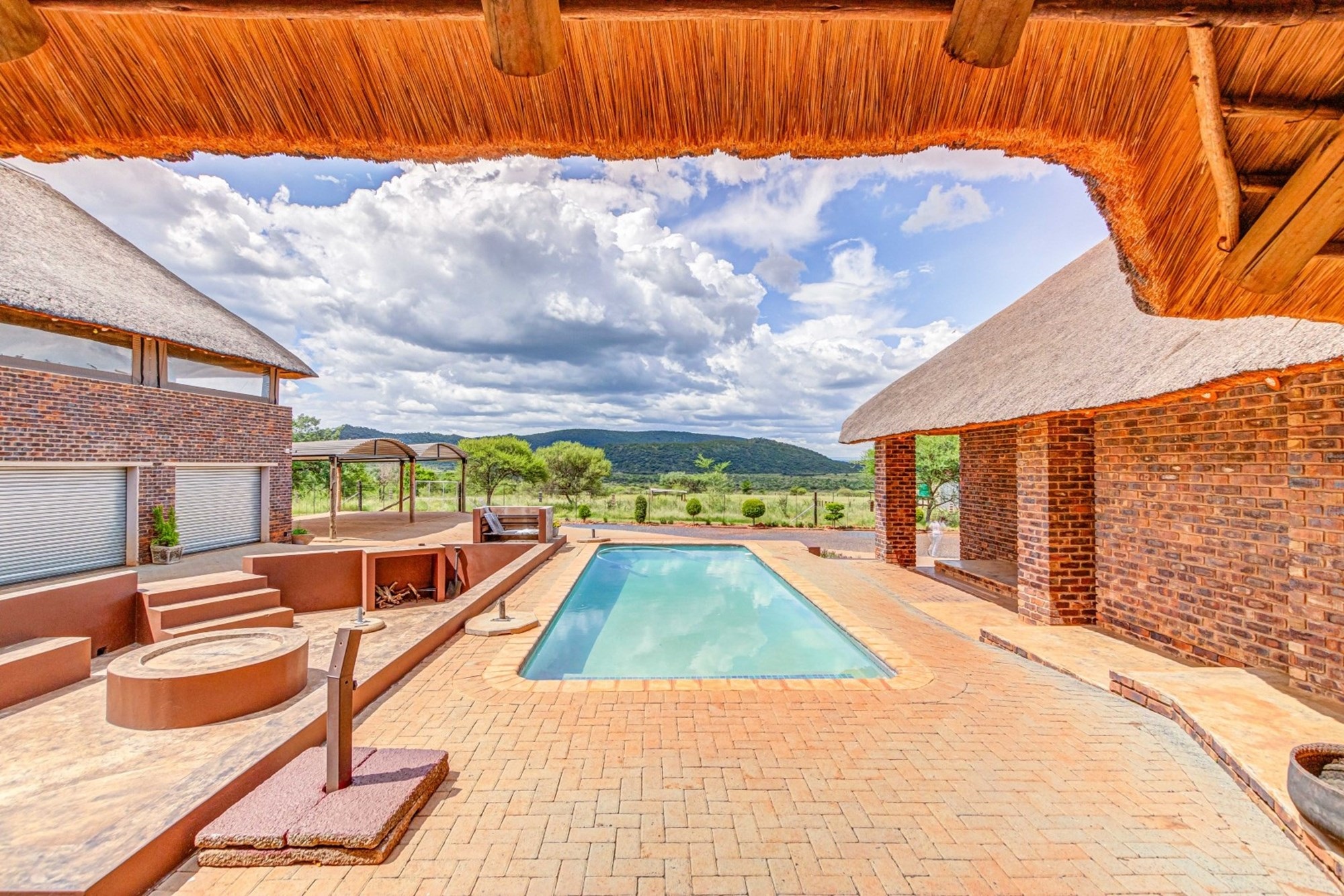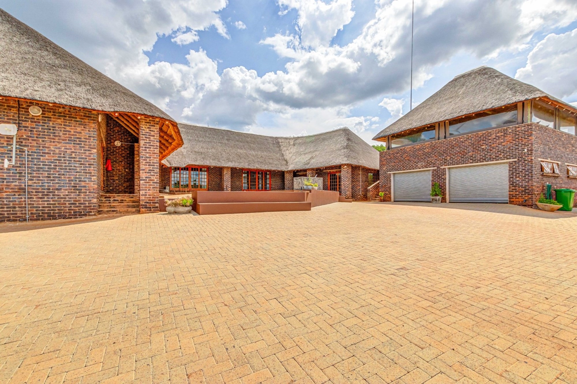 Double Automated Garage with Entertainment Area on the Top Floor – Featuring a thatched roof, enclosed with brick and canvas patio covers.