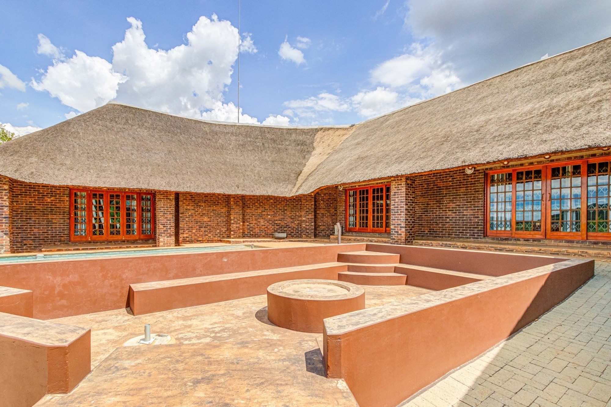 Private Lapa with Built-in Braai – Leading to a sunken fire pit with seating, partly covering the above-ground swimming pool, enhancing outdoor entertainment.