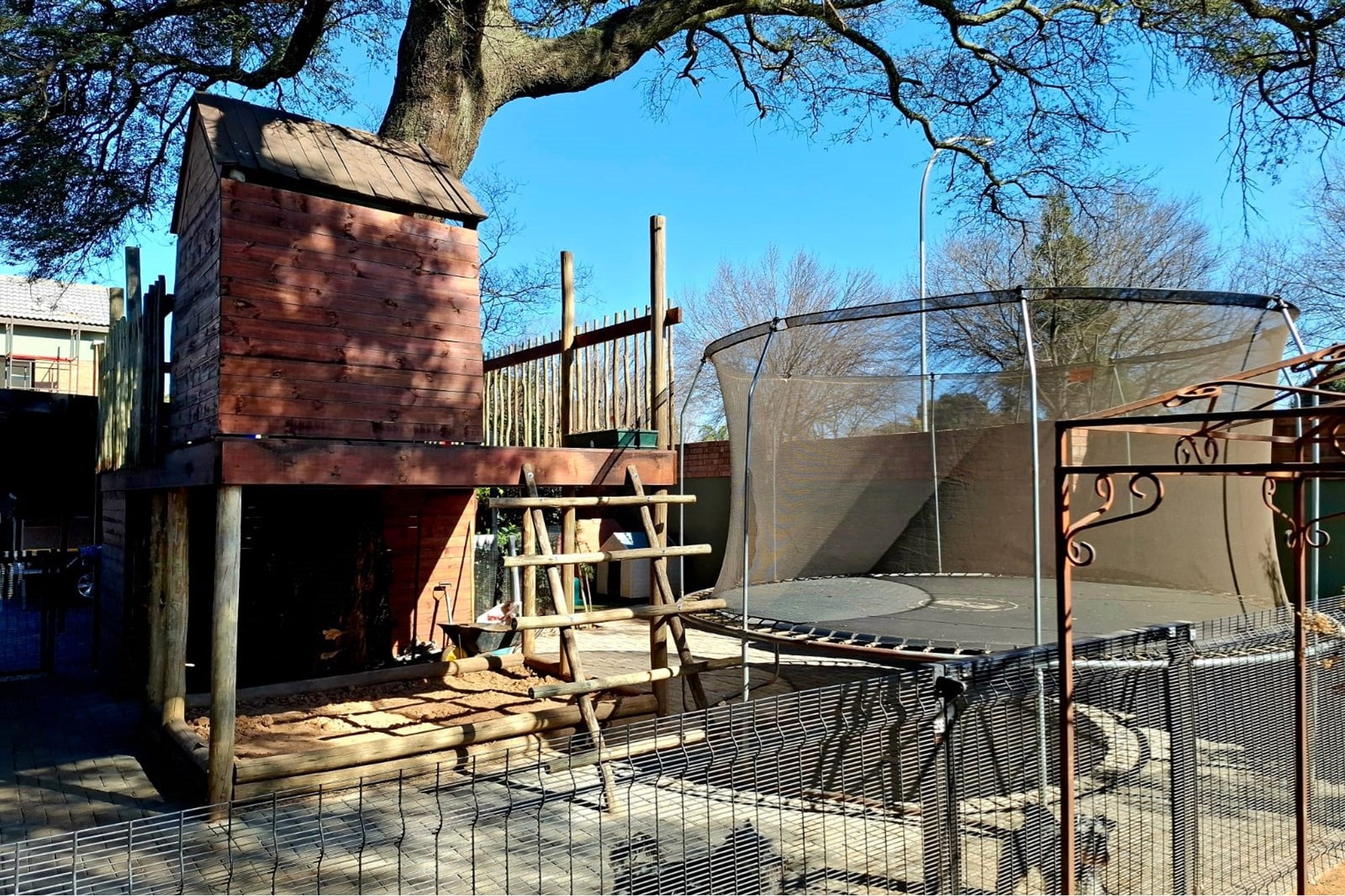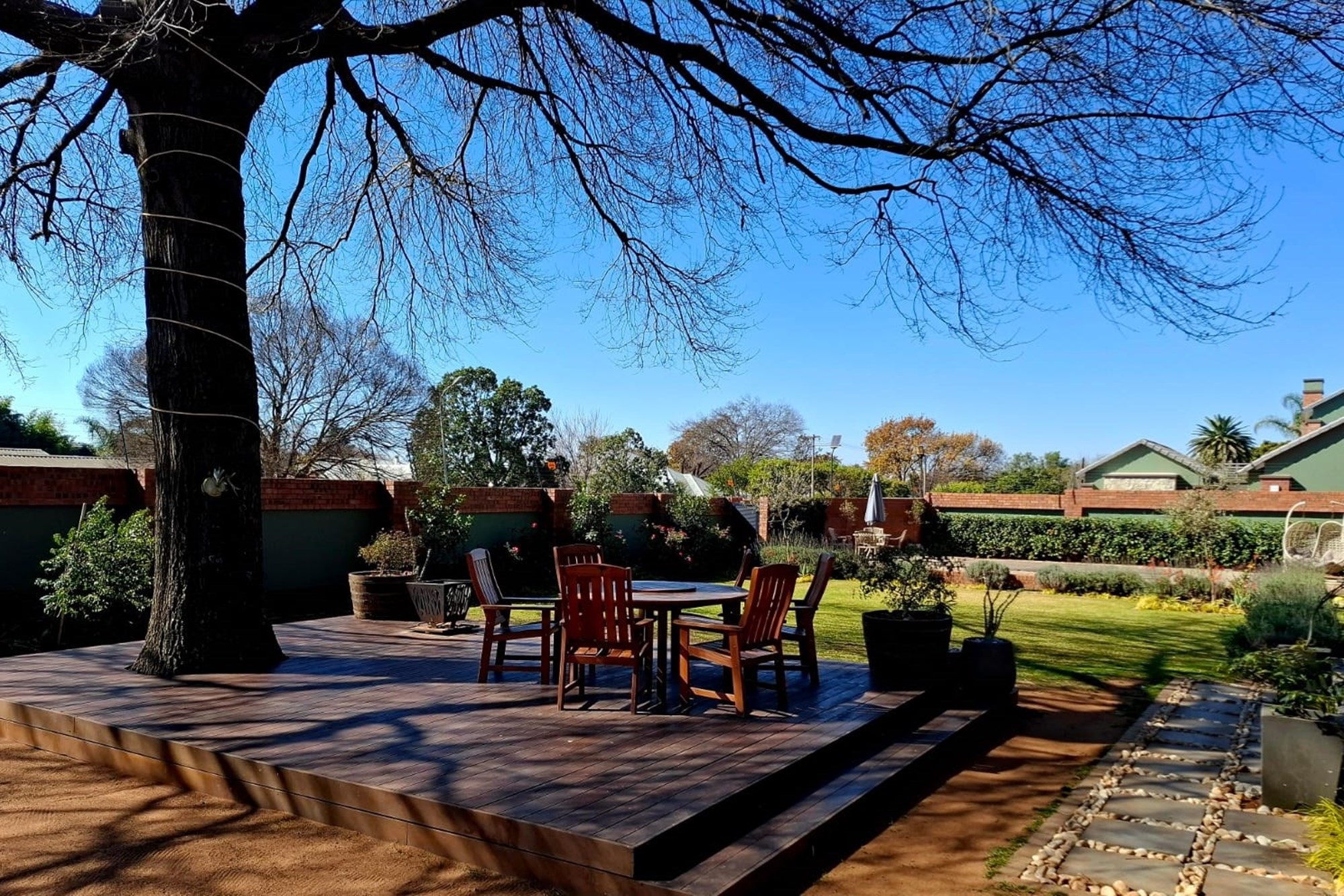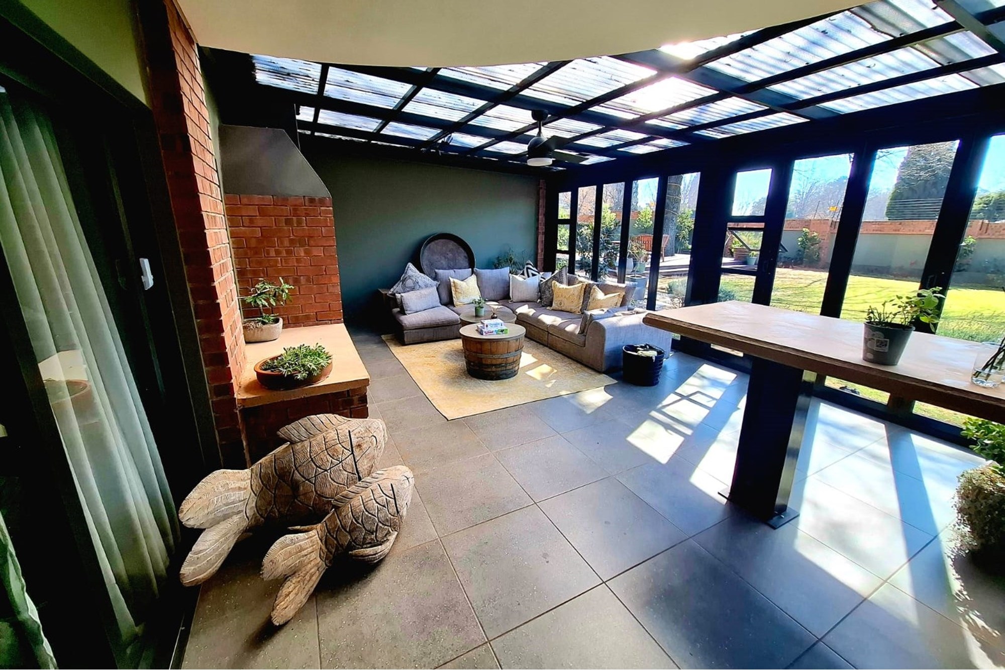 A separate family room opens up to an exceptional entertainment area – a fully enclosed braai room with built-in braai, seamlessly connected to the landscaped garden. Step outside to a heated swimming pool, covered patio with boma braai, and a wooden deck nestled under a large tree – the perfect spot for relaxed outdoor gatherings or quiet moments in nature.