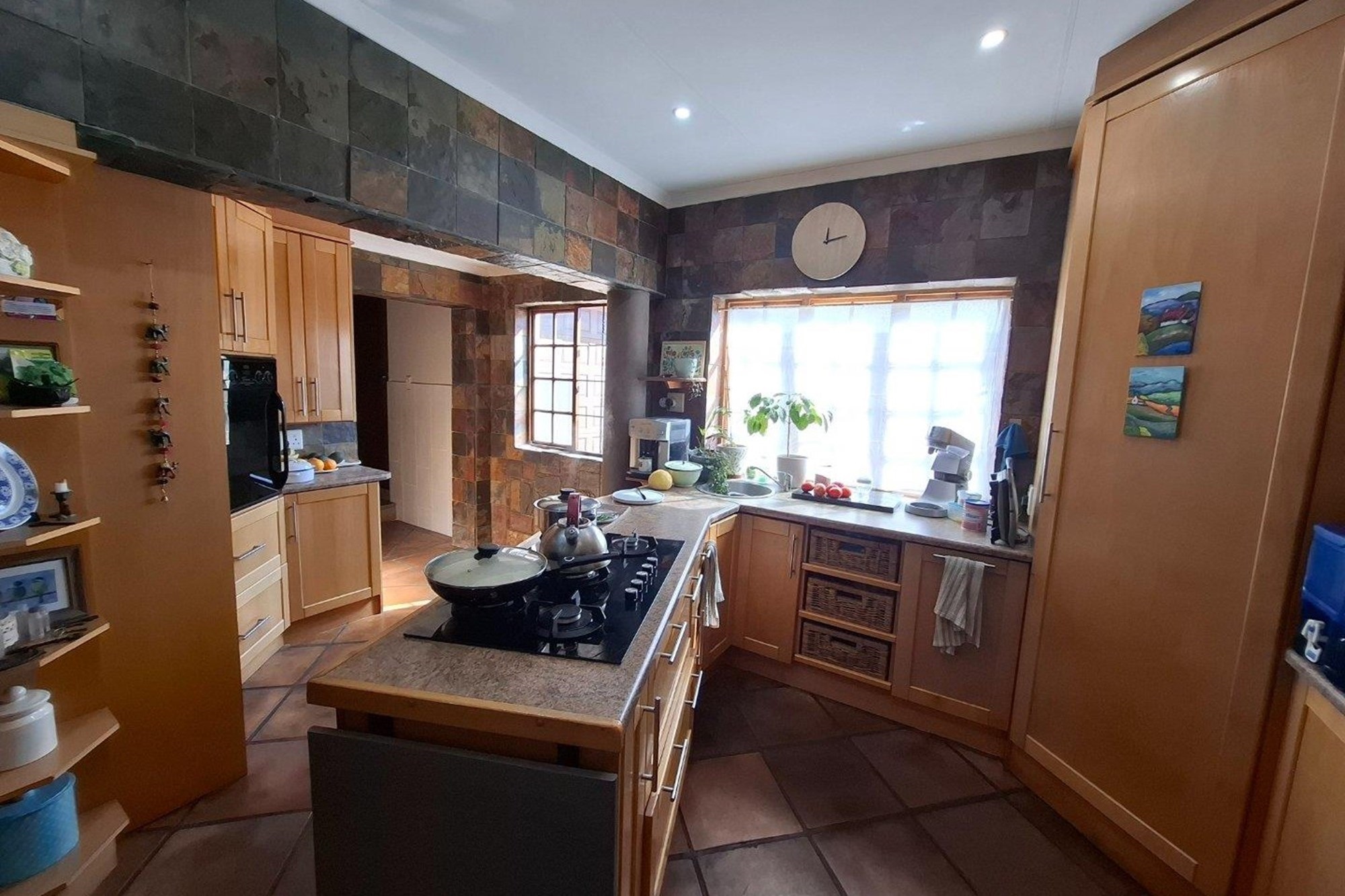 The open-plan layout creates effortless flow between the dining area, lounge, and a stylish kitchen designed for everyday living. A central island, gas hob, plenty of cabinetry, and generous countertops make it a functional space, while the separate scullery keeps things tidy and organised.