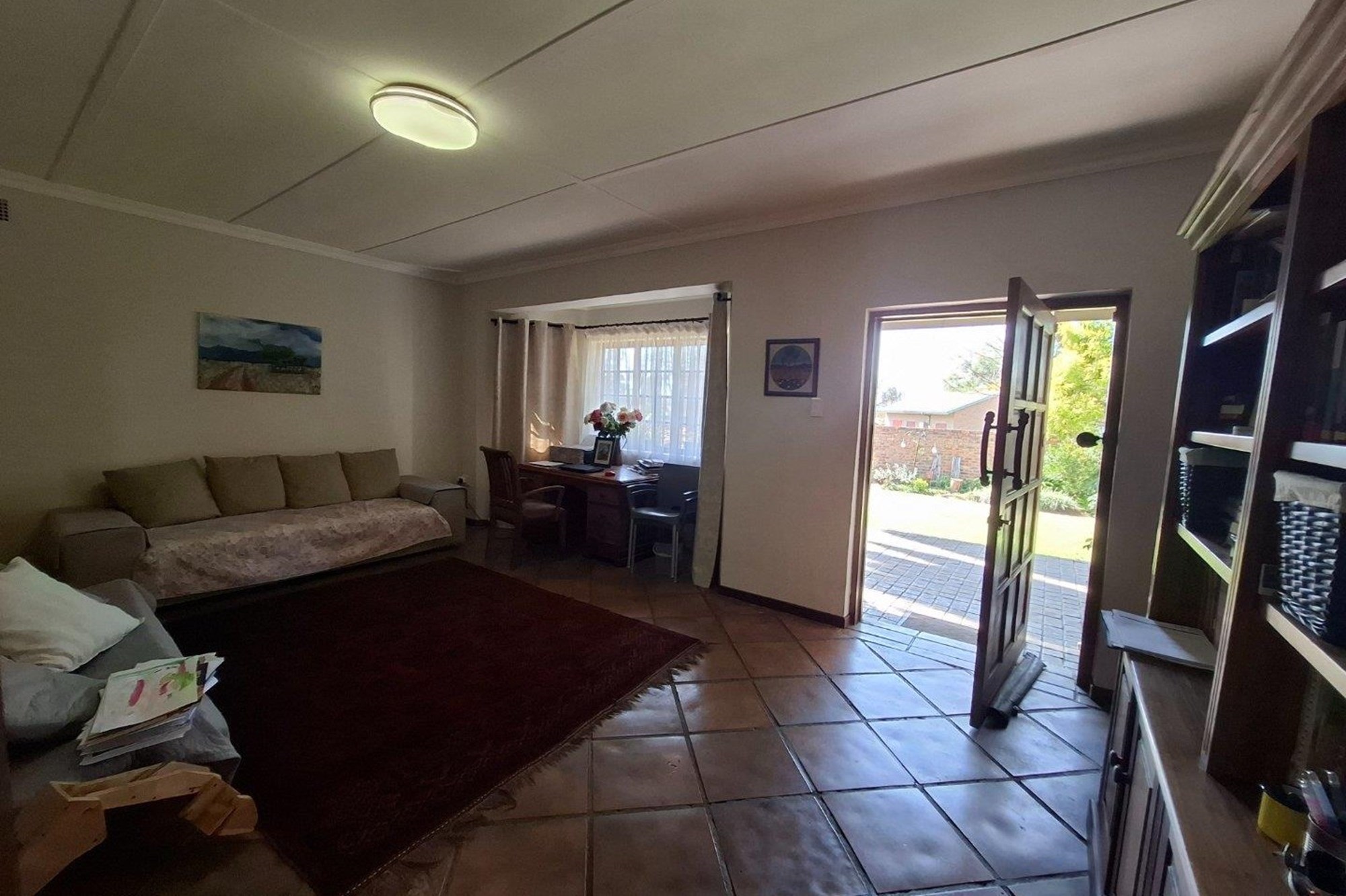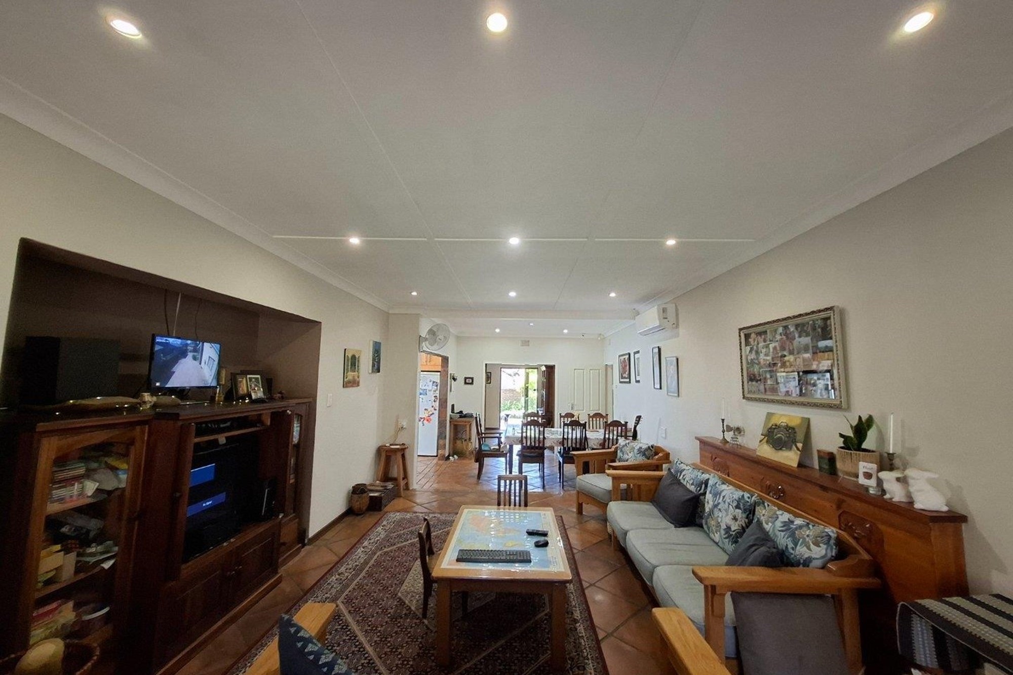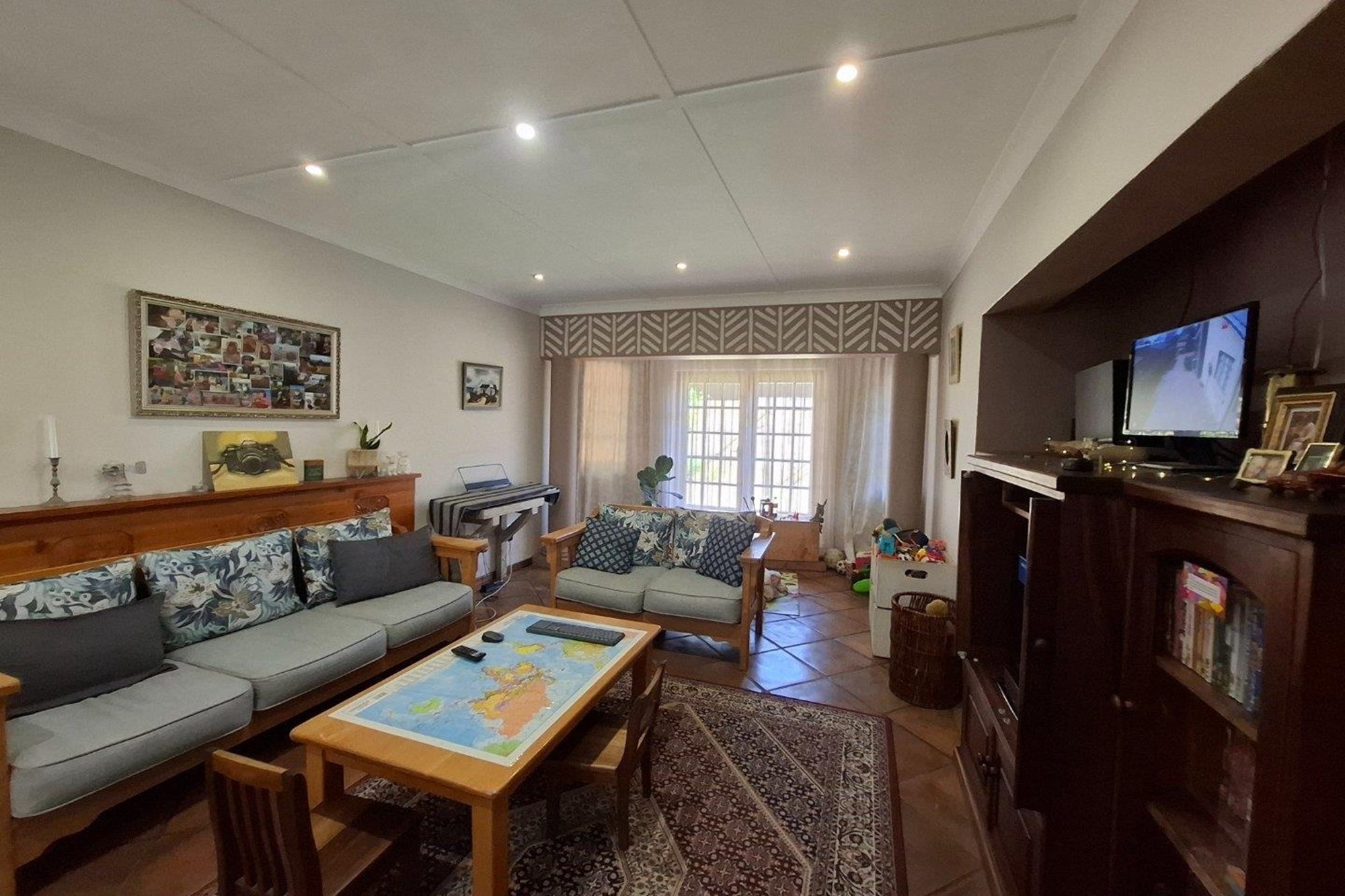 An automated gate opens to a paved driveway with direct access to double automated garages. Inside, elegant double glass doors reveal a bright and airy TV room—ideal for relaxed evenings or casual get-togethers.