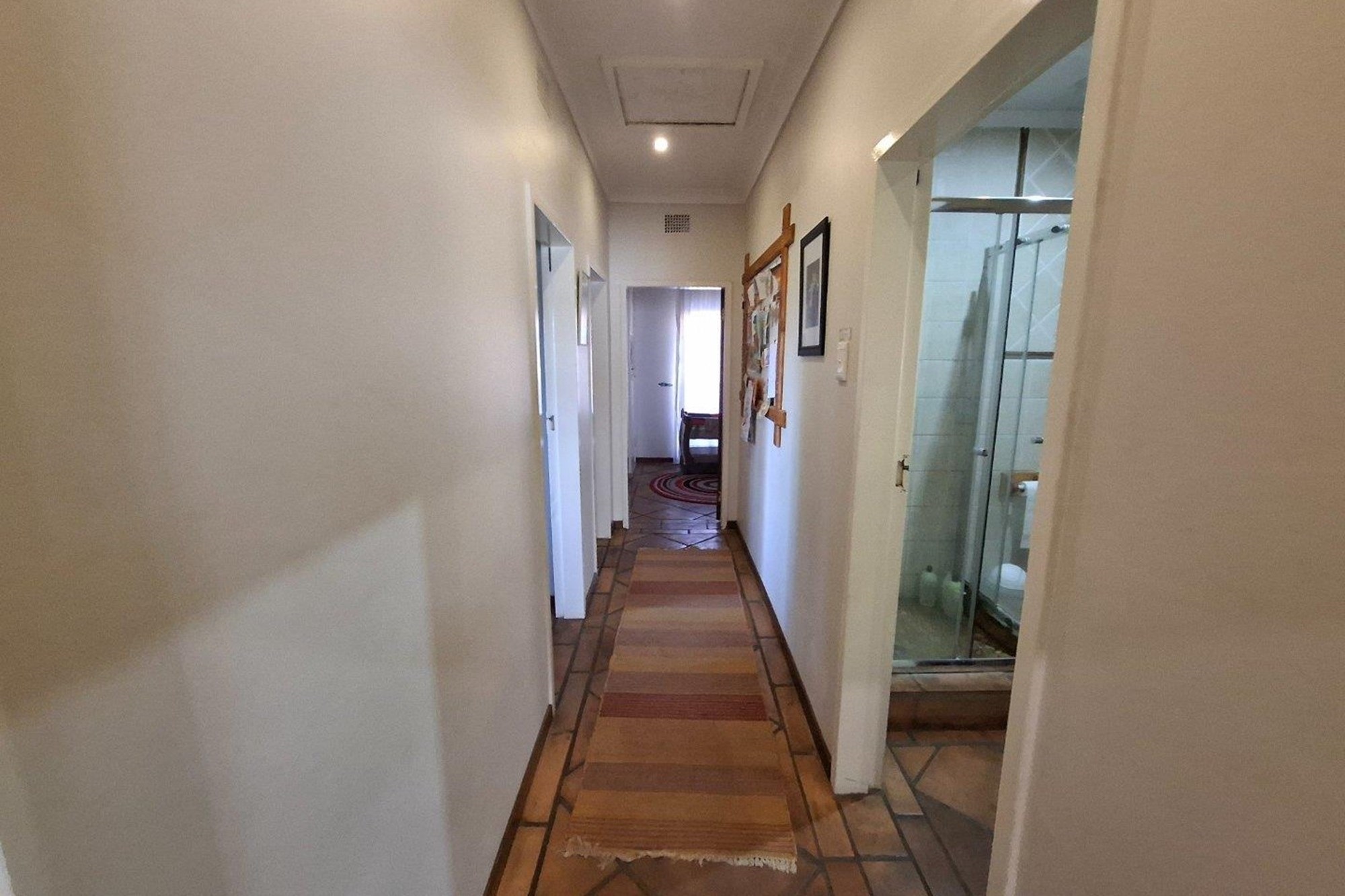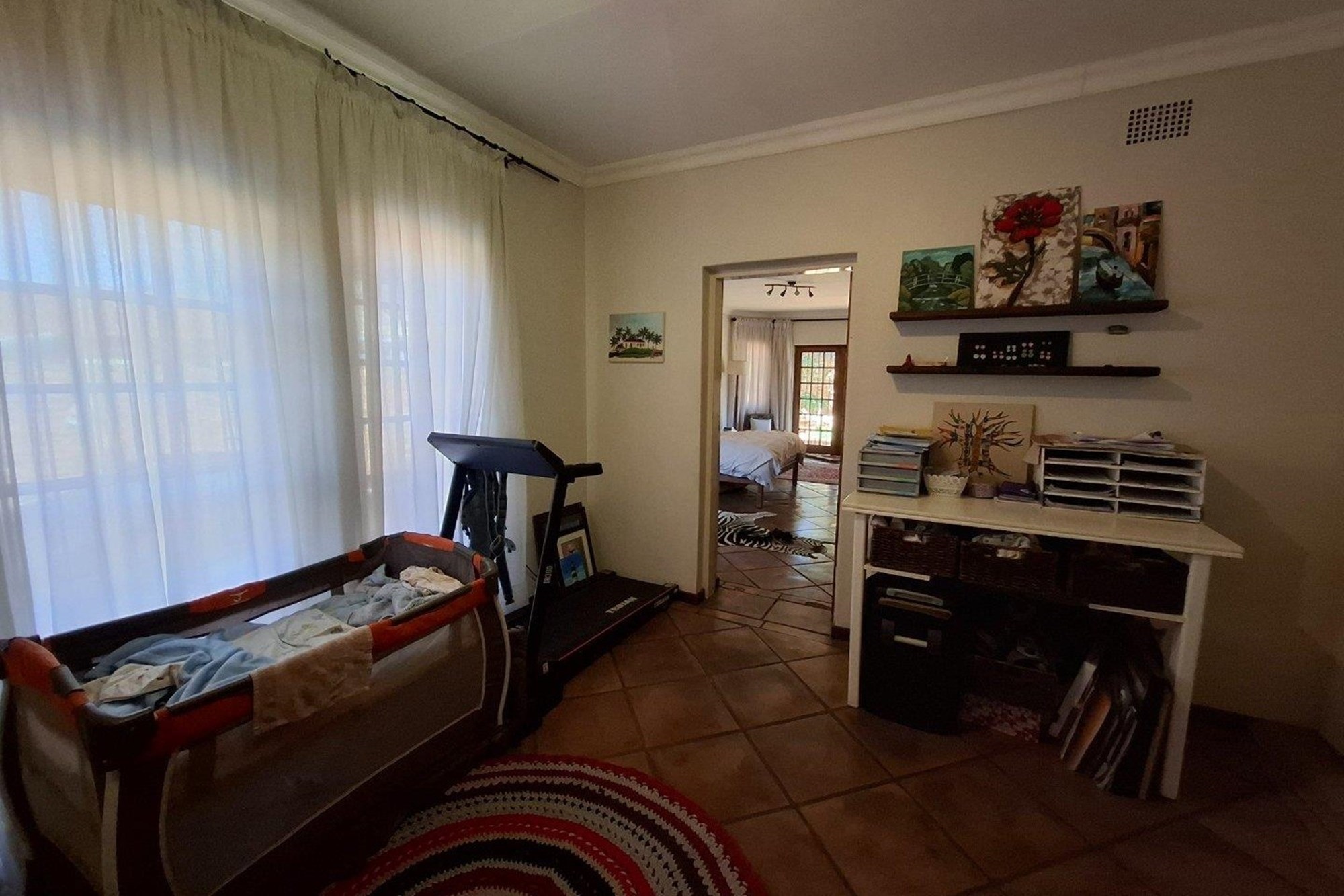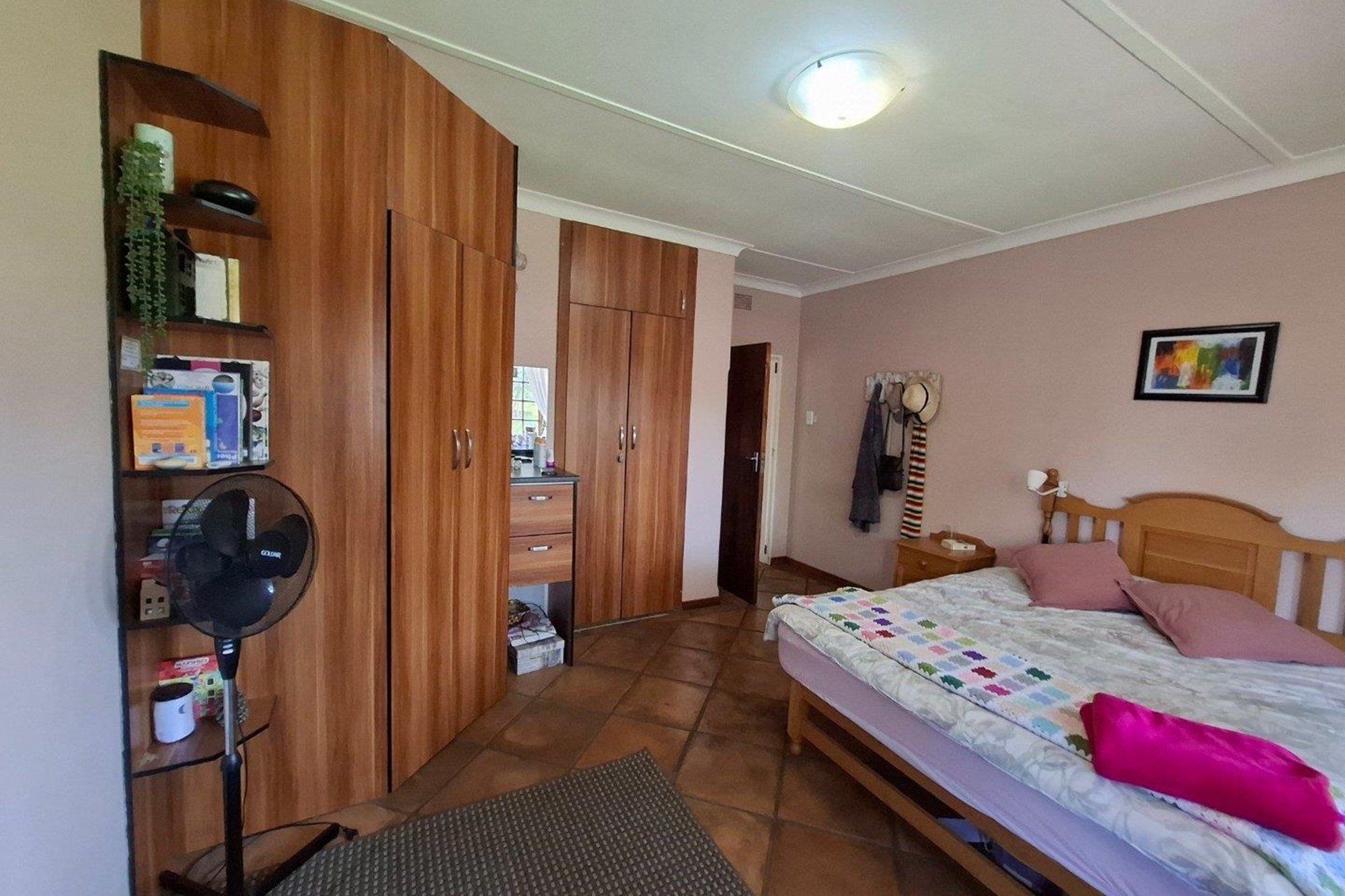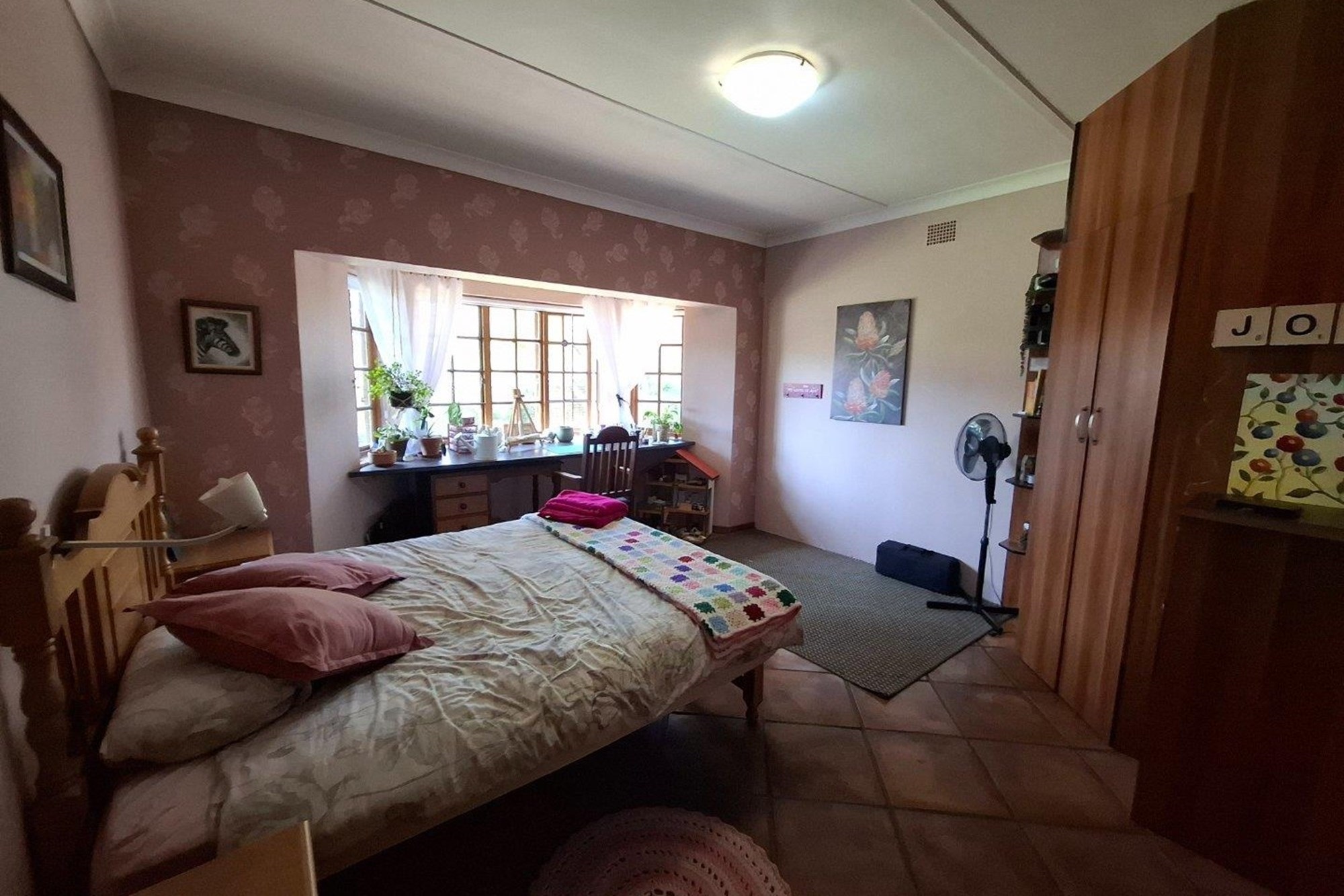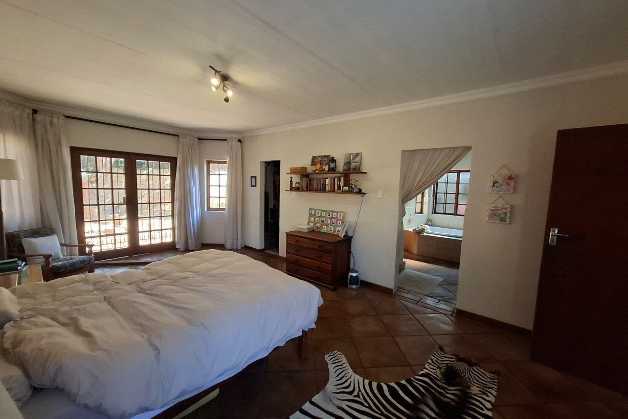 The bedroom wing offers three well-sized bedrooms with large windows and built-in cupboards. The main bedroom includes an en-suite bathroom, while a second full bathroom serves the rest of the home with ease.