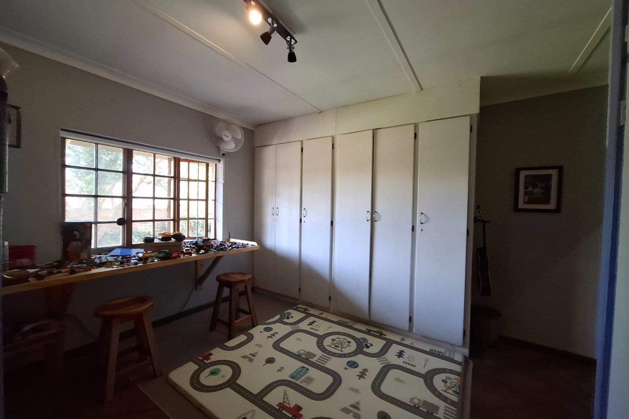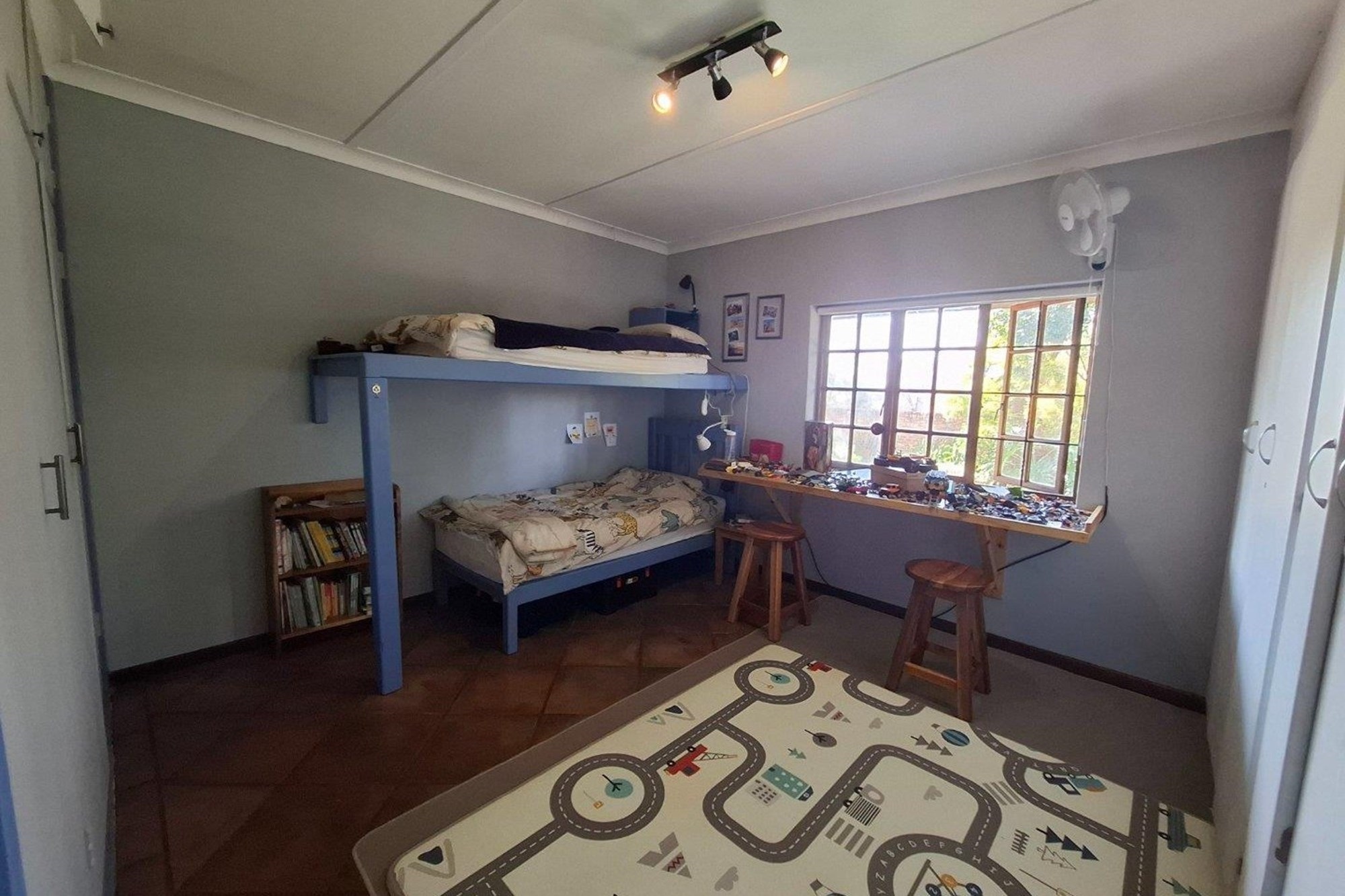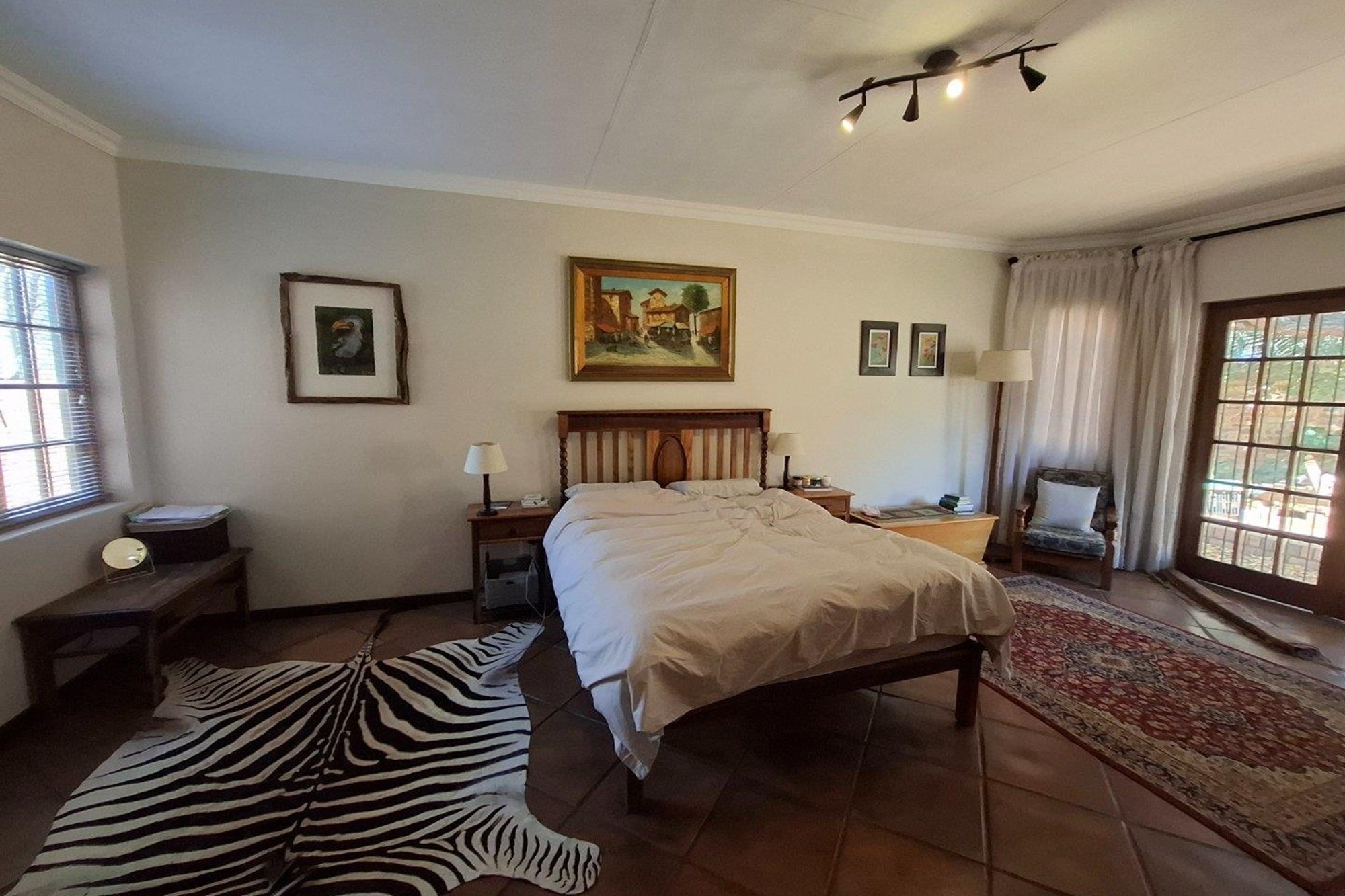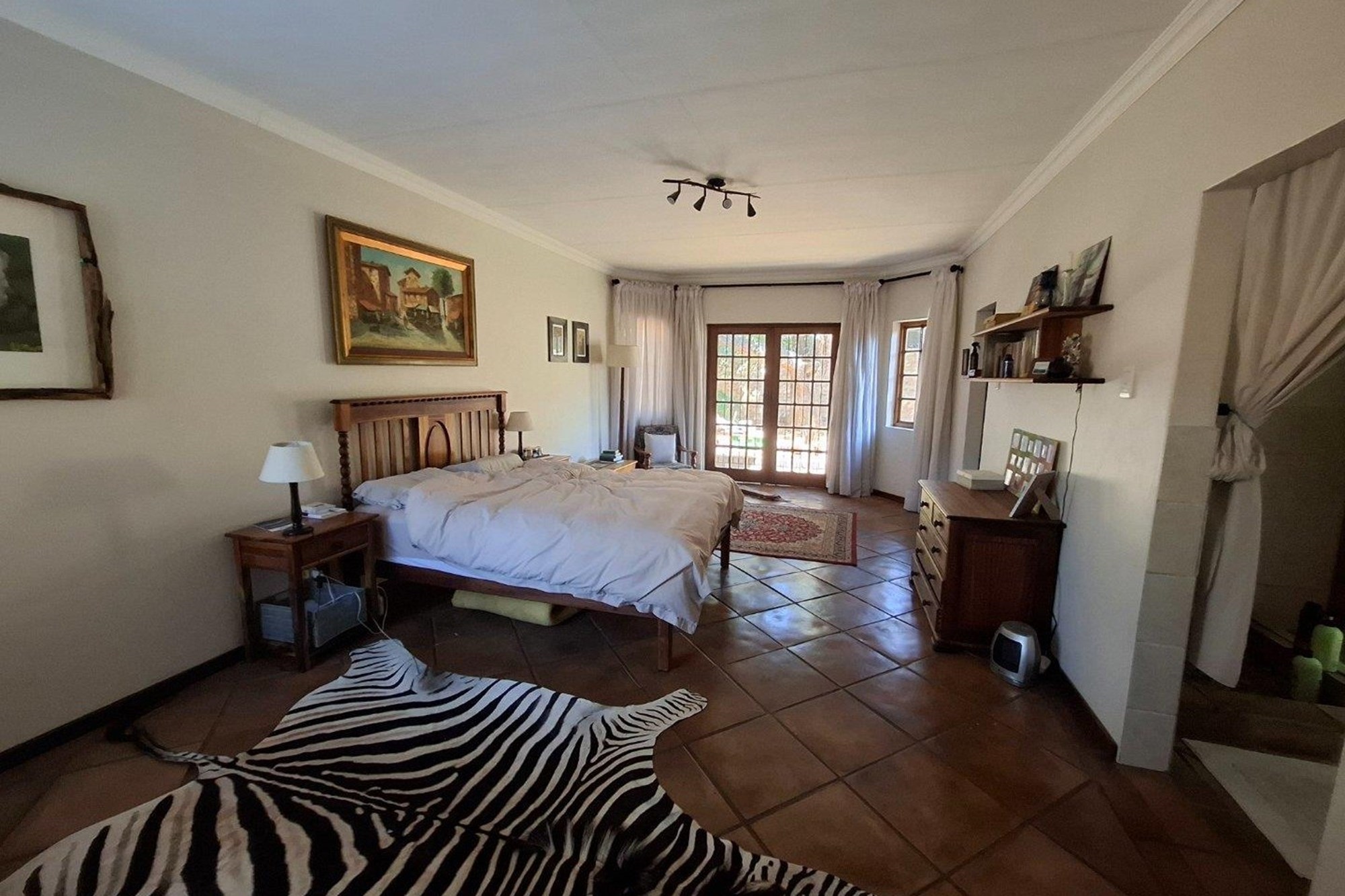 The bedroom wing offers three well-sized bedrooms with large windows and built-in cupboards. The main bedroom includes an en-suite bathroom, while a second full bathroom serves the rest of the home with ease.