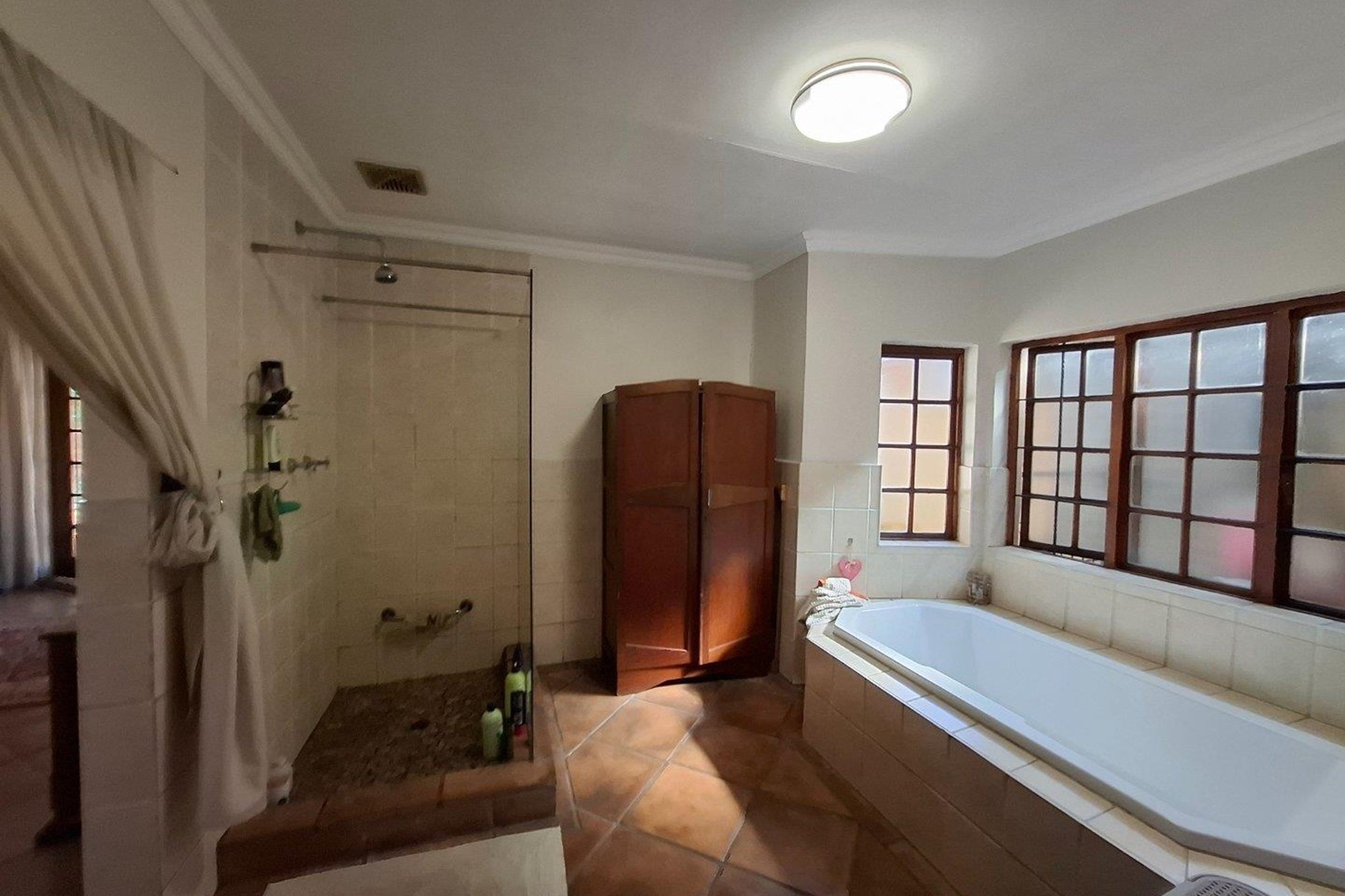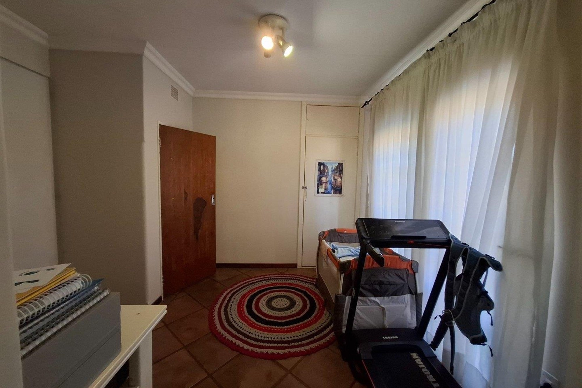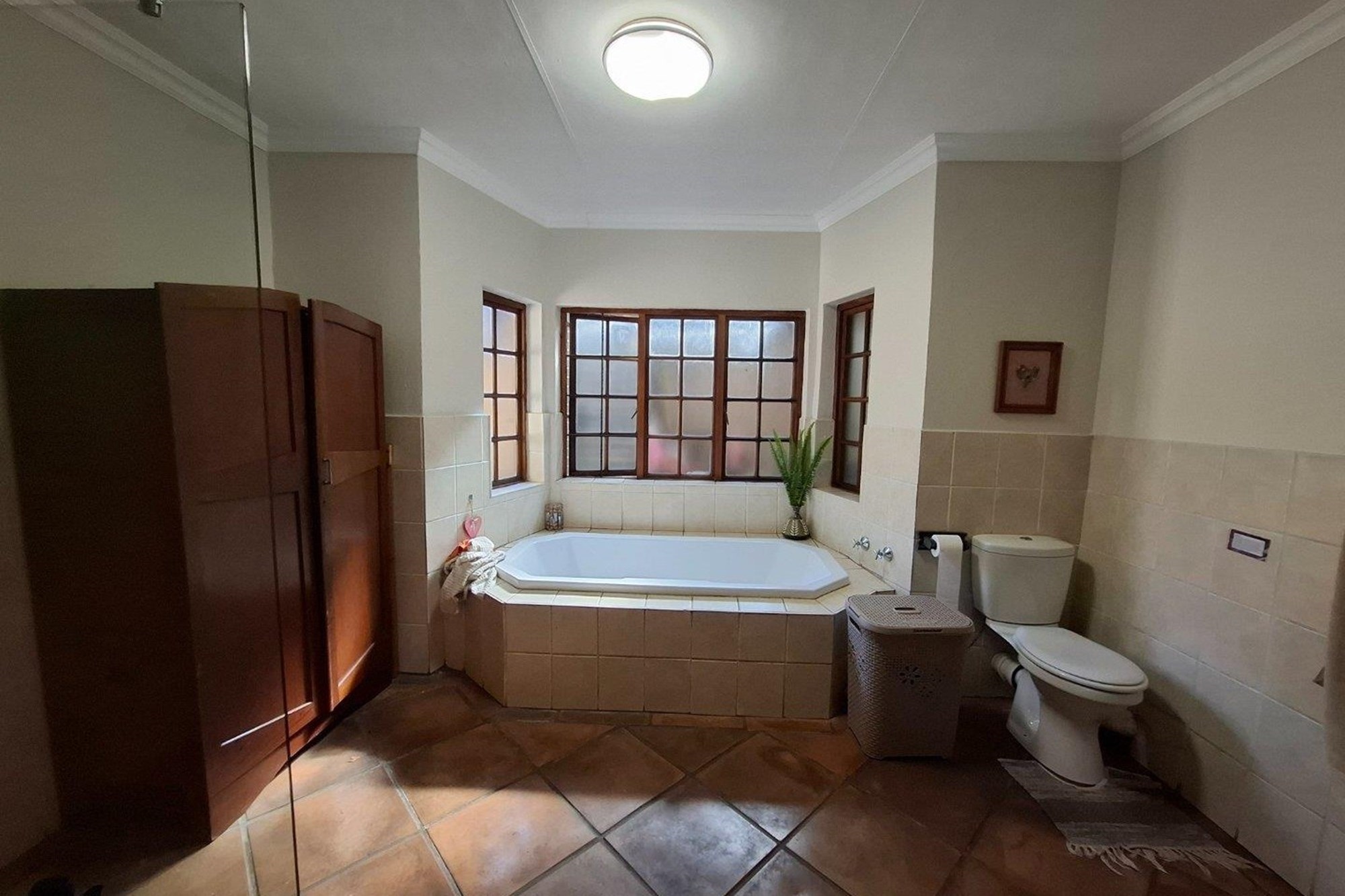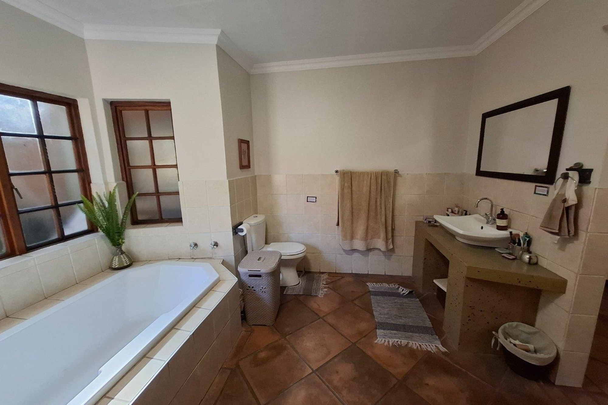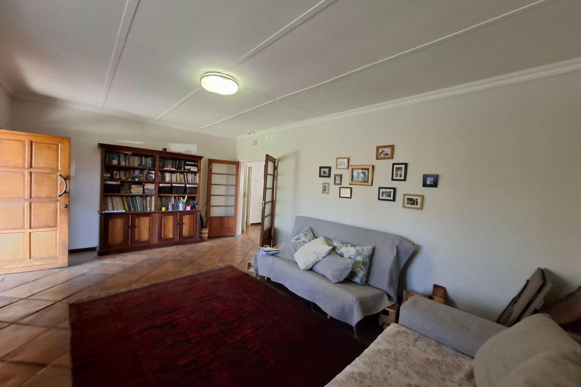 The bedroom wing offers three well-sized bedrooms with large windows and built-in cupboards. The main bedroom includes an en-suite bathroom, while a second full bathroom serves the rest of the home with ease.