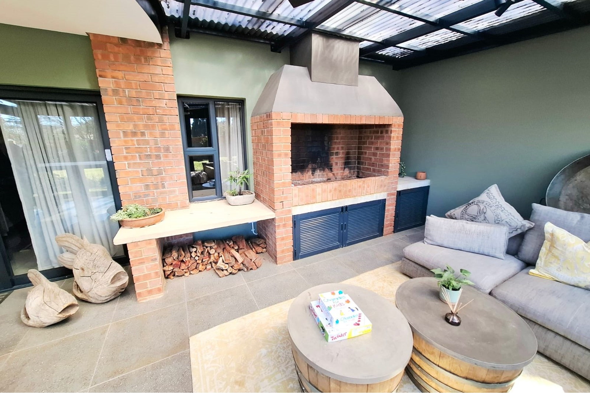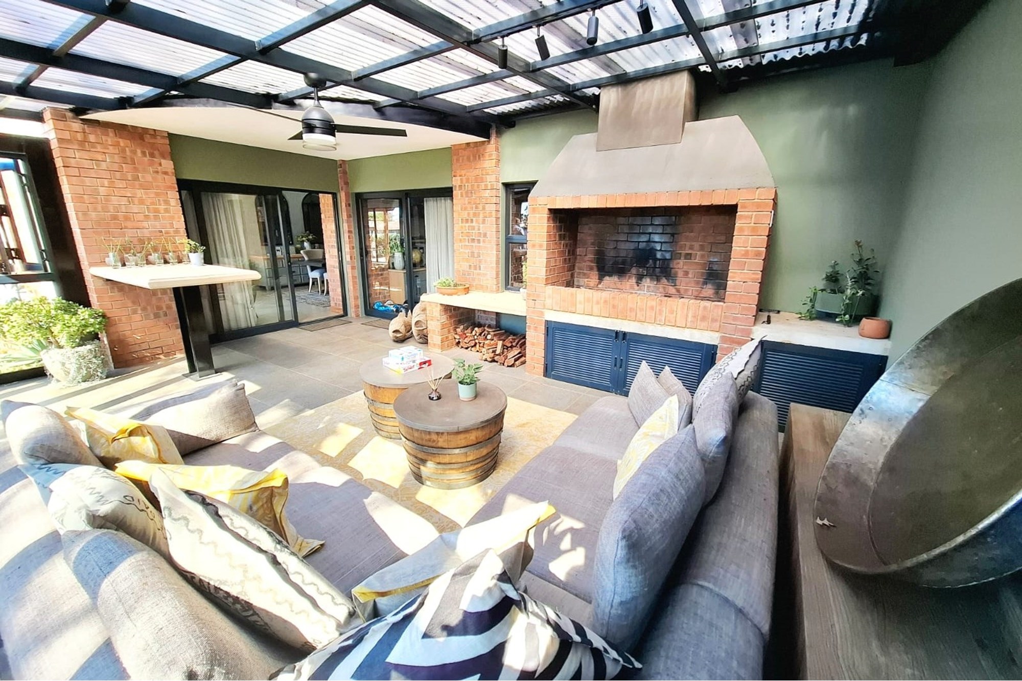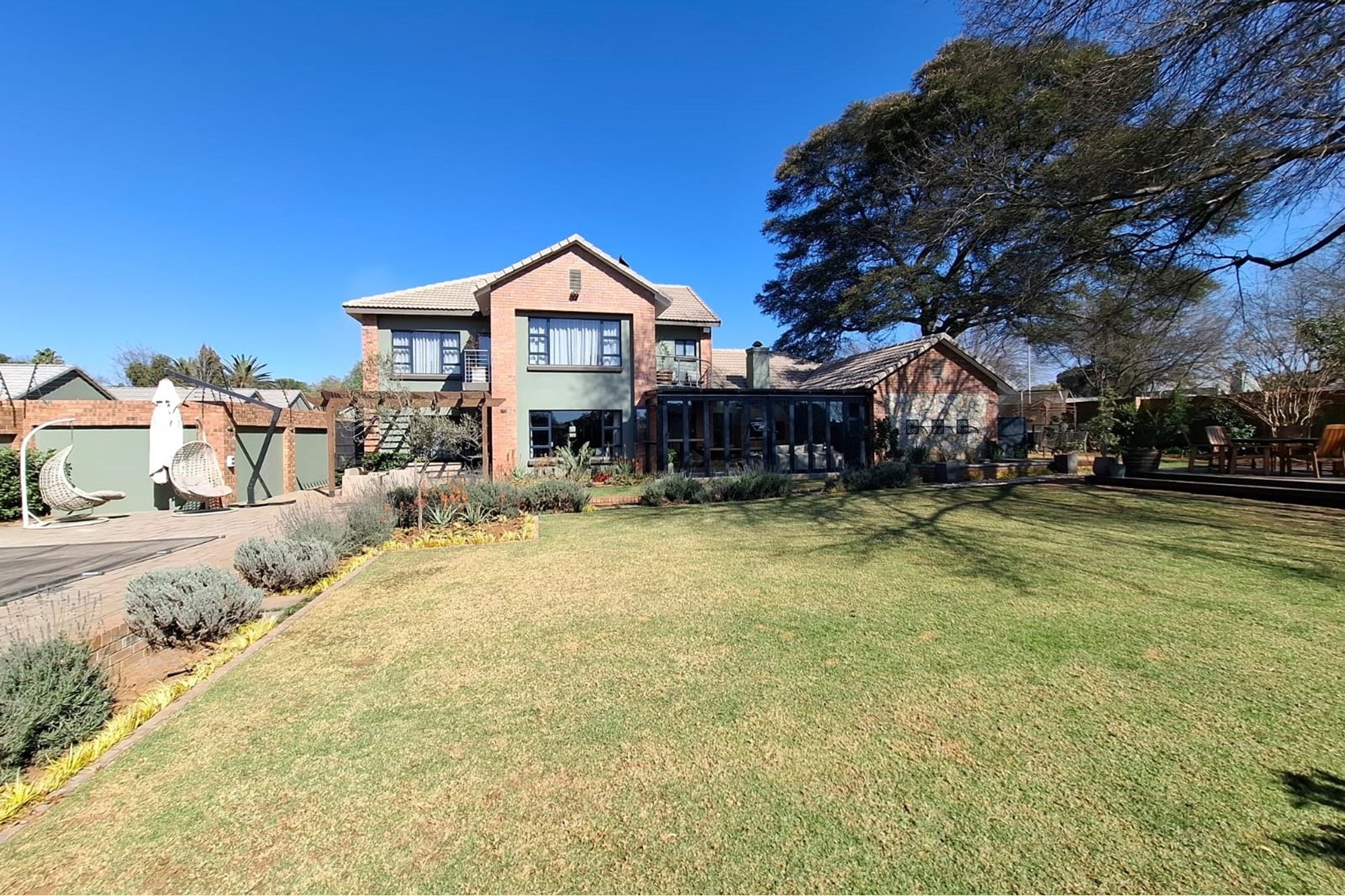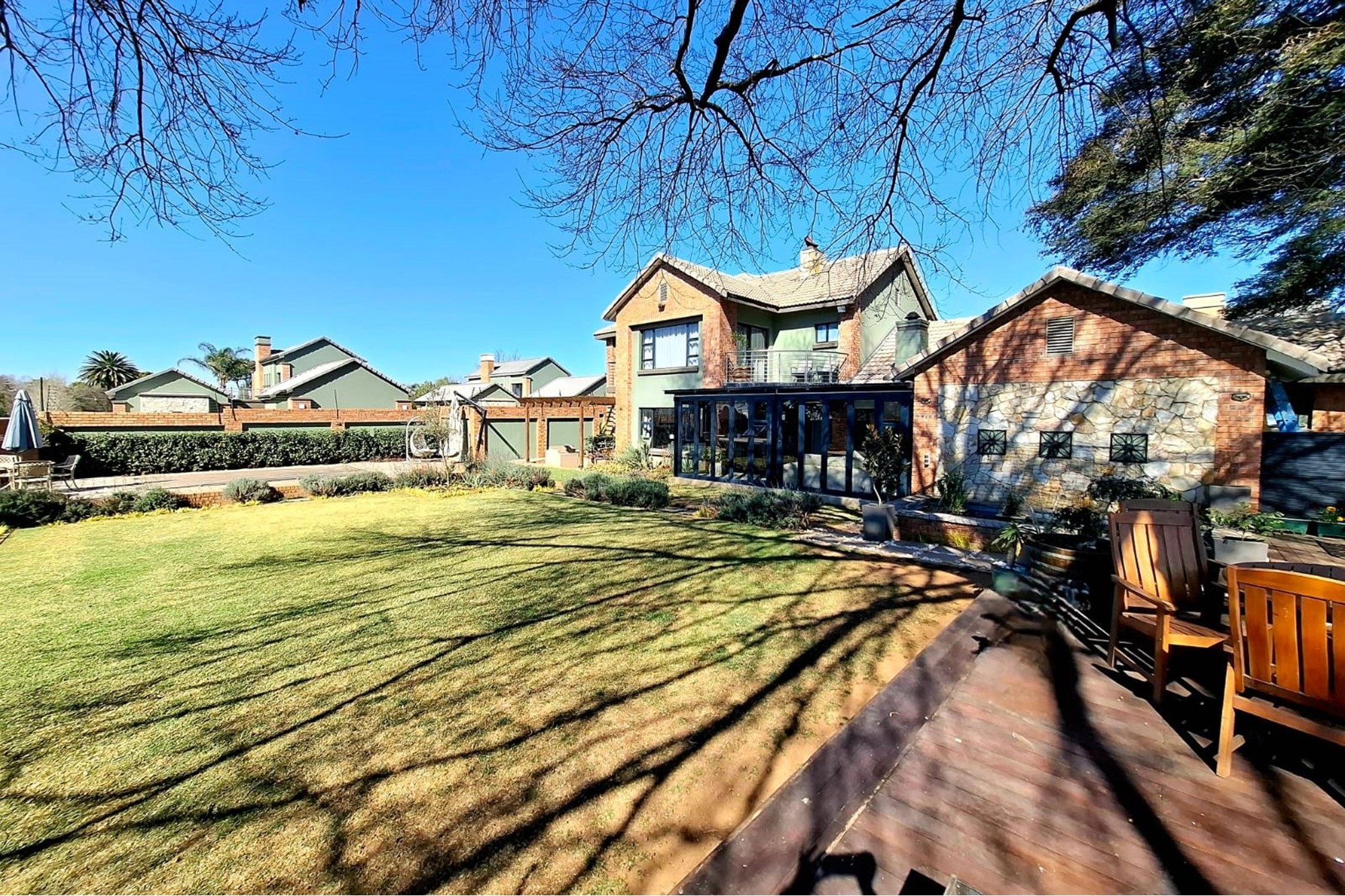 A separate family room opens up to an exceptional entertainment area – a fully enclosed braai room with built-in braai, seamlessly connected to the landscaped garden. Step outside to a heated swimming pool, covered patio with boma braai, and a wooden deck nestled under a large tree – the perfect spot for relaxed outdoor gatherings or quiet moments in nature.