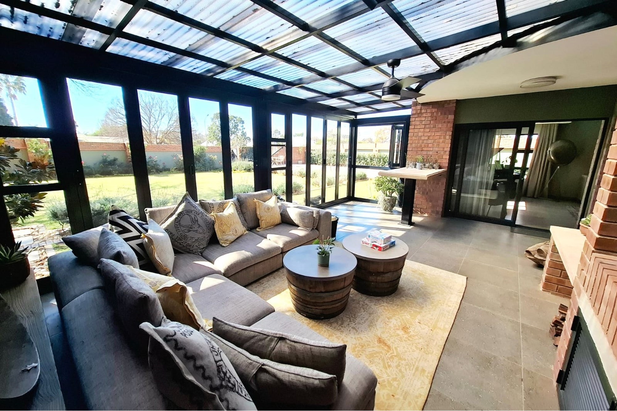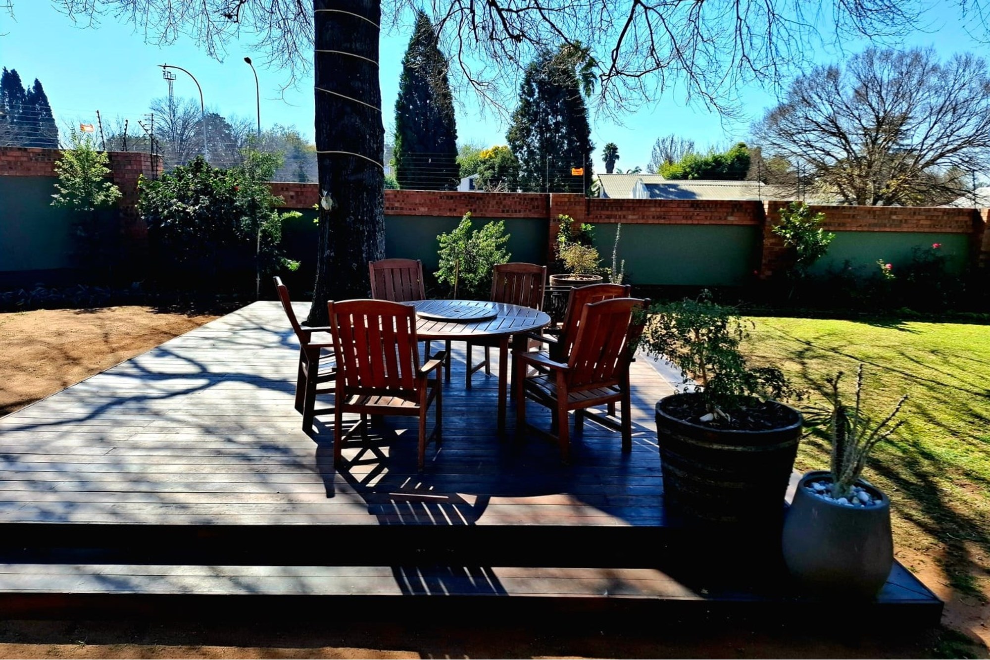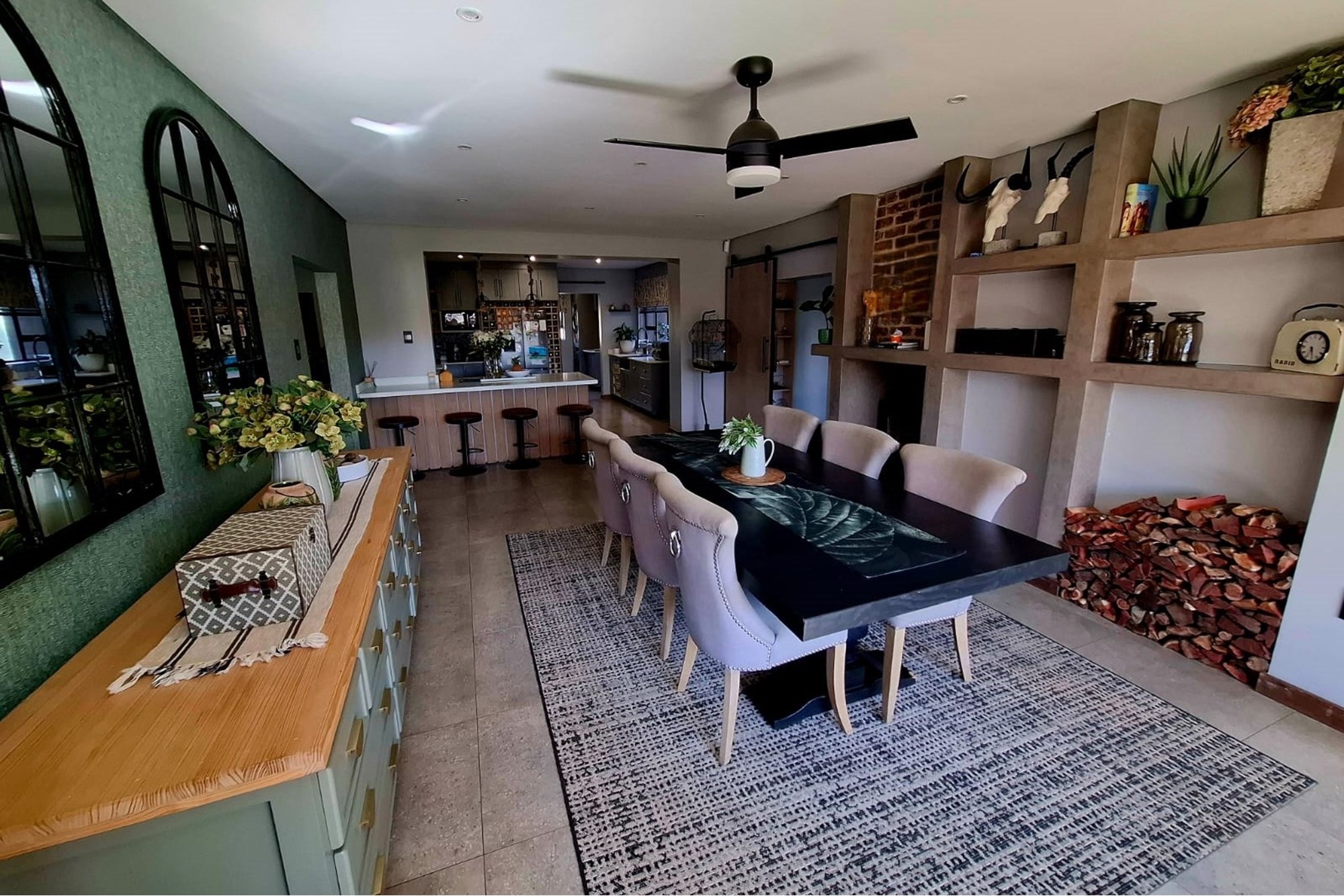 A separate family room opens up to an exceptional entertainment area – a fully enclosed braai room with built-in braai, seamlessly connected to the landscaped garden. Step outside to a heated swimming pool, covered patio with boma braai, and a wooden deck nestled under a large tree – the perfect spot for relaxed outdoor gatherings or quiet moments in nature.