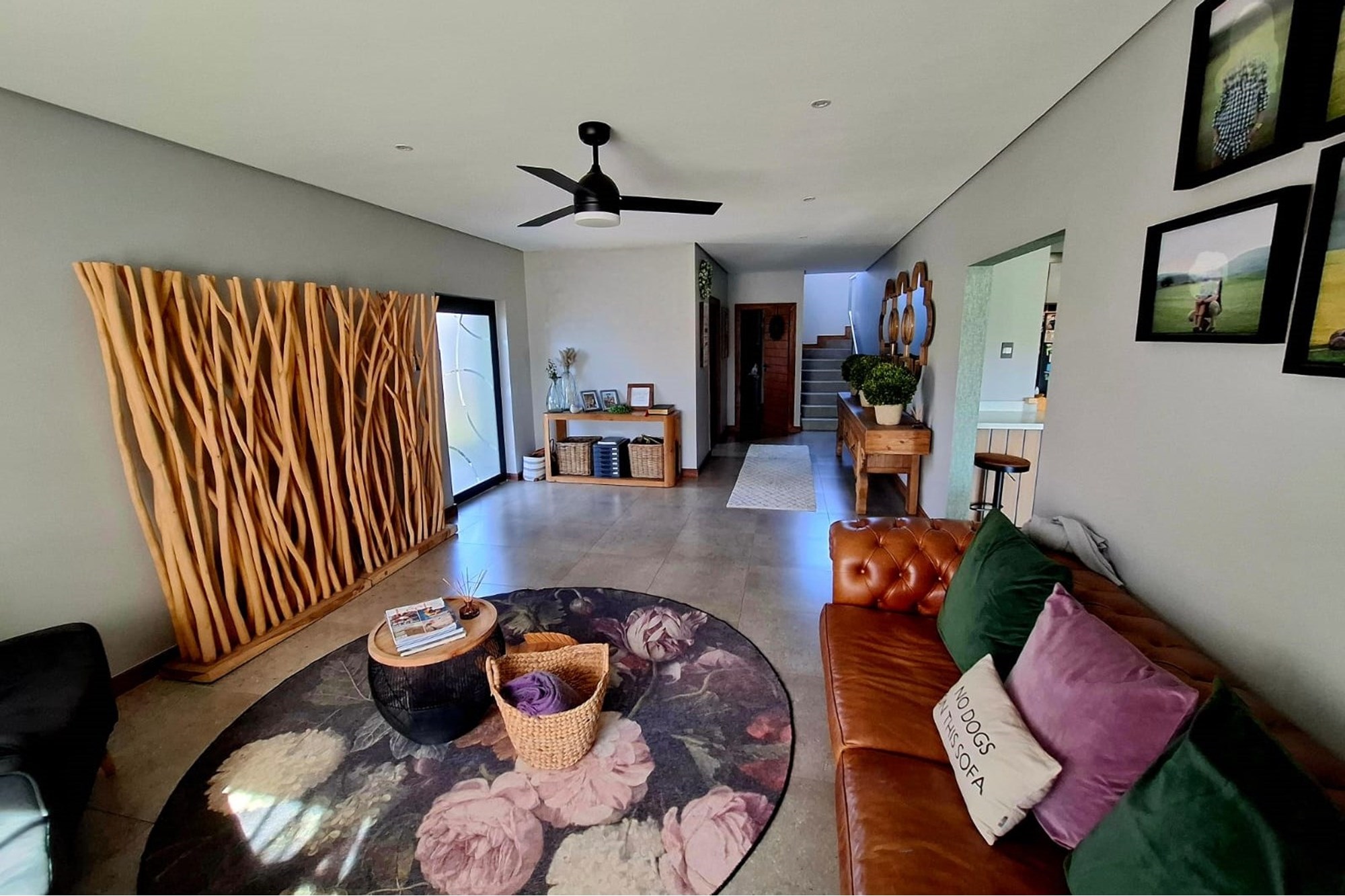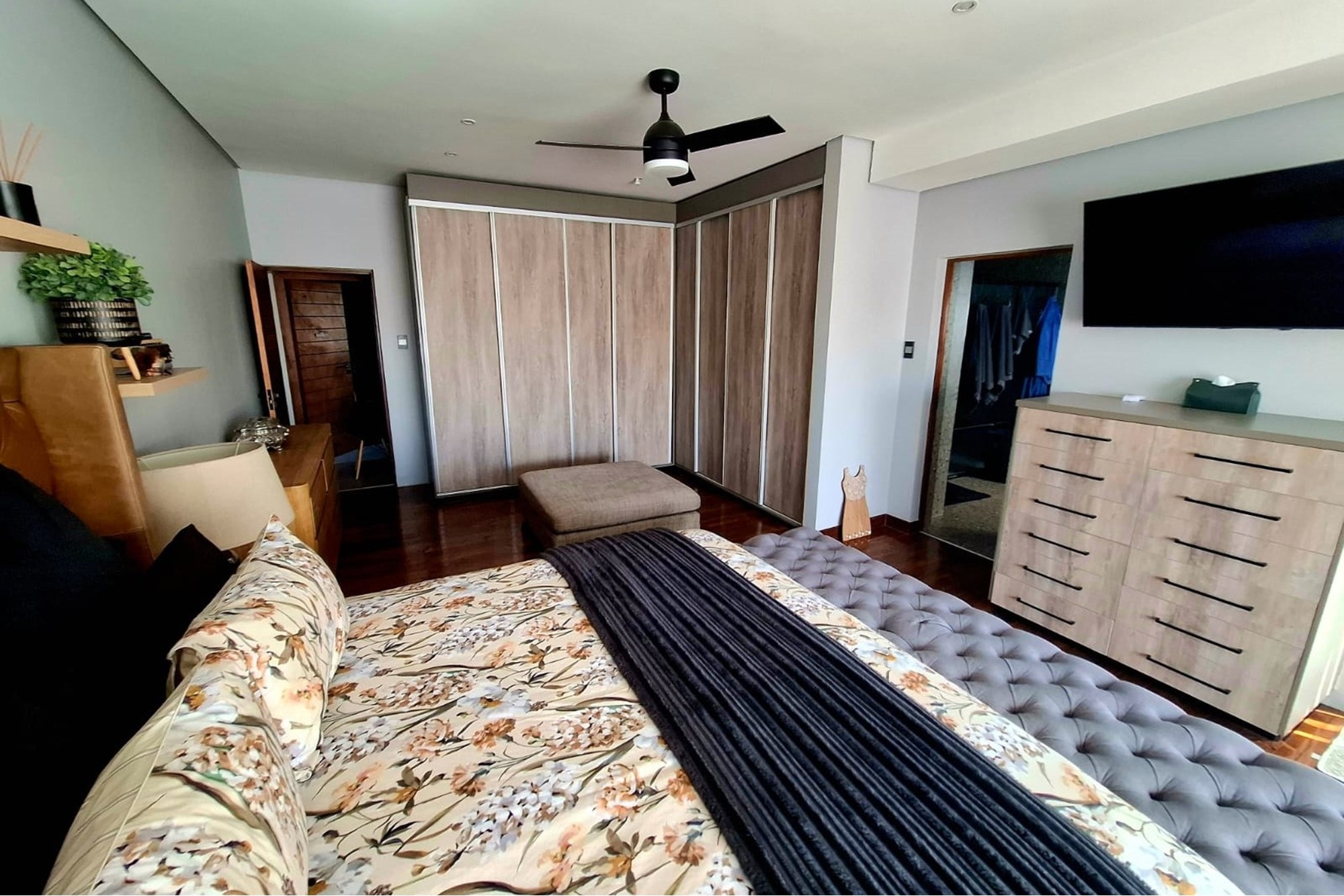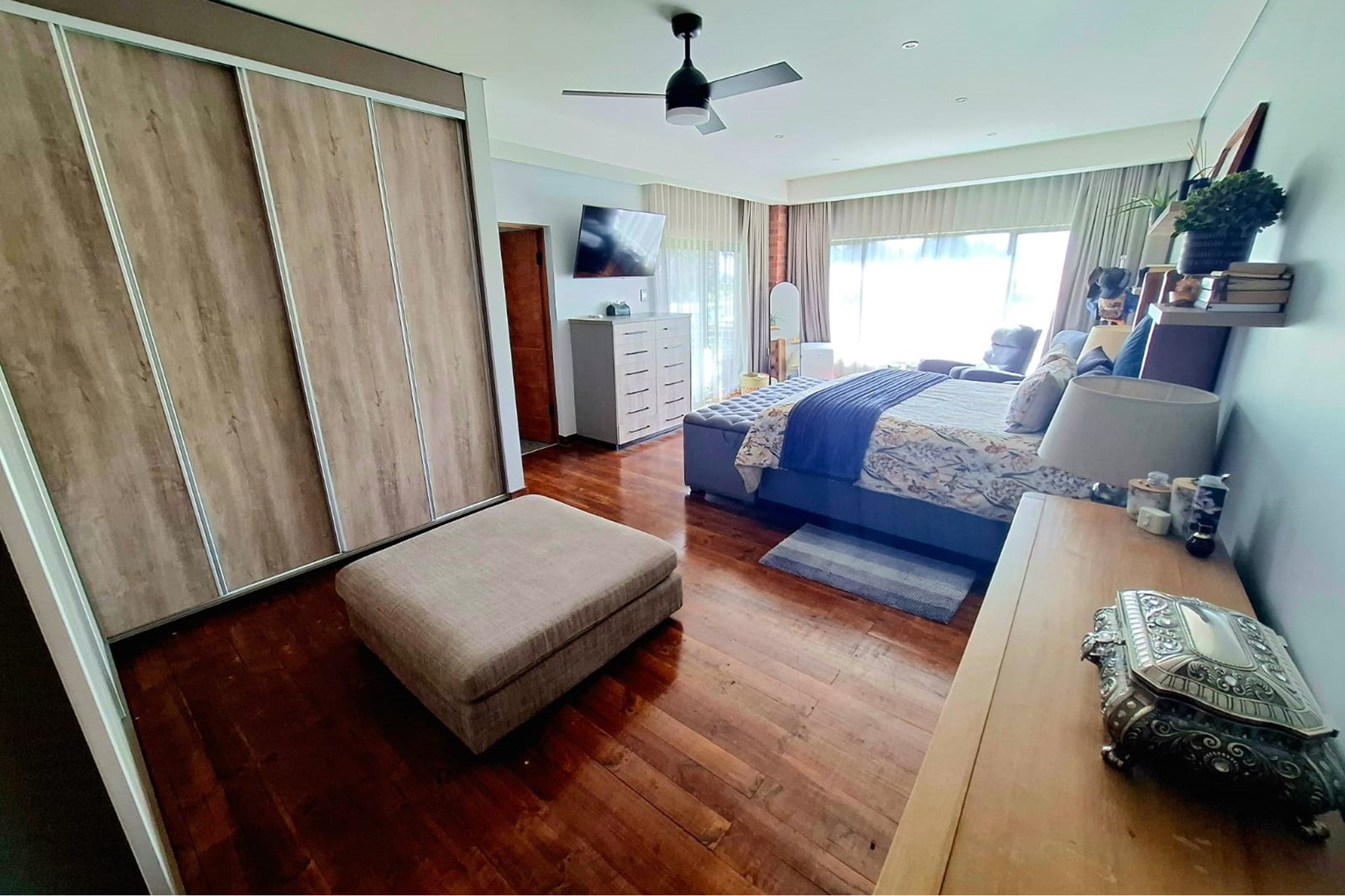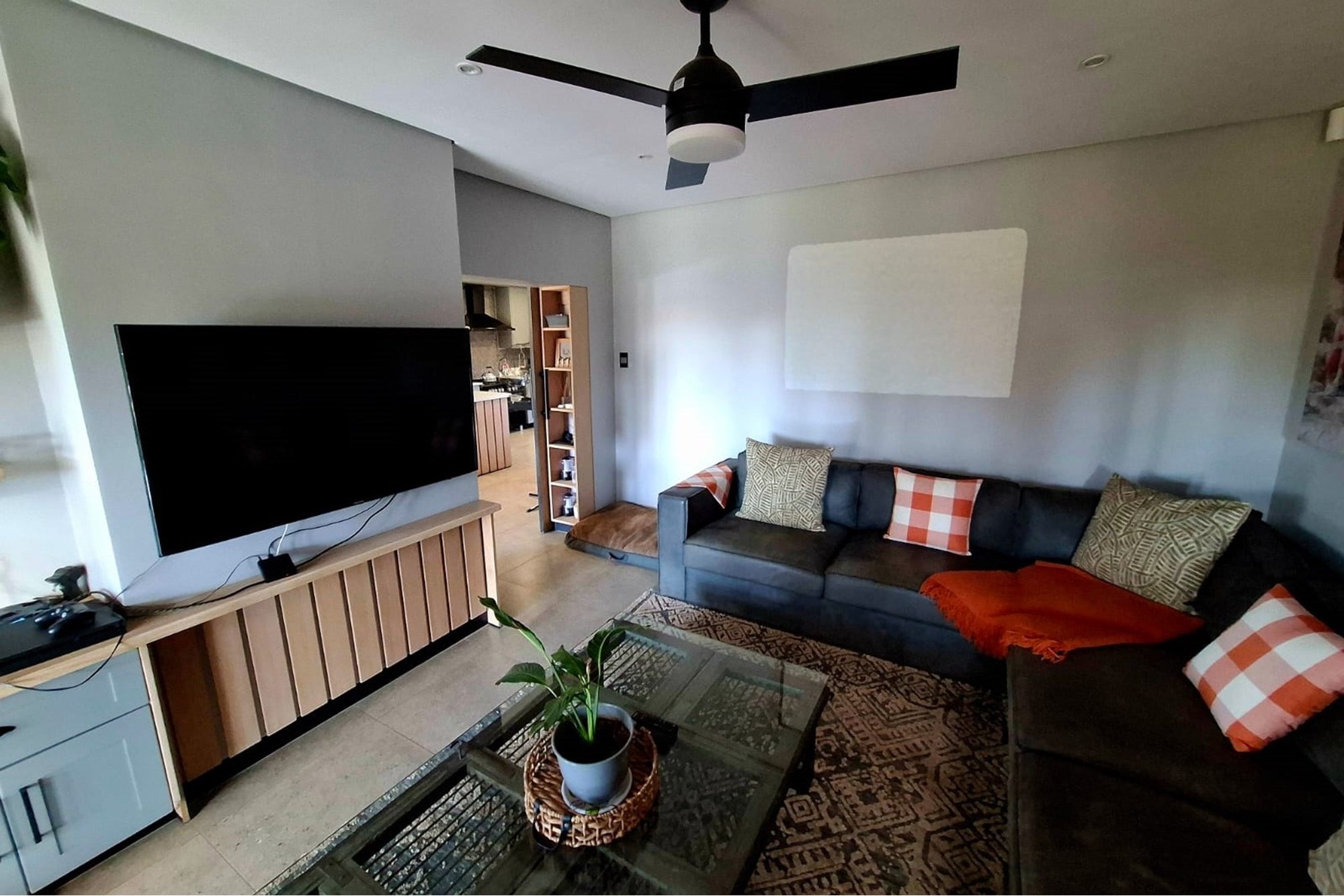 A separate family room opens up to an exceptional entertainment area – a fully enclosed braai room with built-in braai, seamlessly connected to the landscaped garden. Step outside to a heated swimming pool, covered patio with boma braai, and a wooden deck nestled under a large tree – the perfect spot for relaxed outdoor gatherings or quiet moments in nature.