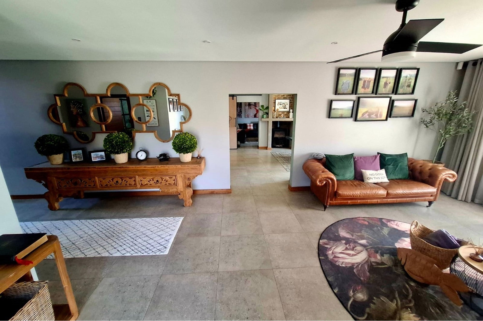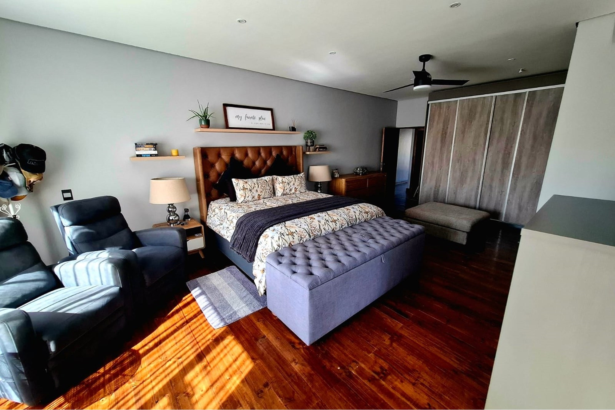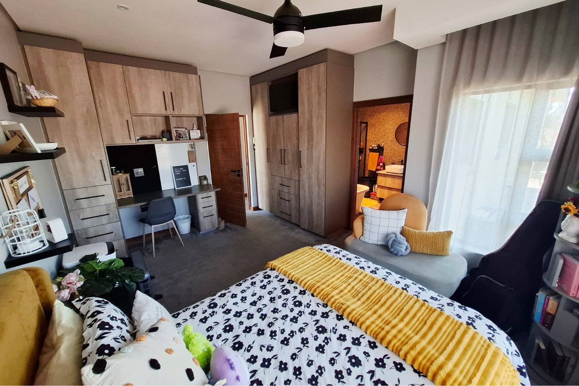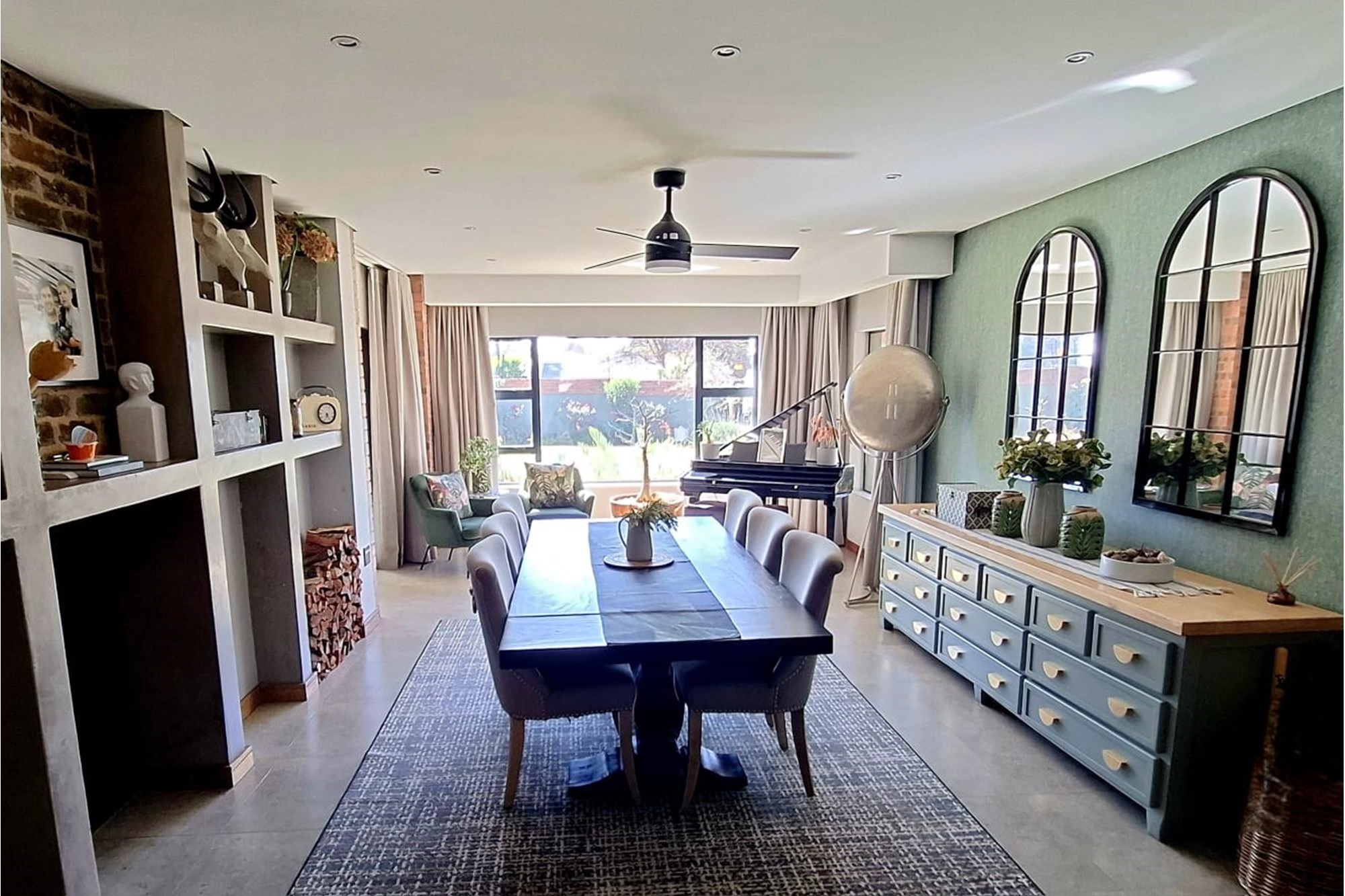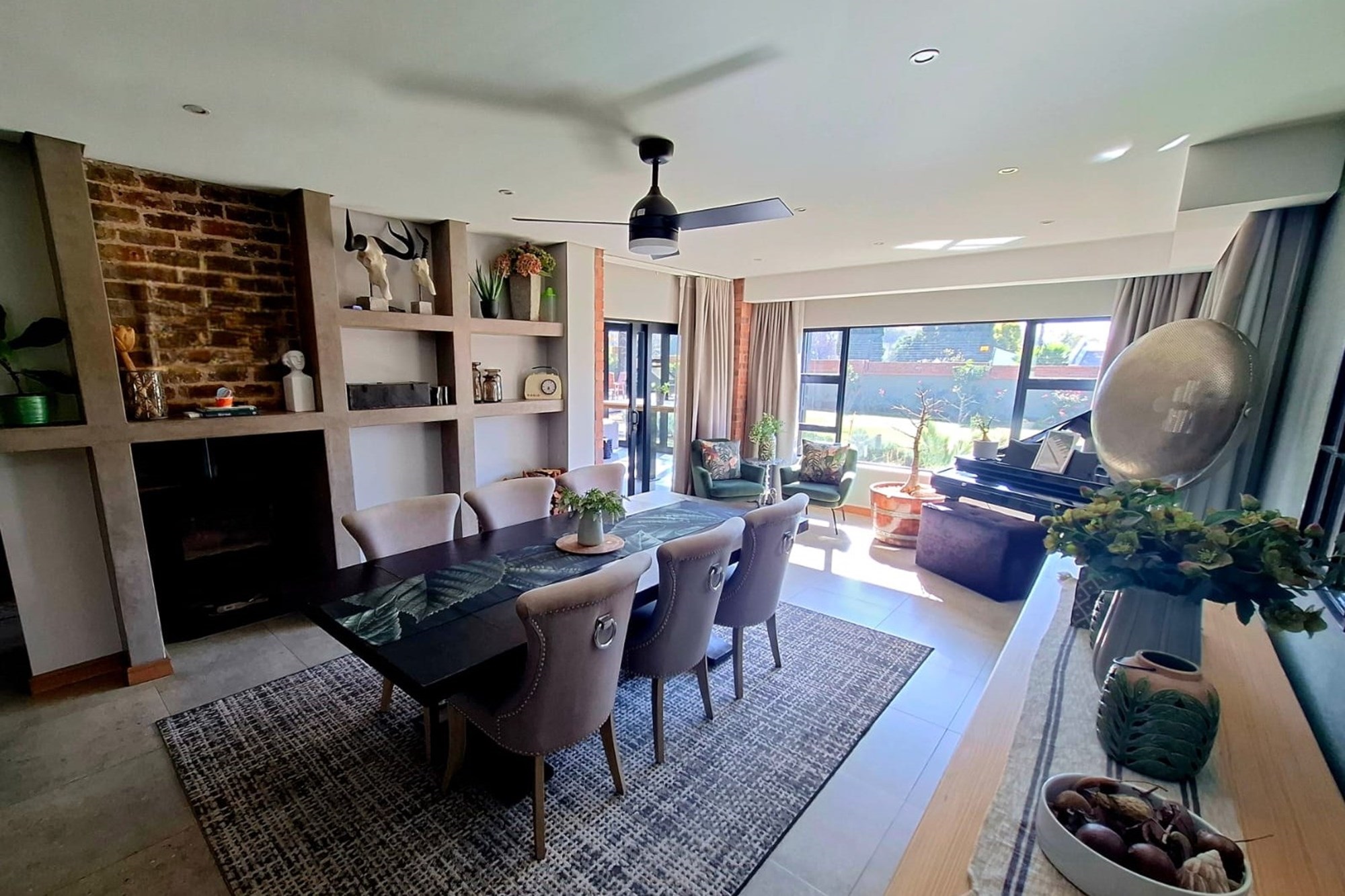 Downstairs, you’re welcomed by a striking entrance that leads into a flowing open-plan layout, including a spacious lounge, dining room, and cosy seating area with a fireplace. The gourmet kitchen is a statement in style and practicality, featuring a gas stove, large breakfast nook, and designer cabinetry. A mudroom, walk-in pantry, scullery, and dedicated laundry complete the heart of the home.