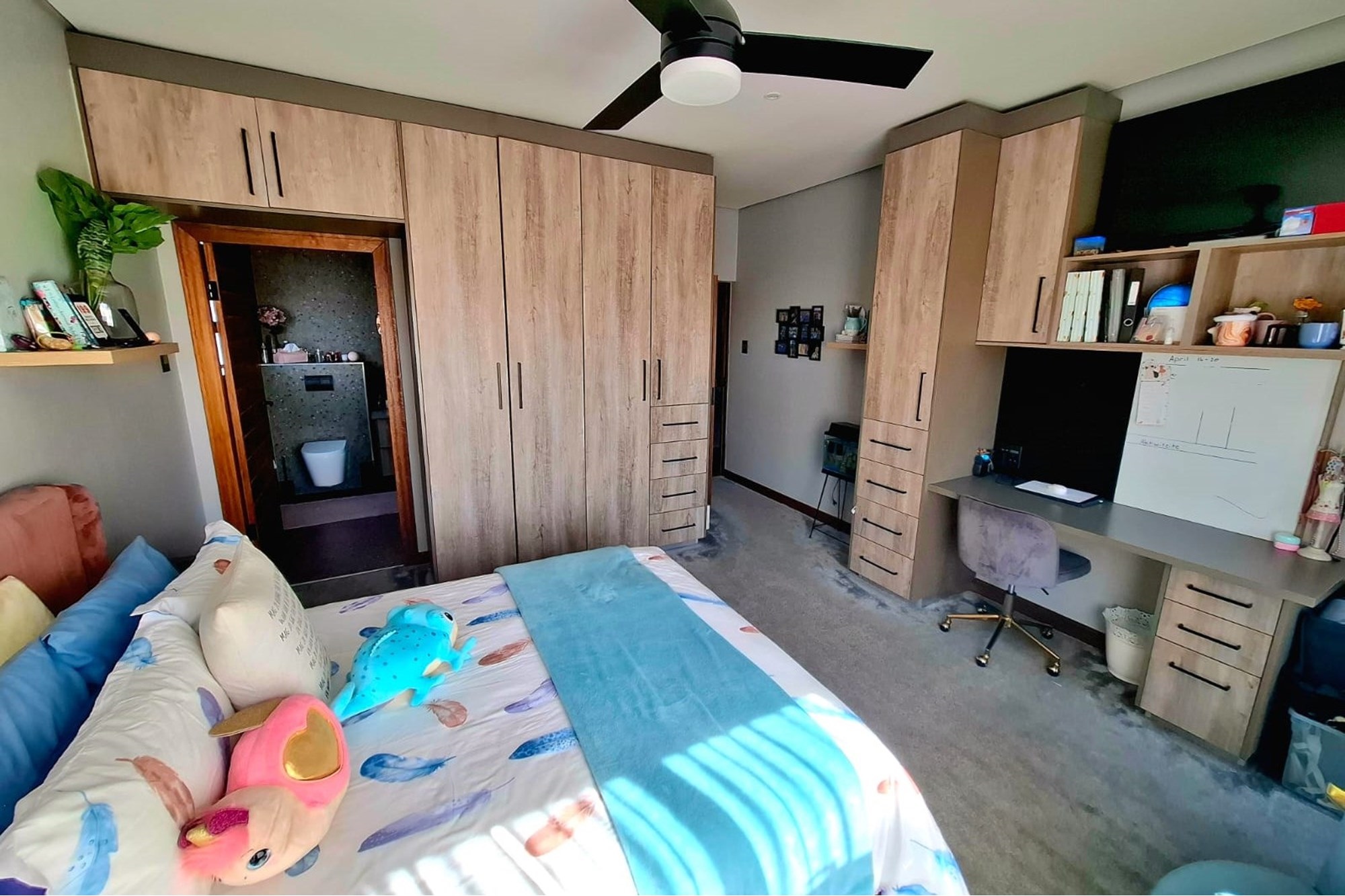 Upstairs features four spacious en-suite bedrooms, each with built-in cupboards and carpeted flooring for warmth. The main bedroom is a luxurious retreat with hardwood floors, a private balcony, a dressing area, and a stunning full en-suite bathroom boasting double vanities and a double shower.