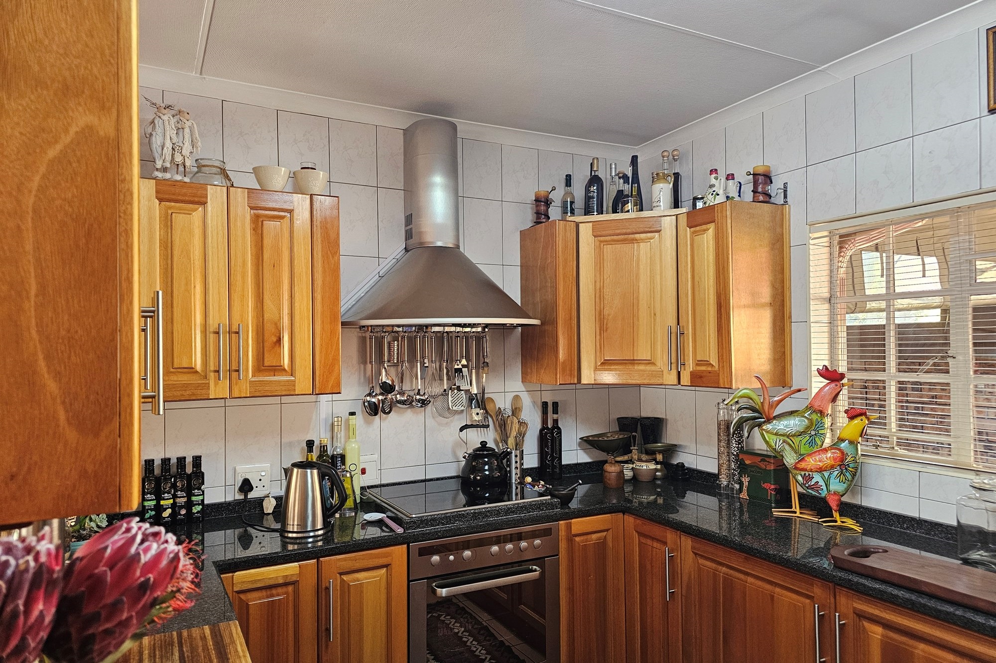 A hidden gem in the heart of Groenkol, this charming home is the perfect blend of comfort, style, and practicality. Surrounded by a beautifully kept, lush green garden that thrives all year round, it offers a warm and inviting atmosphere the moment you arrive. The home features three well-sized bedrooms with built-in cupboards and soft carpets, complemented by two very neat, fully tiled bathrooms. The open-plan kitchen is thoughtfully designed with wooden cupboards, granite tops, a glass-top stove, and undercounter oven, complete with a separate scullery and laundry for convenience. Flowing seamlessly into the open-plan lounge and dining room, both fitted with ceiling fans, the living areas are light and airy. Enjoy the outdoors with a covered sunny patio perfect for cozy winter days, as well as a patio with a wooden deck ideal for relaxed summer evenings. Practical extras include a double garage and a double shade-net carport, ensuring ample parking and storage space. Practicality and security are well covered with a 5kVA inverter and 5 solar panels, an alarm system with beams, electric fencing, automated garage doors, and gate. Extras include a double garage, double shade-net carport, a Wendy house for extra storage, and a servant’s toilet. This home is truly a lock-up-and-go lifestyle—safe, modern, and convenient. This is the one you’ve been waiting for! This home is truly a rare find in Groenkol—ready to welcome its new owners.
