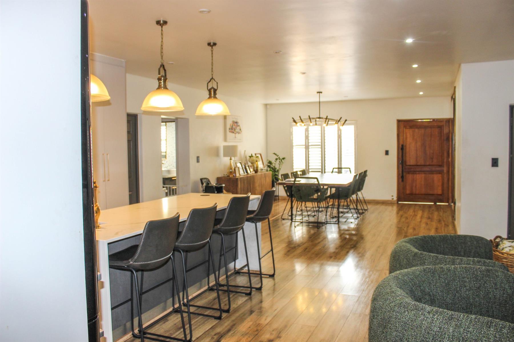 Welcome to this modern and spacious family home that offers both comfort and style. As you step through the front door, you’re greeted by an open-plan living space, flowing effortlessly from the dining area into the contemporary kitchen and family room with fire place. A sleek mini bar complements the living area, with large doors leading out to a semi-enclosed entertainment space, complete with a sparkling swimming pool and a stunning wooden patio featuring a pergola—perfect for enjoying sunny days. A built-in boma area with seating adds the ideal touch for cozy outdoor gatherings.