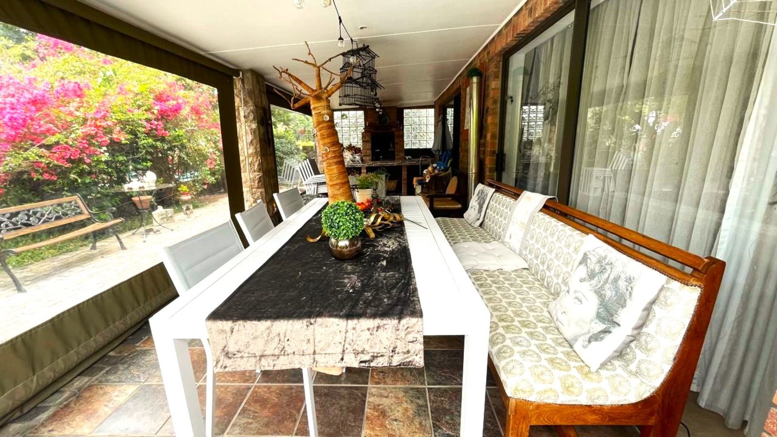 - DINING PATIO and POOL. Opening out from the lounge and snug room this patio is perfectly situated and sized for a large social dining experience. The built in braai and drop down canvas blinds (with windows) complete