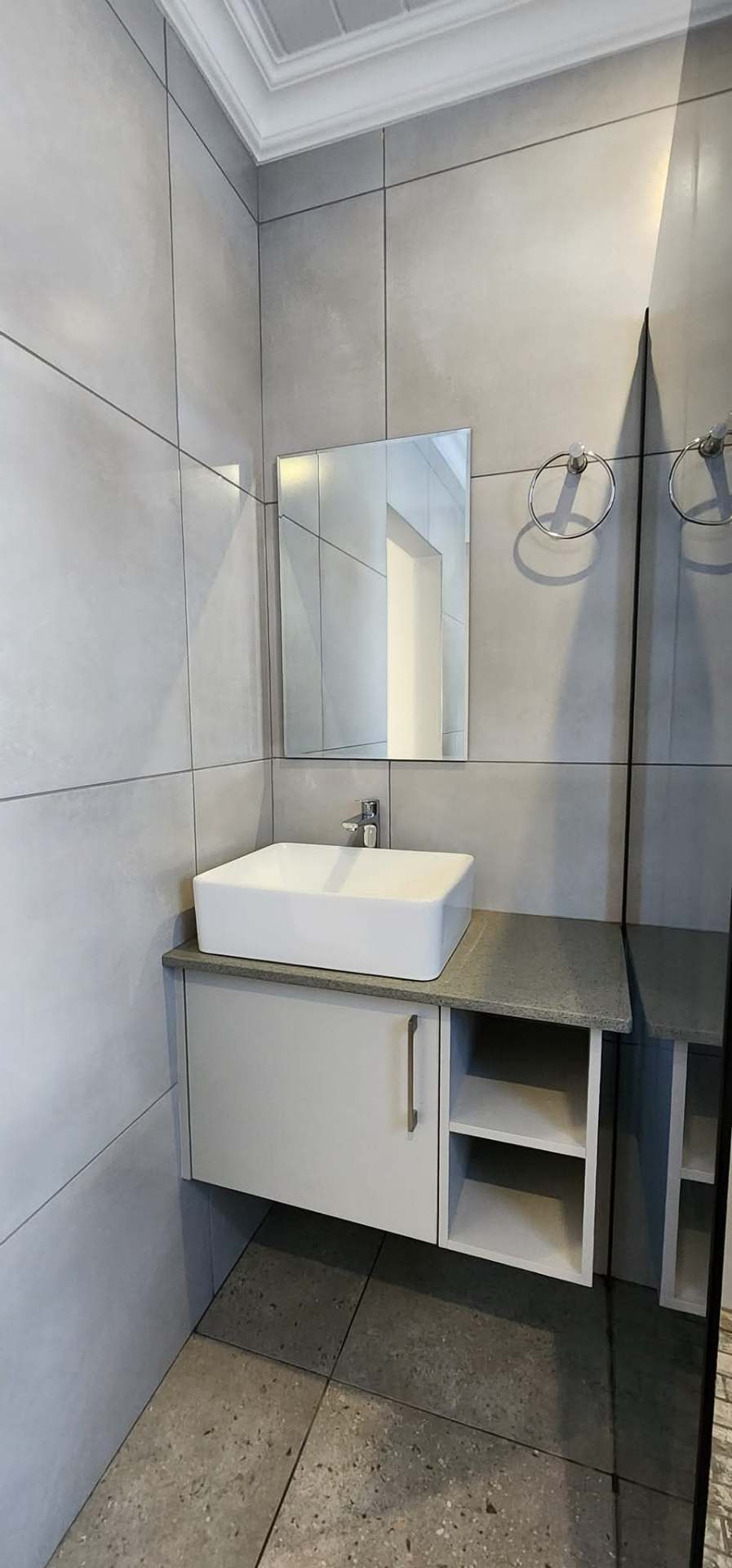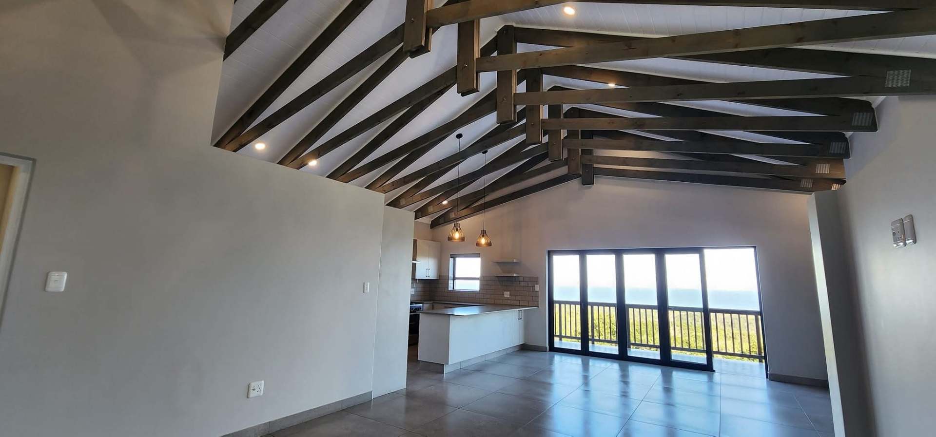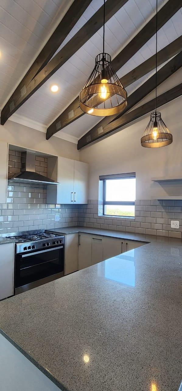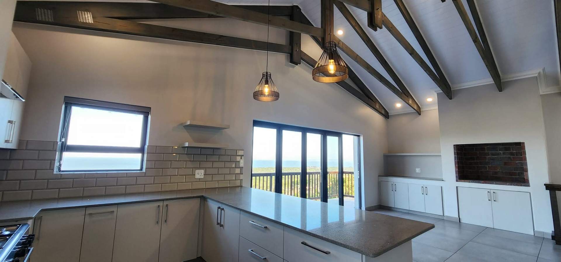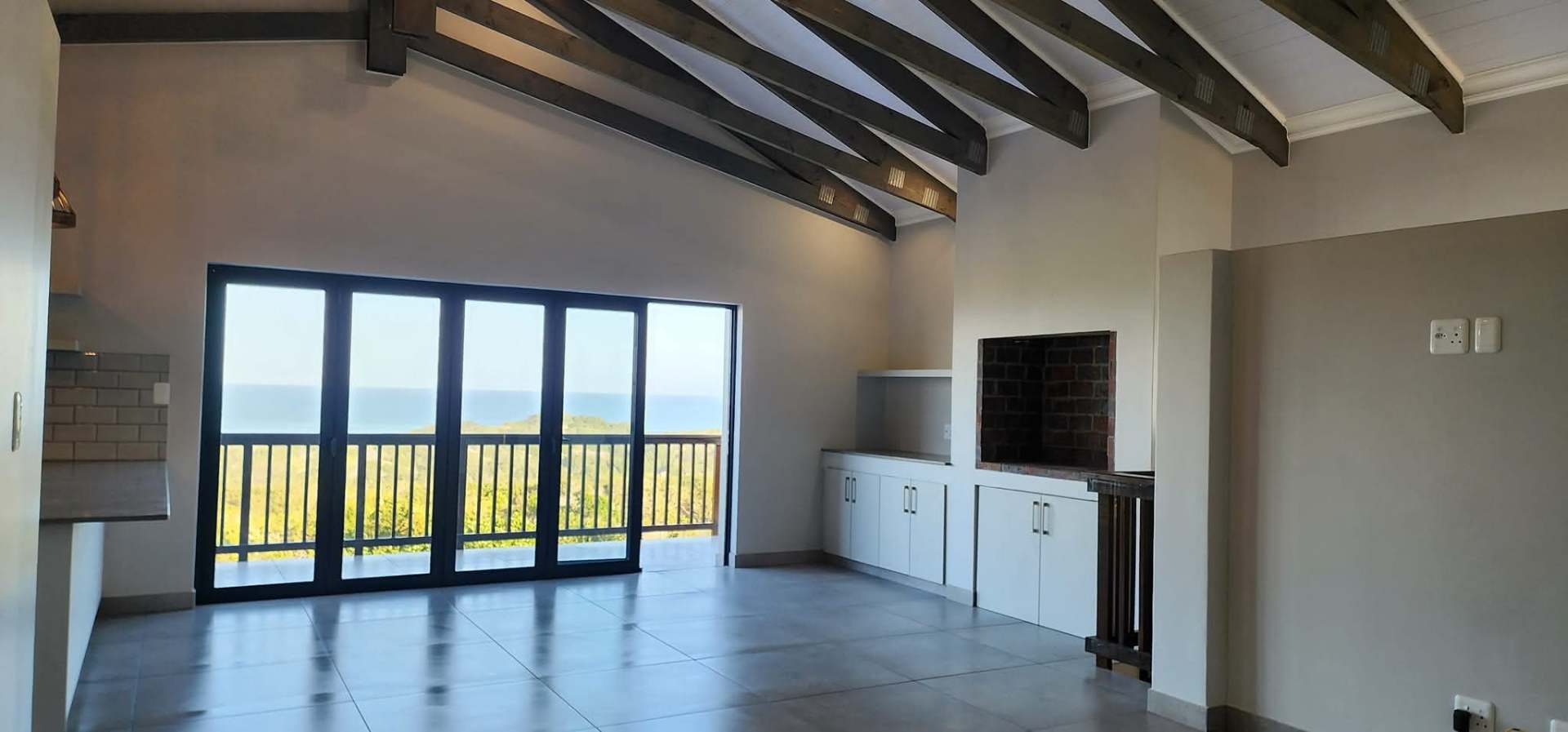 The kitchen is conveniently positioned alongside the living area and boasts an indoor braai with stacking doors opening towards the sea, allowing for partial sea views and year-round entertaining. The north-facing main bedroom is also located on this level, offering sunny winter warmth and comfort, and is complemented by a full en-suite bathroom.