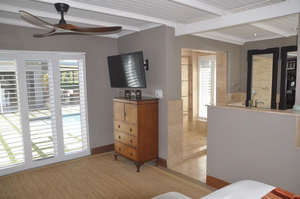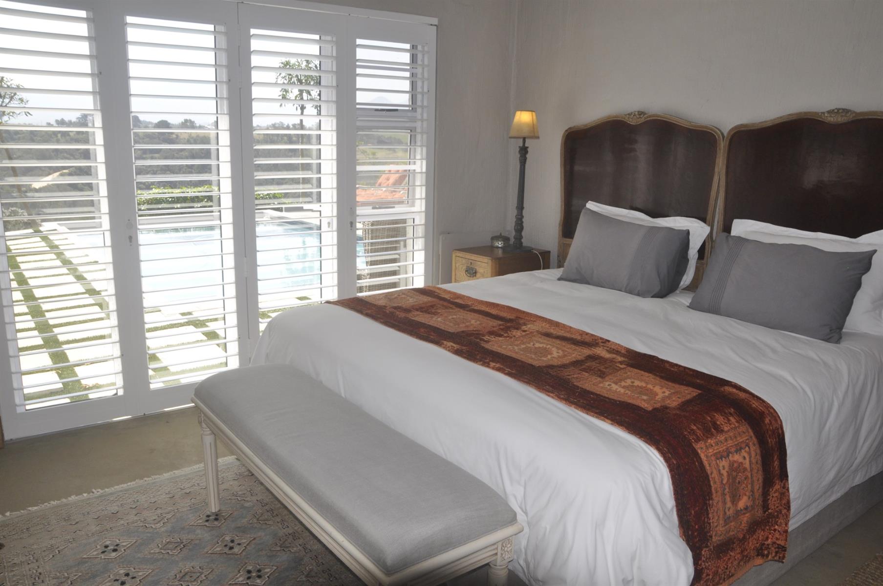 The main home features four spacious bedrooms, each with its own en-suite bathroom and wall-mounted heaters. The master suite opens directly onto the pool area through two separate doors, creating a seamless indoor-outdoor flow. An elegant entrance hall welcomes you into the open-plan living spaces, which include the dining room, kitchen, lounge and entertainment areas, all centered around a cozy open fireplace.