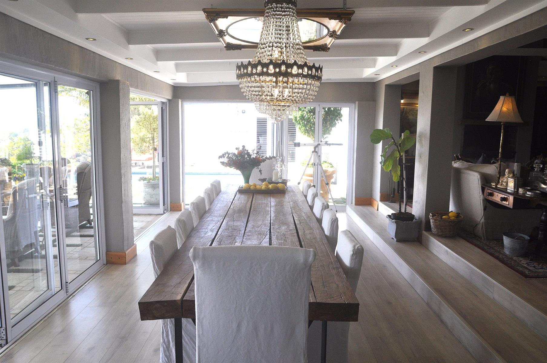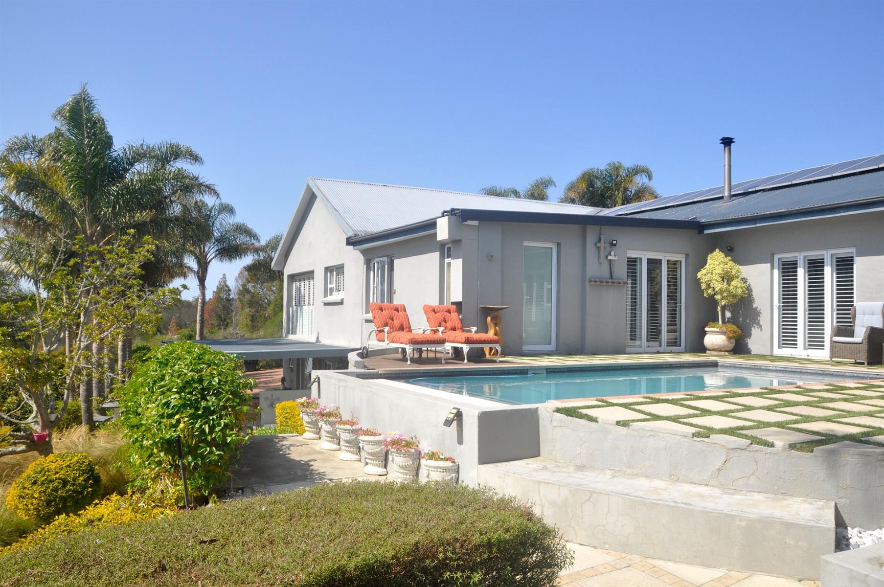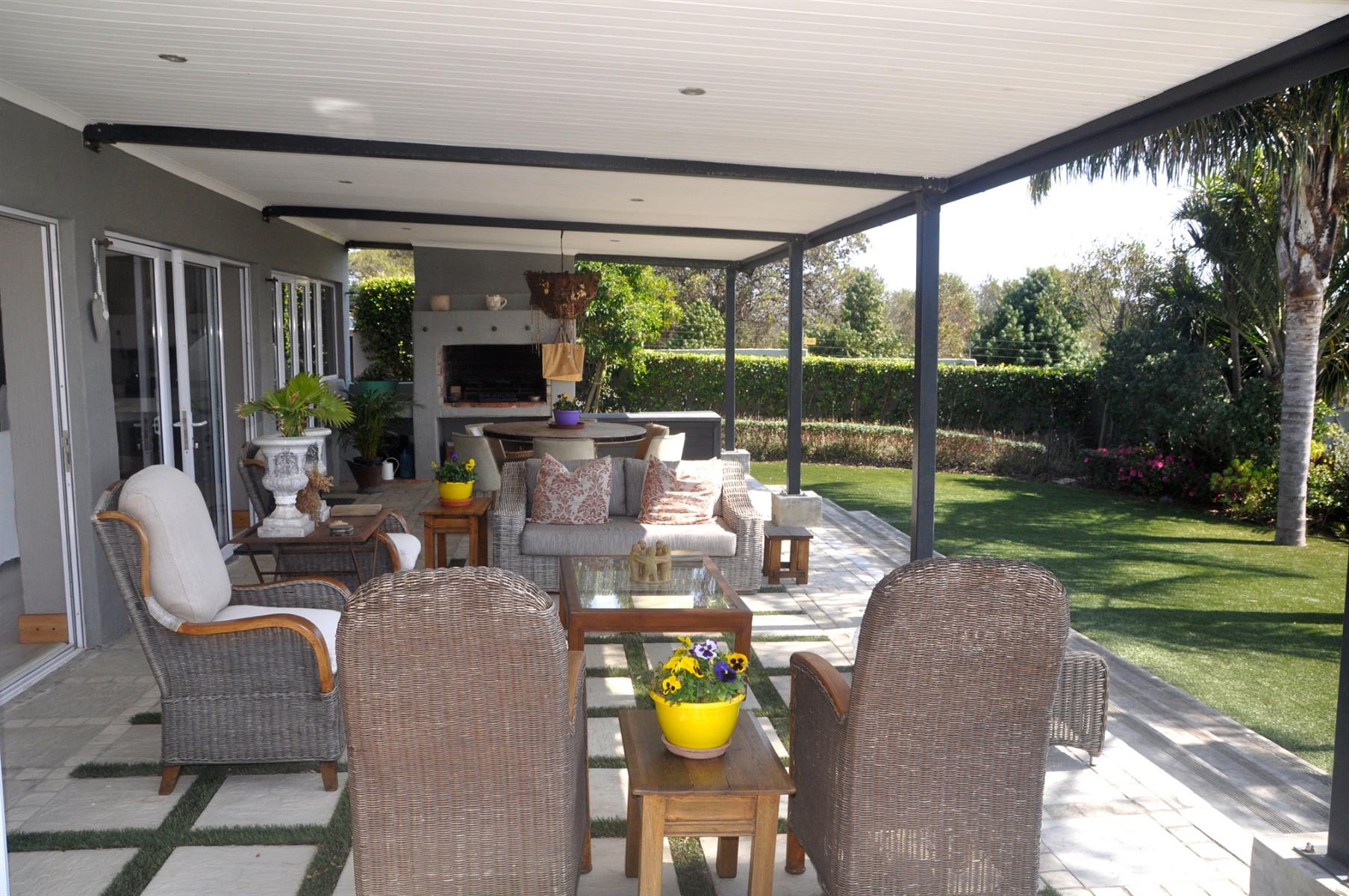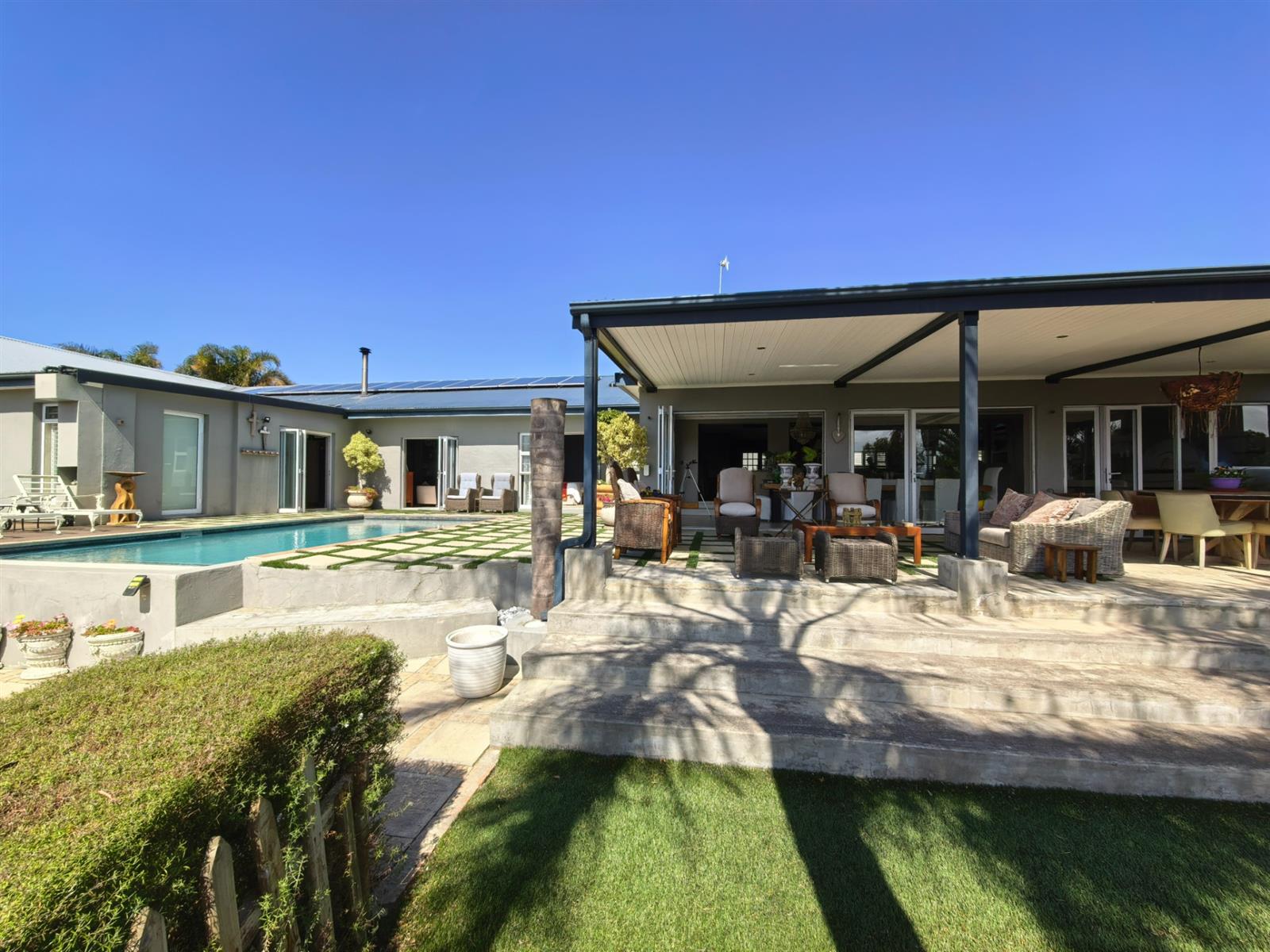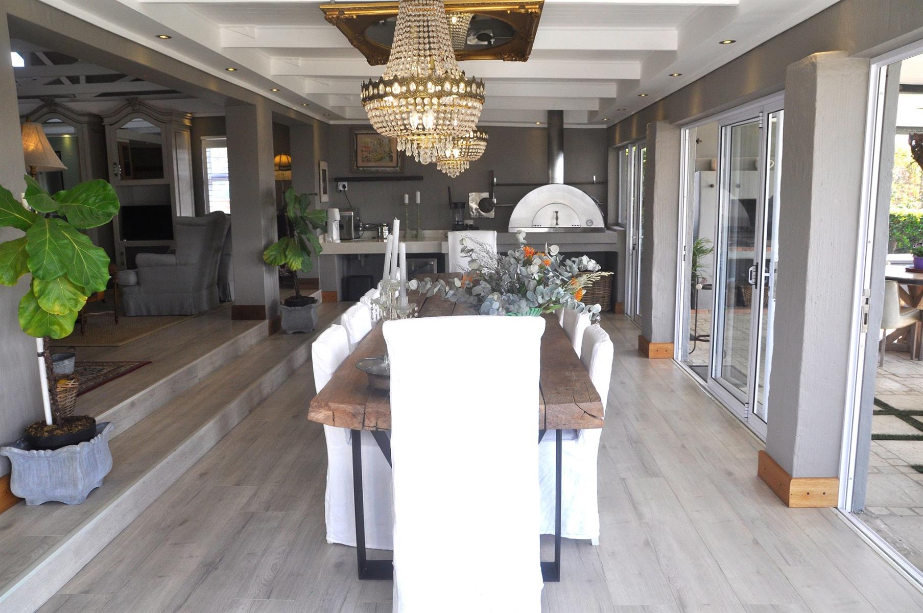 Entertainment is effortless with a heated sparkling pool, complete with a remote-controlled cover, and a spacious patio fitted with a built-in braai—perfect for gatherings with family and friends.