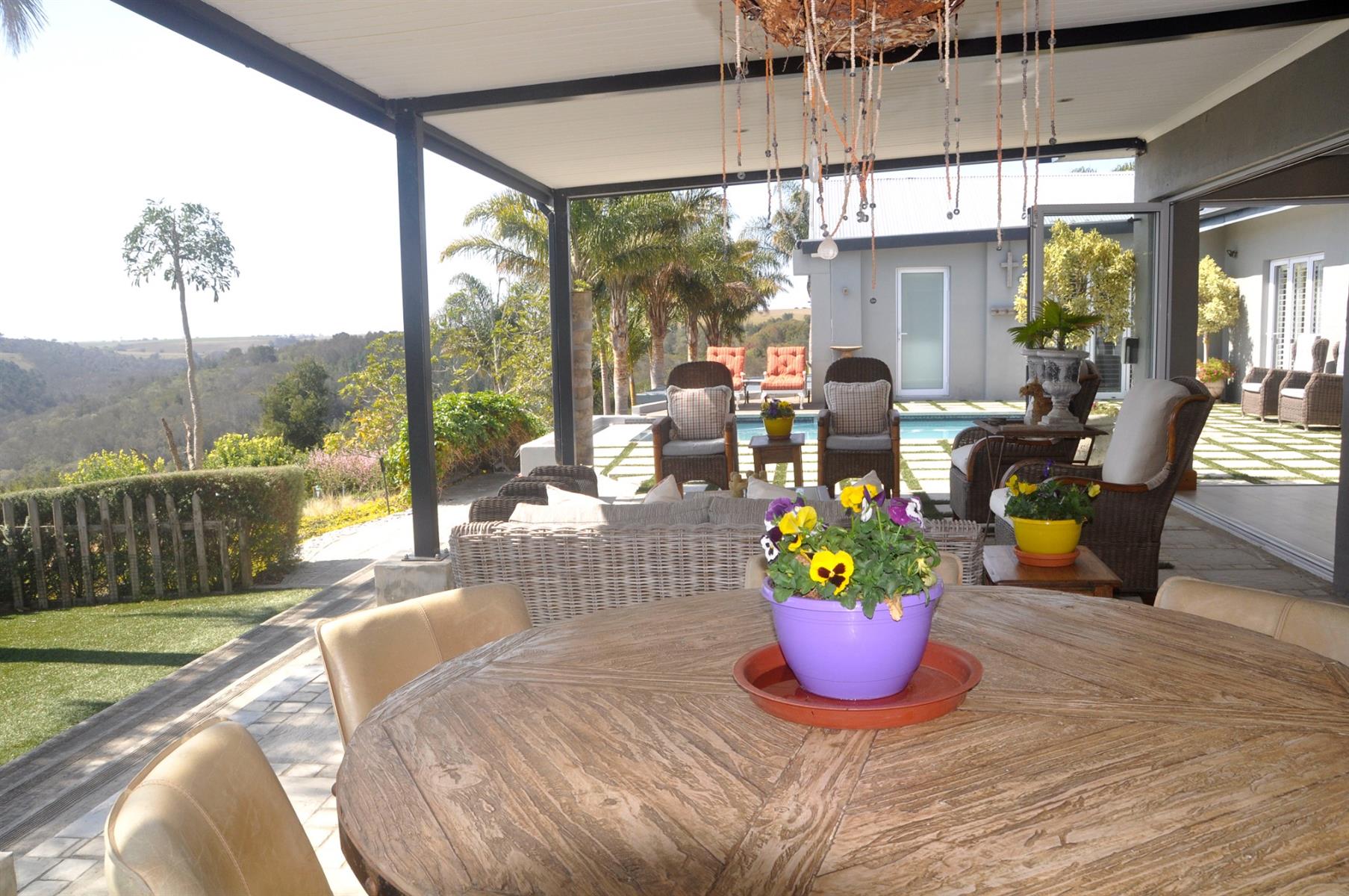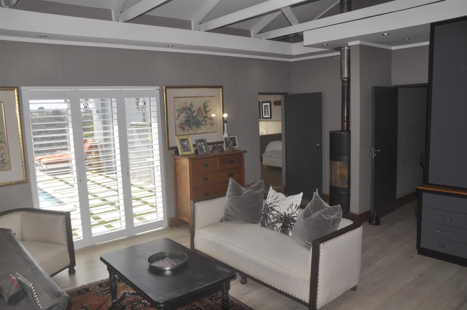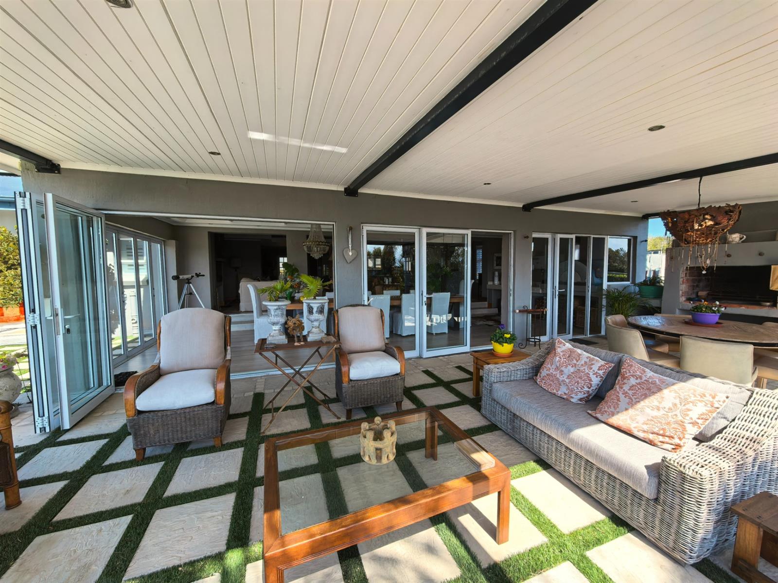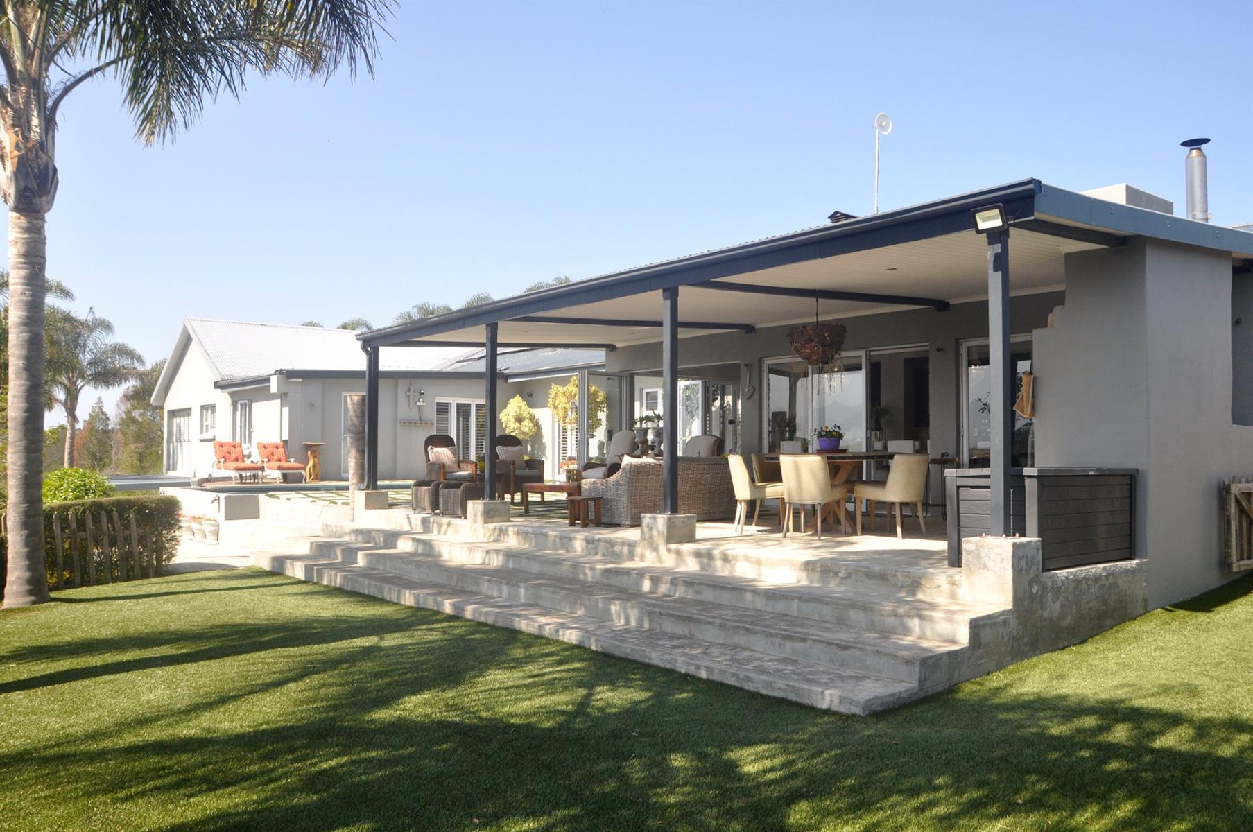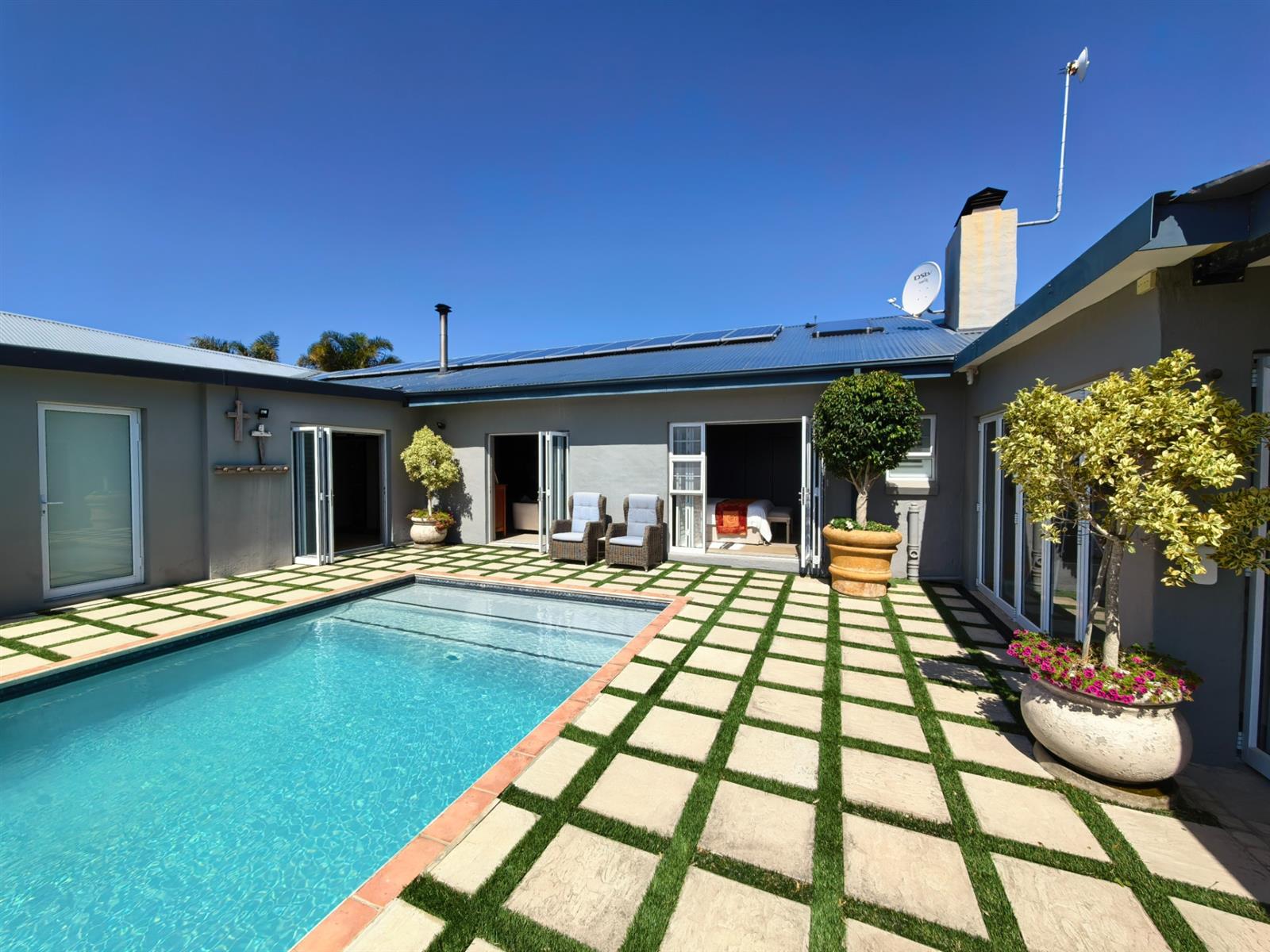 Entertainment is effortless with a heated sparkling pool, complete with a remote-controlled cover, and a spacious patio fitted with a built-in braai—perfect for gatherings with family and friends.