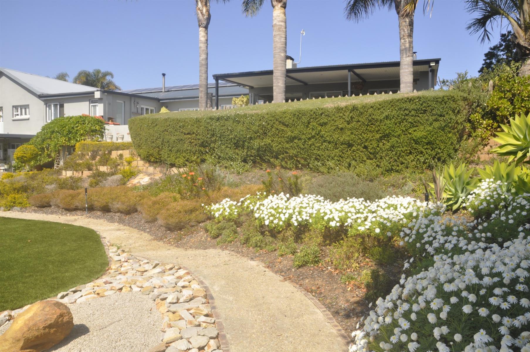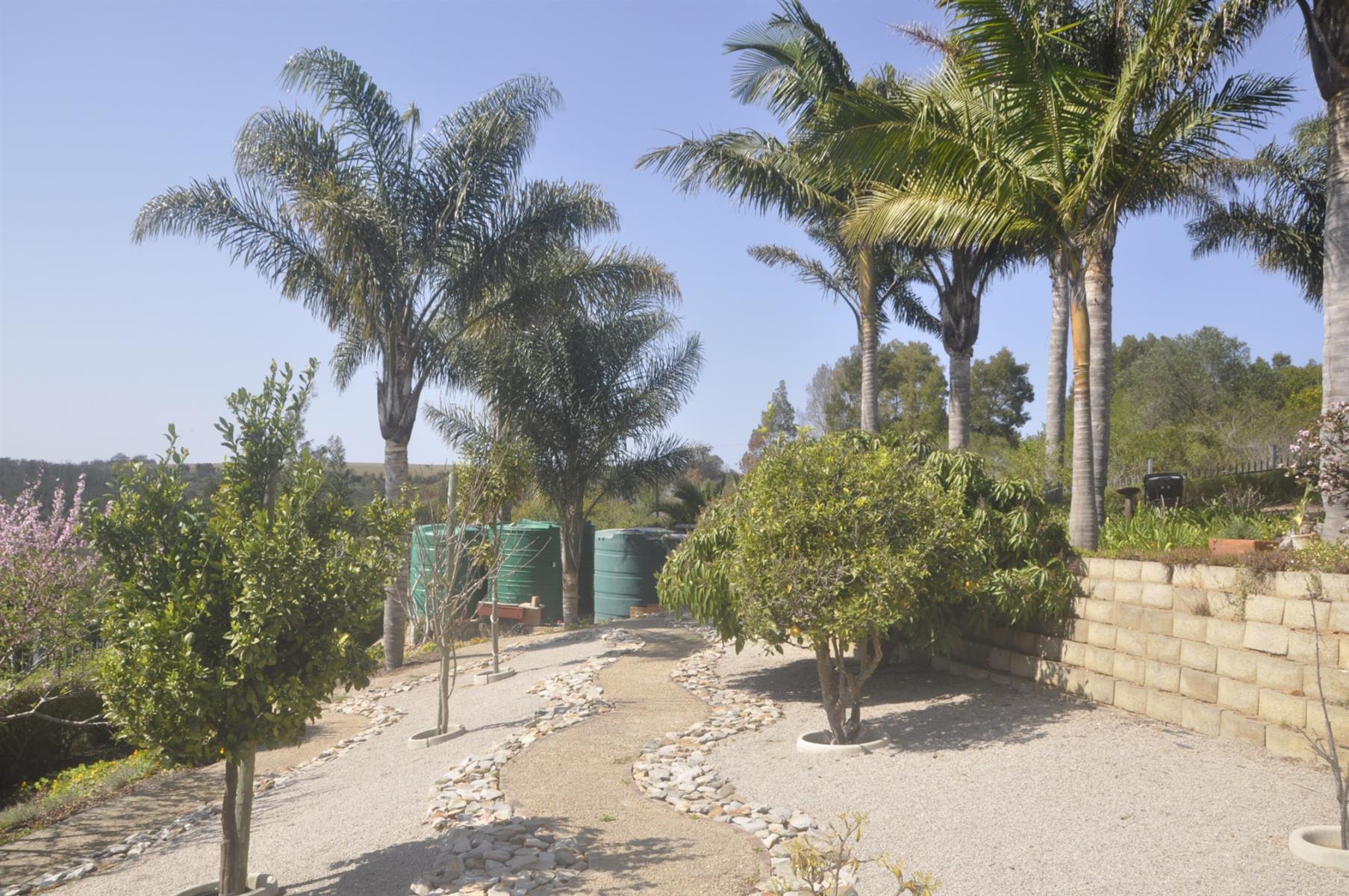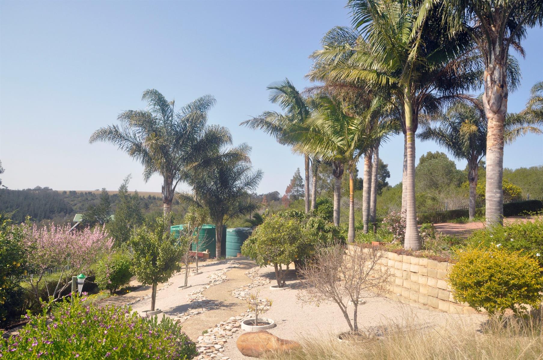 Outdoors, the landscaped garden is sustained by a fully automated sprinkler system connected to six 5,000-litre water tanks, ensuring cost savings and eco-friendly living. The grounds include numerous fruit trees, a brick-built vegetable garden, and a garden shed beneath the home complete with a toilet.