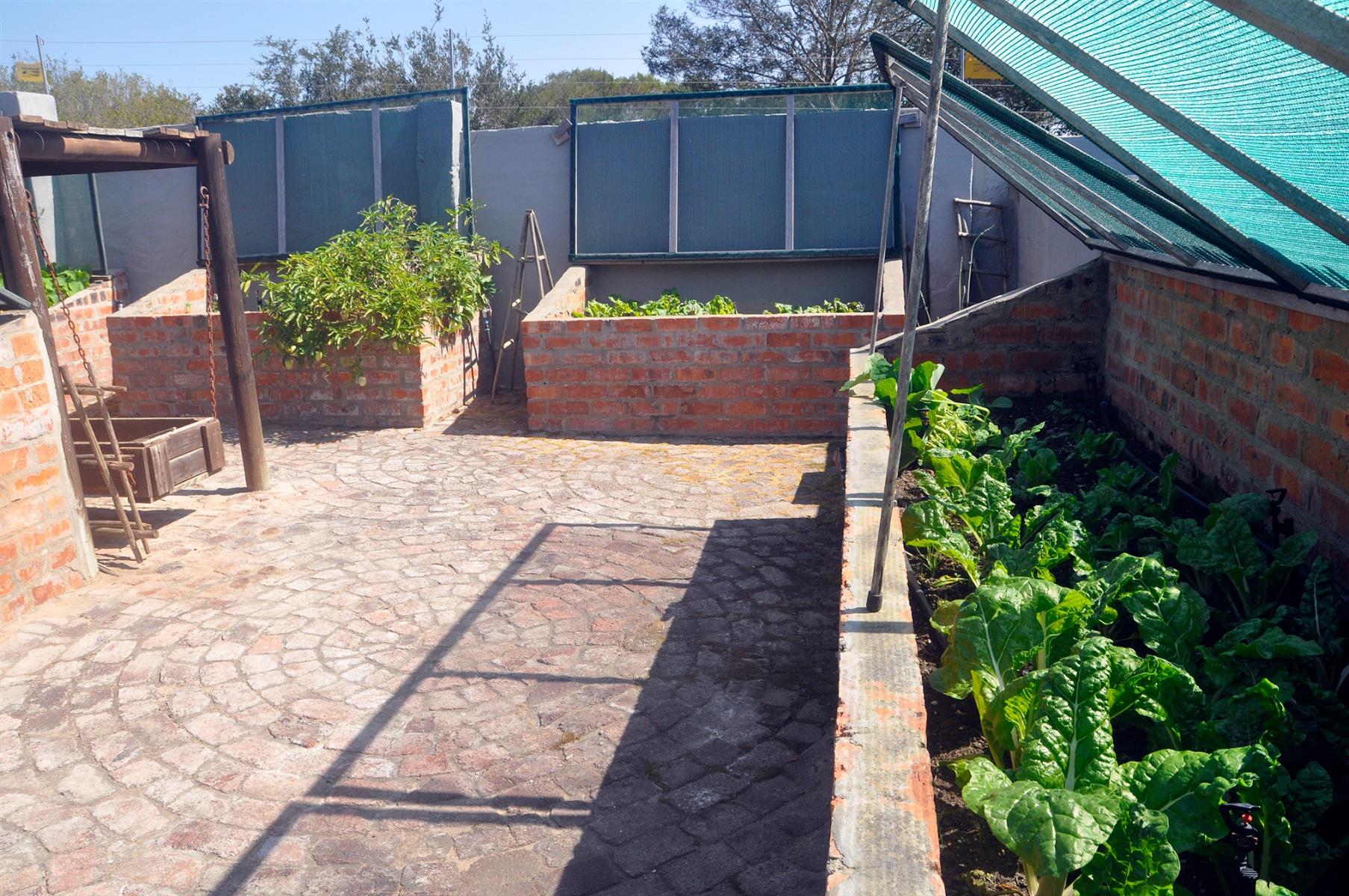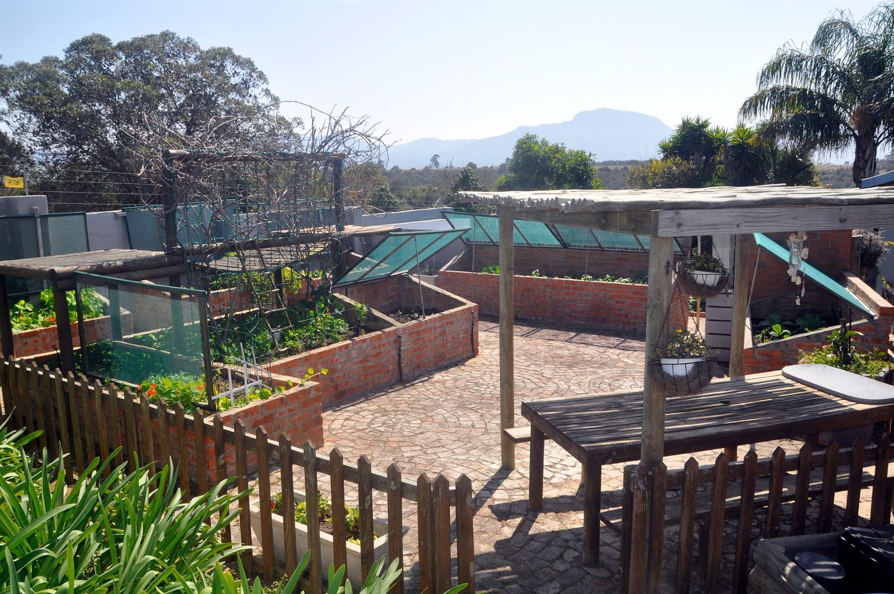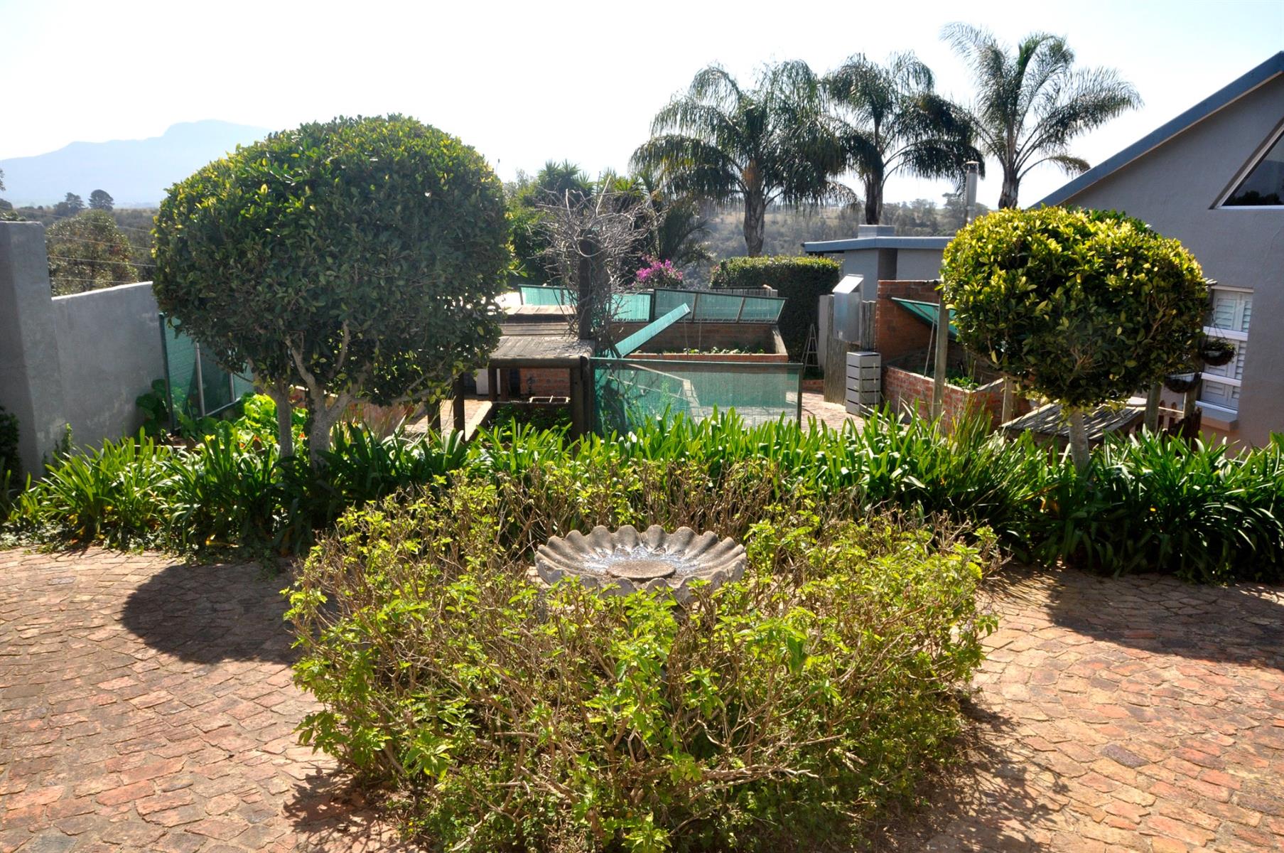 Outdoors, the landscaped garden is sustained by a fully automated sprinkler system connected to six 5,000-litre water tanks, ensuring cost savings and eco-friendly living. The grounds include numerous fruit trees, a brick-built vegetable garden, and a garden shed beneath the home complete with a toilet.
