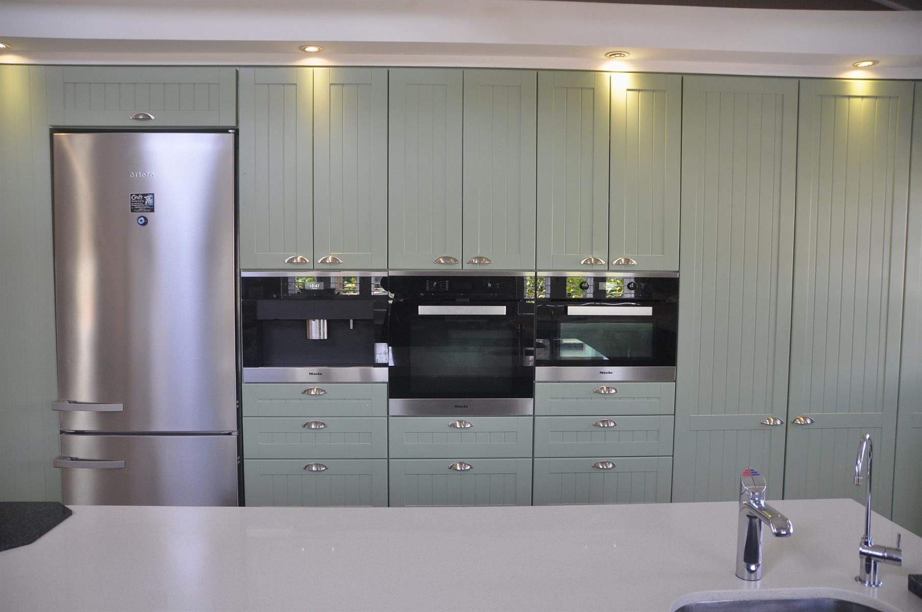 The kitchen is a chef’s dream, fully fitted with a premium Miele range that includes a built-in coffee machine, oven, convection oven, fridge, and Zip filtered water system. A dishwasher, gas hob and extractor fan complete this stylish space. For those who work from home, a private study with a built-in Austroflamm fireplace offers both warmth and sophistication. A guest loo adds convenience for visitors.