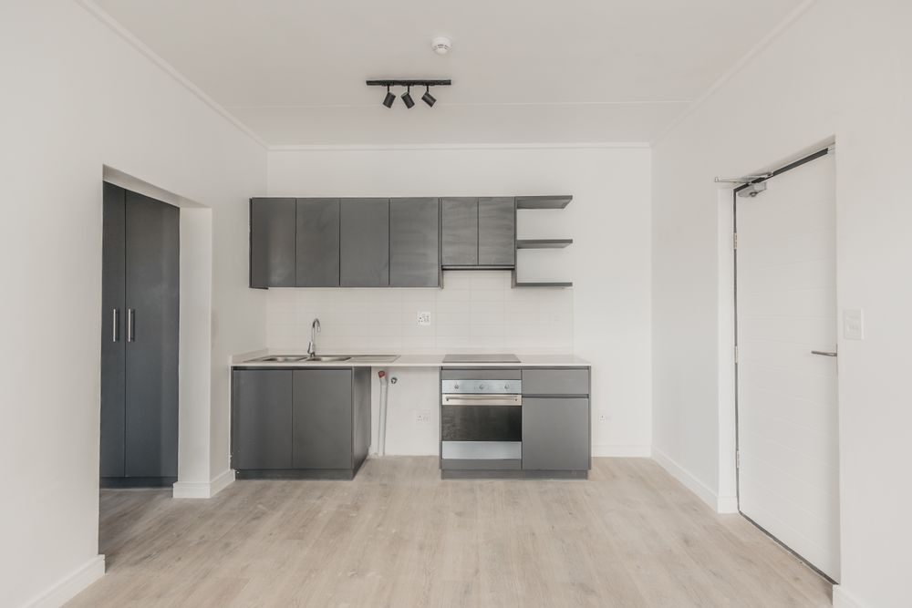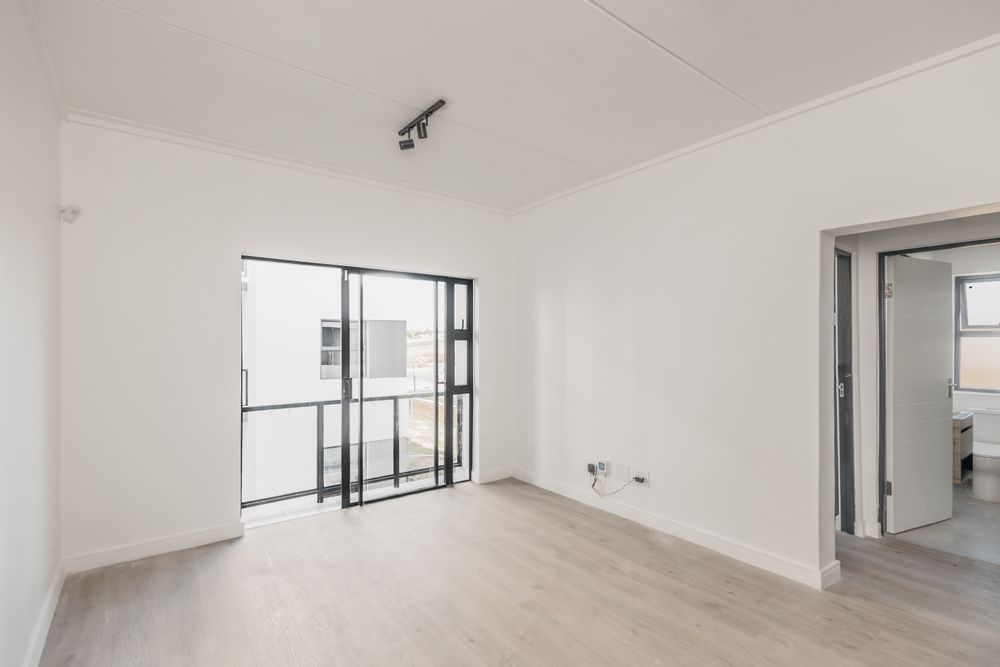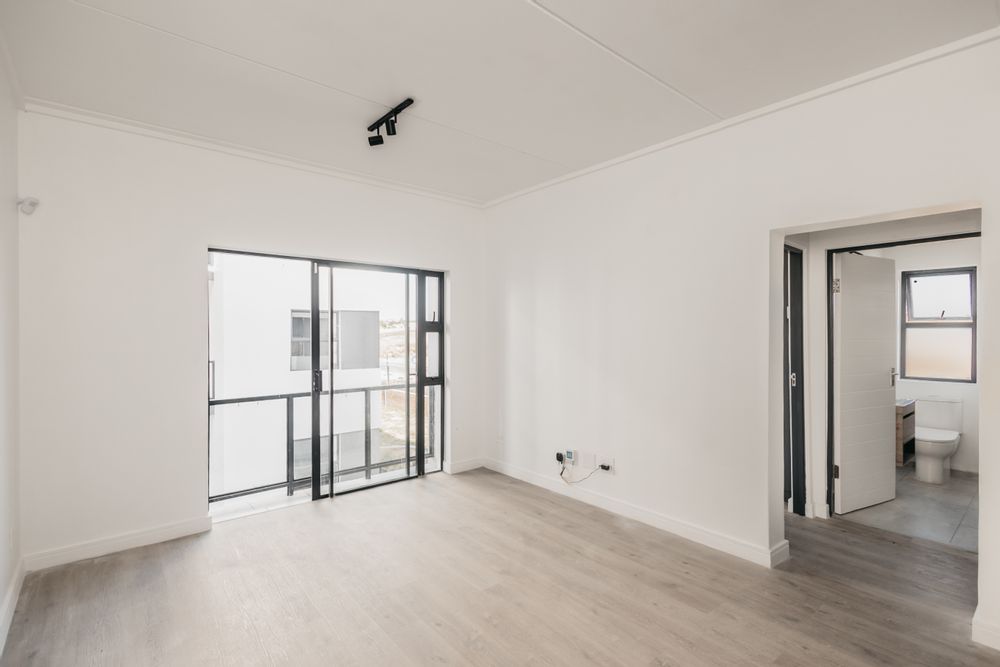 This unit features an open-plan modern kitchen with quartz countertops, flowing seamlessly into the lounge, which opens onto a balcony with a built-in braai—perfect for relaxing or entertaining. The spacious bedroom comes with built-in cupboards, while the modern bathroom includes a shower, toilet, and basin.