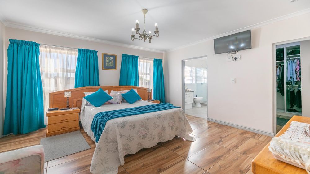 The spacious living room, accentuated by exposed beams, seamlessly connects to the dining area and a well-appointed kitchen. A walk-in pantry and separate scullery provide ample storage space for your convenience. The indoor braai area, just off the main lounge, provides a second entertainment area. With stack doors opening from the living room, a covered patio and charming garden can be enjoyed.