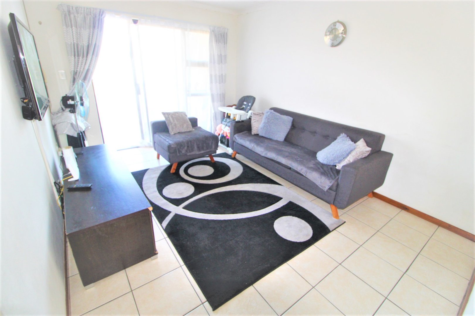 The home features two well-sized bedrooms with built-in cupboards and carpets, a modern open-plan kitchen with counter space, and a bright lounge that flows seamlessly through sliding doors onto a private balcony — perfect for morning coffee or evening relaxation. A full family bathroom.