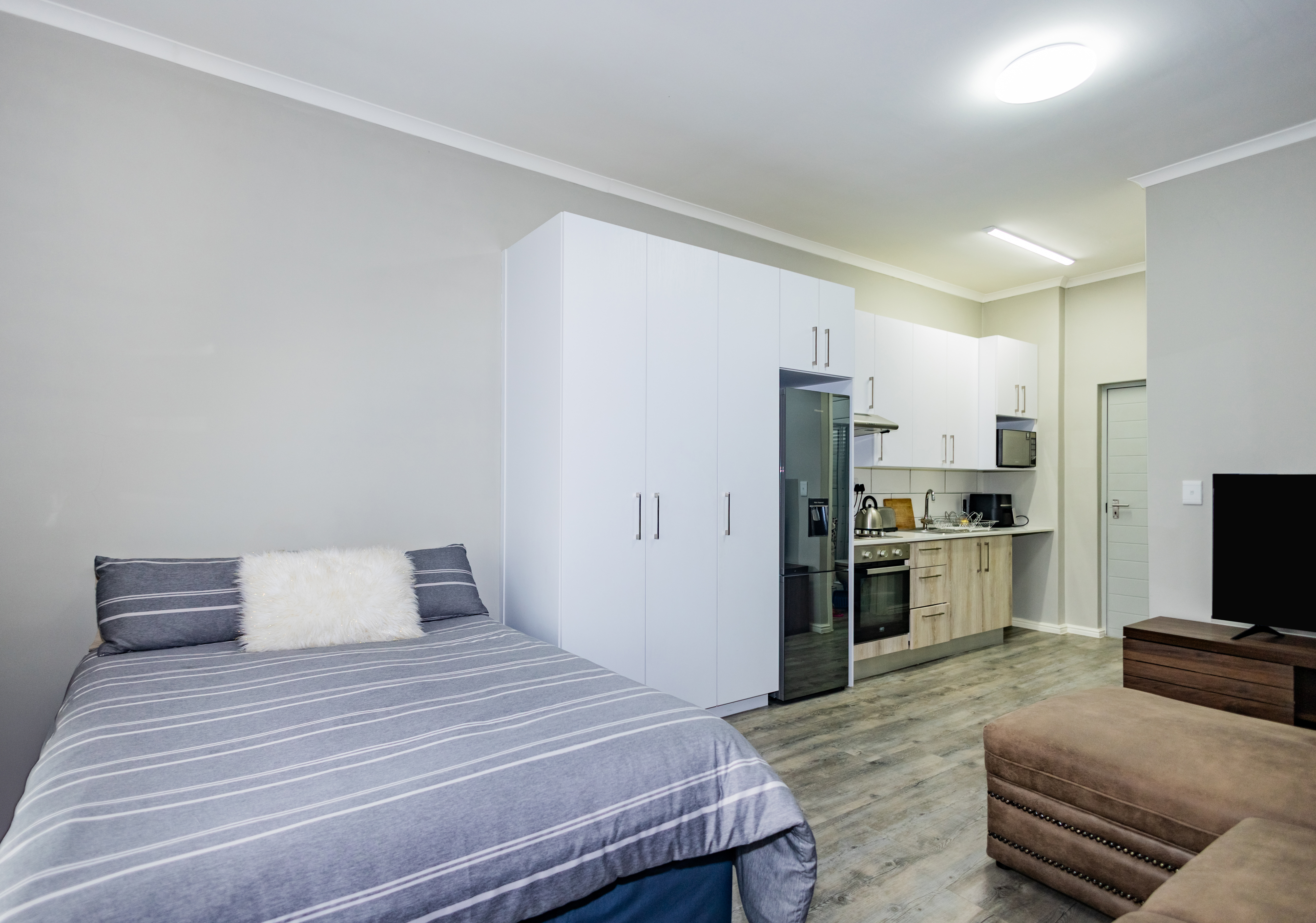 Step into modern estate living with this bright second-floor studio apartment – ideal for first-time buyers, students, or savvy investors. High ceilings and quality vinyl flooring throughout create a spacious, contemporary feel. The sleek open-plan kitchen features white stone countertops and eye-catching subway tile finishes, while the bathroom offers a trendy, modern design with a shower.