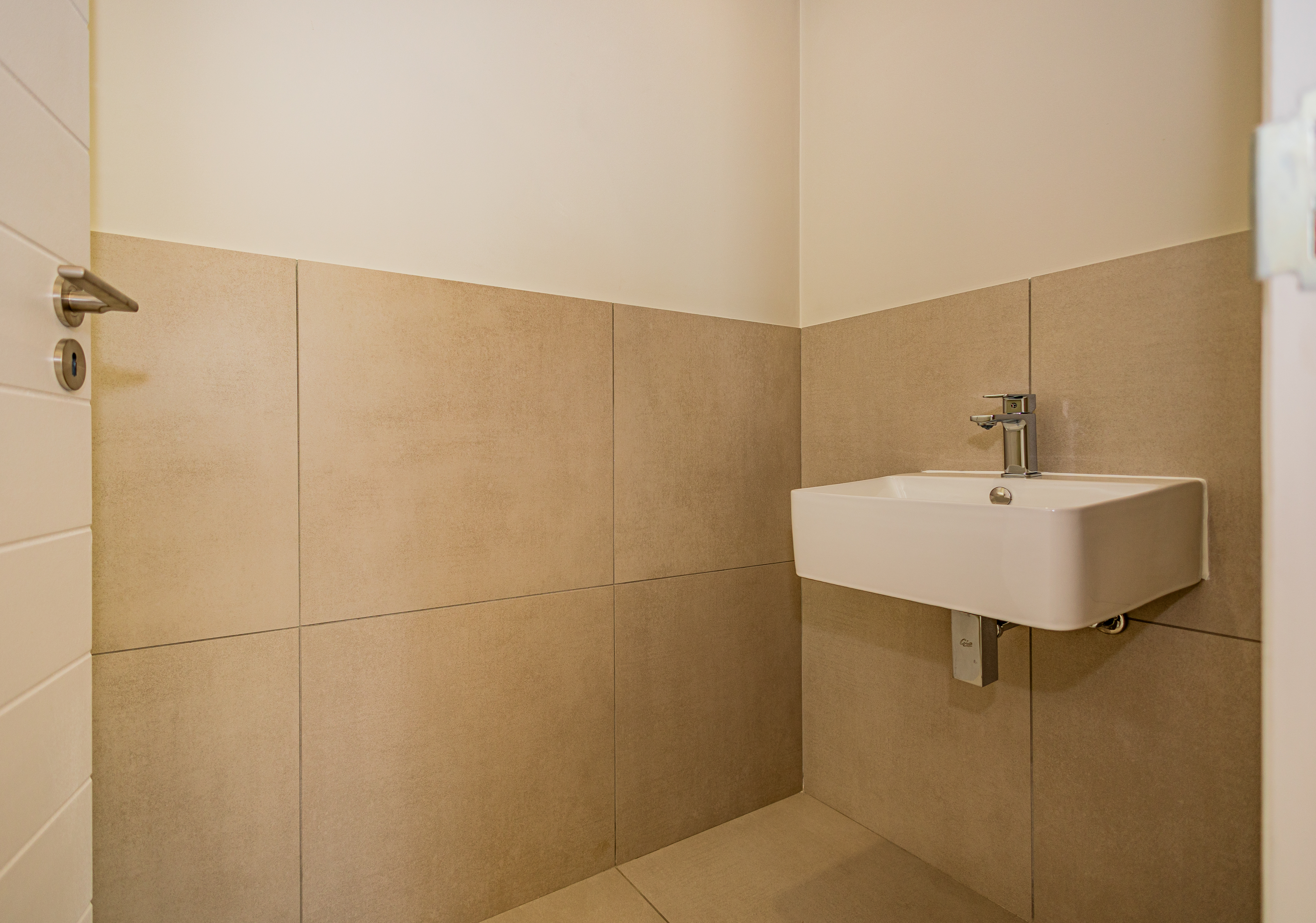 A guest toilet on the lower level adds everyday convenience, keeping the flow of the home Up the staircase, the double-storey design truly comes alive. Two beautifully lit bedrooms await, both filled with soft natural light and framed by the views of the estate. The full bathroom upstairs serves the bedrooms with comfort and simplicity — perfect for young couples, small families, or first-time buyers who want an easy, modern lifestyle.