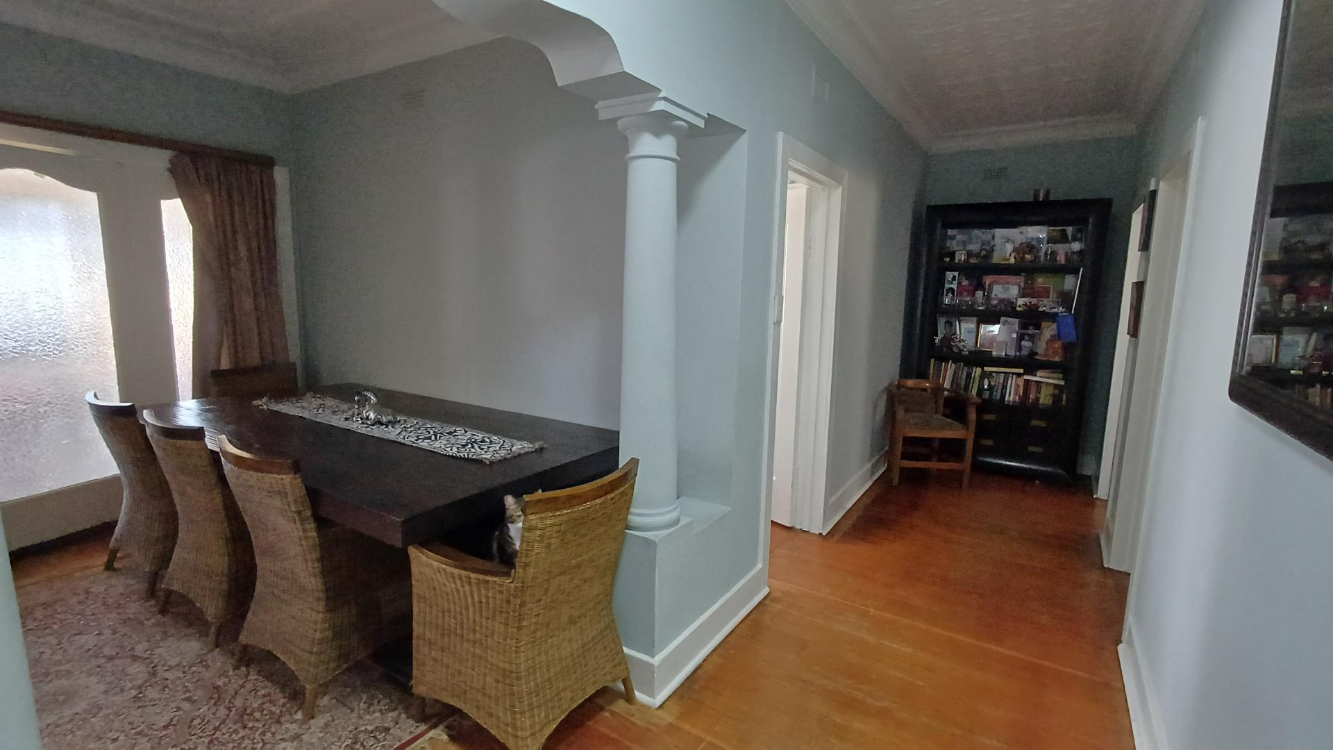 The spacious, sunny lounge has wooden floors, beautifully preserved pressed ceilings and a retro fireplace, ideal for those cold winter days. The dining room also has wooden floors and pressed ceilings with statement pillars leading to the passageway.