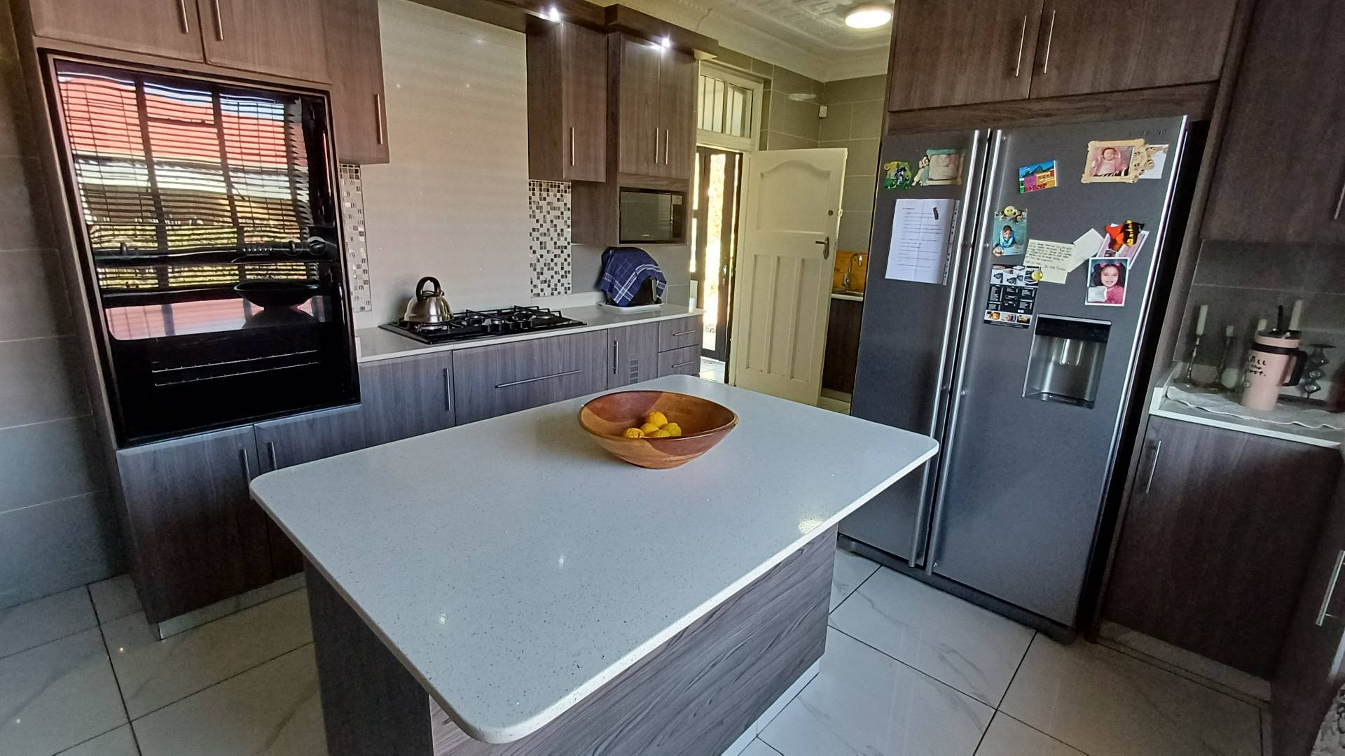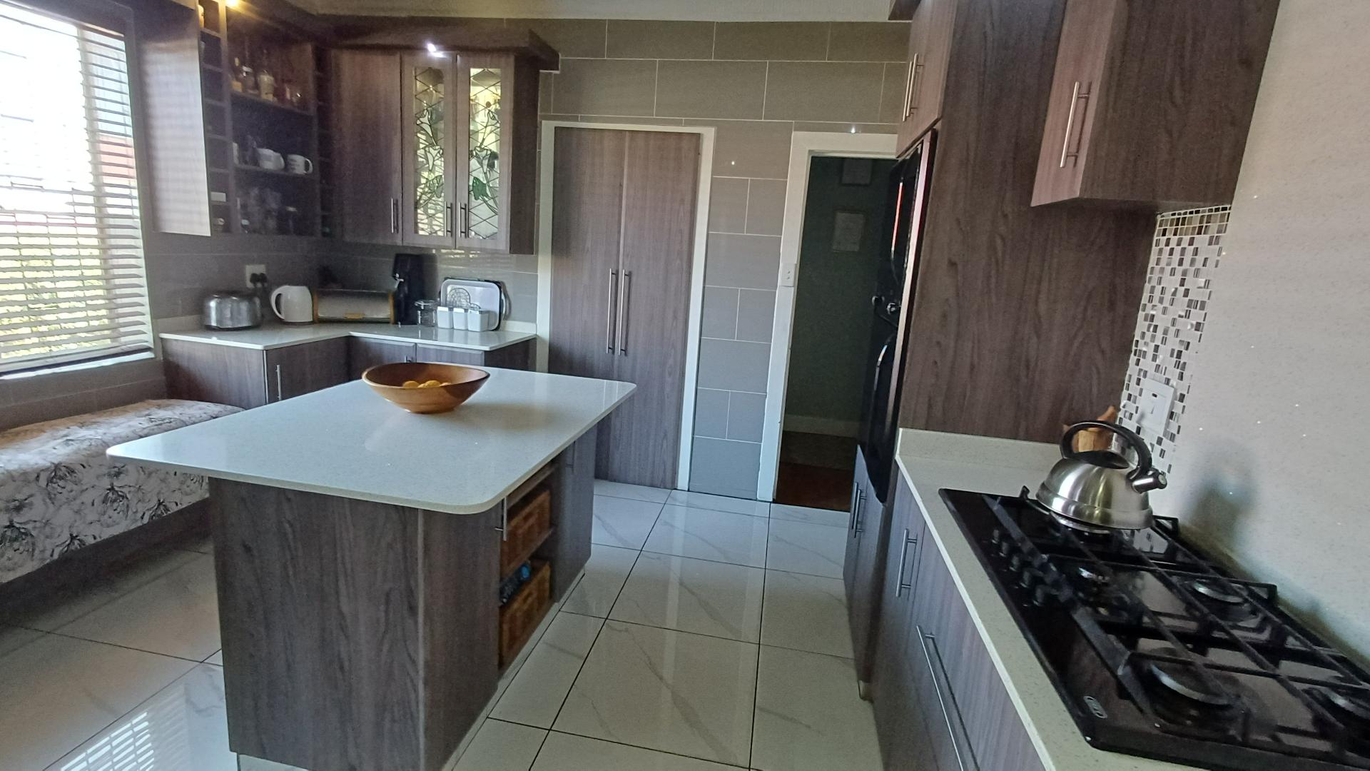 The modern, well designed kitchen is every house-wife's dream. It features a centre island, gas hob and walk-in pantry. All appliances are catered for in the kitchen, including a separate scullery and laundry room. Guests are also catered for in the kitchen - they can sit on the bench, in front of the window, chatting while you prepare a feast.
