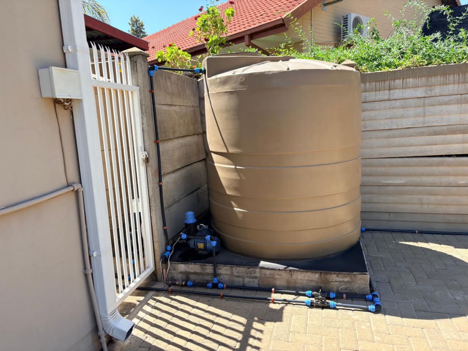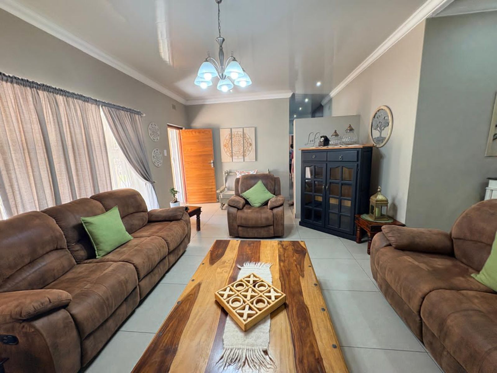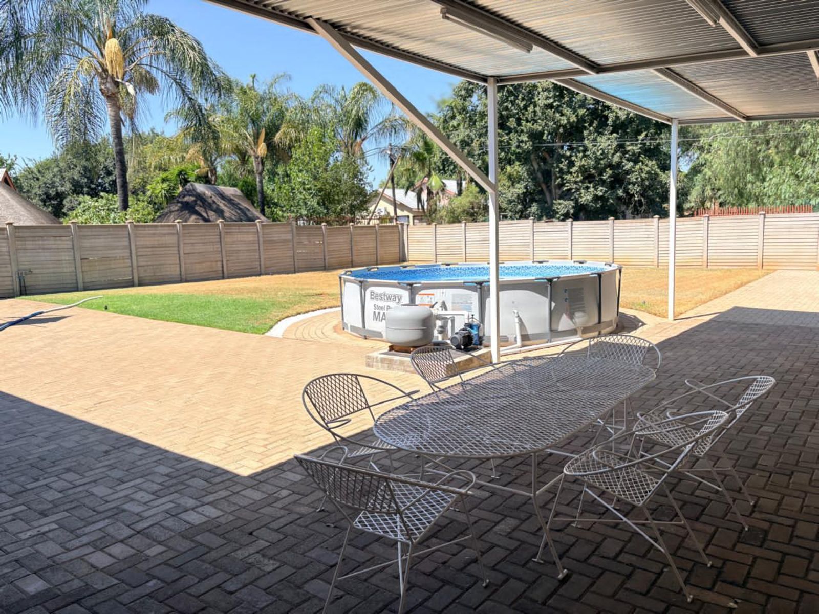 An entertainment area with a built-in braai enhances the home’s appeal, perfect for relaxed gatherings. The established garden is supported by an irrigation system, two JoJo tanks, and a borehole, ensuring efficient water management. A swimming pool completes the outdoor offering.
